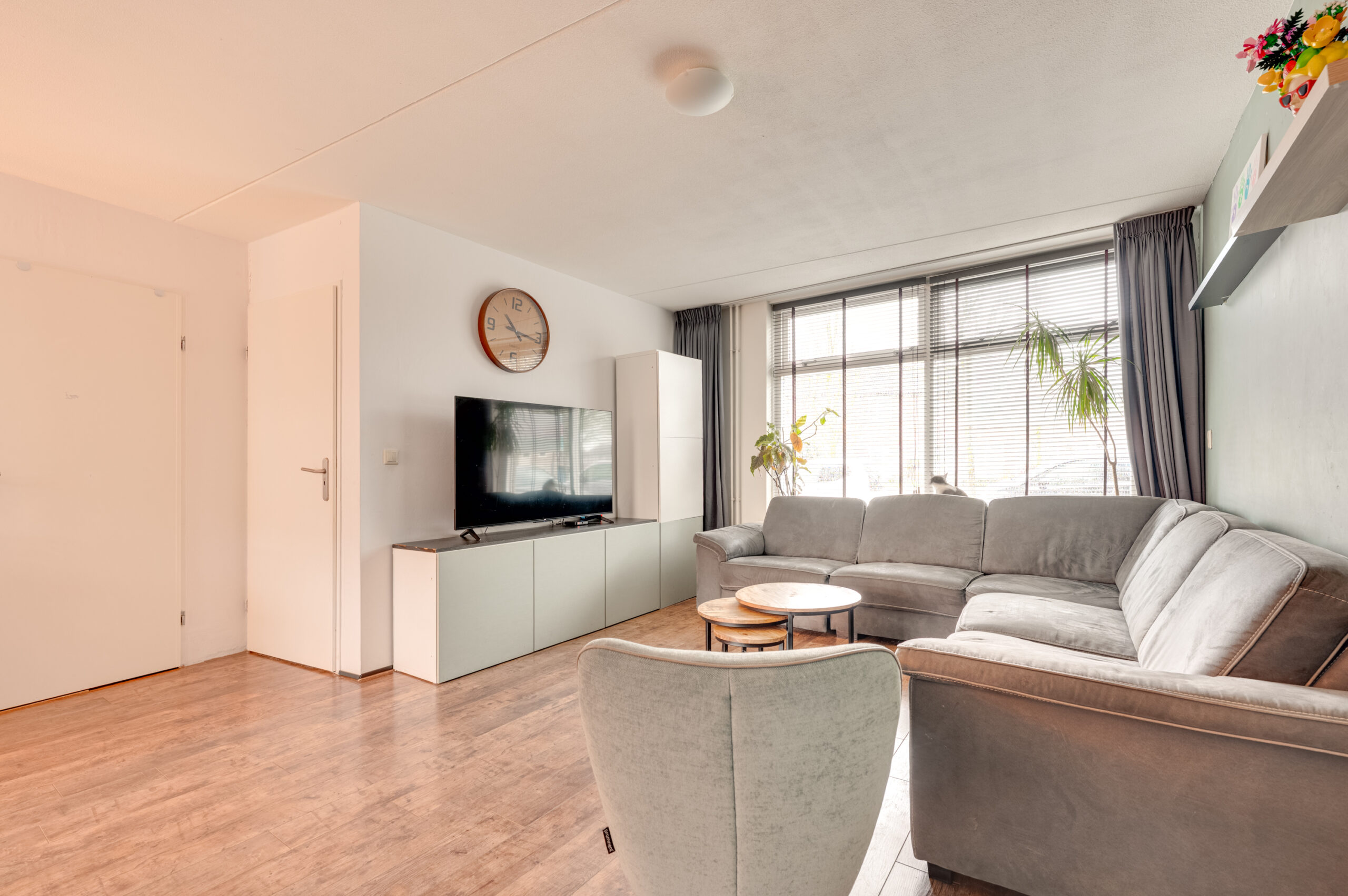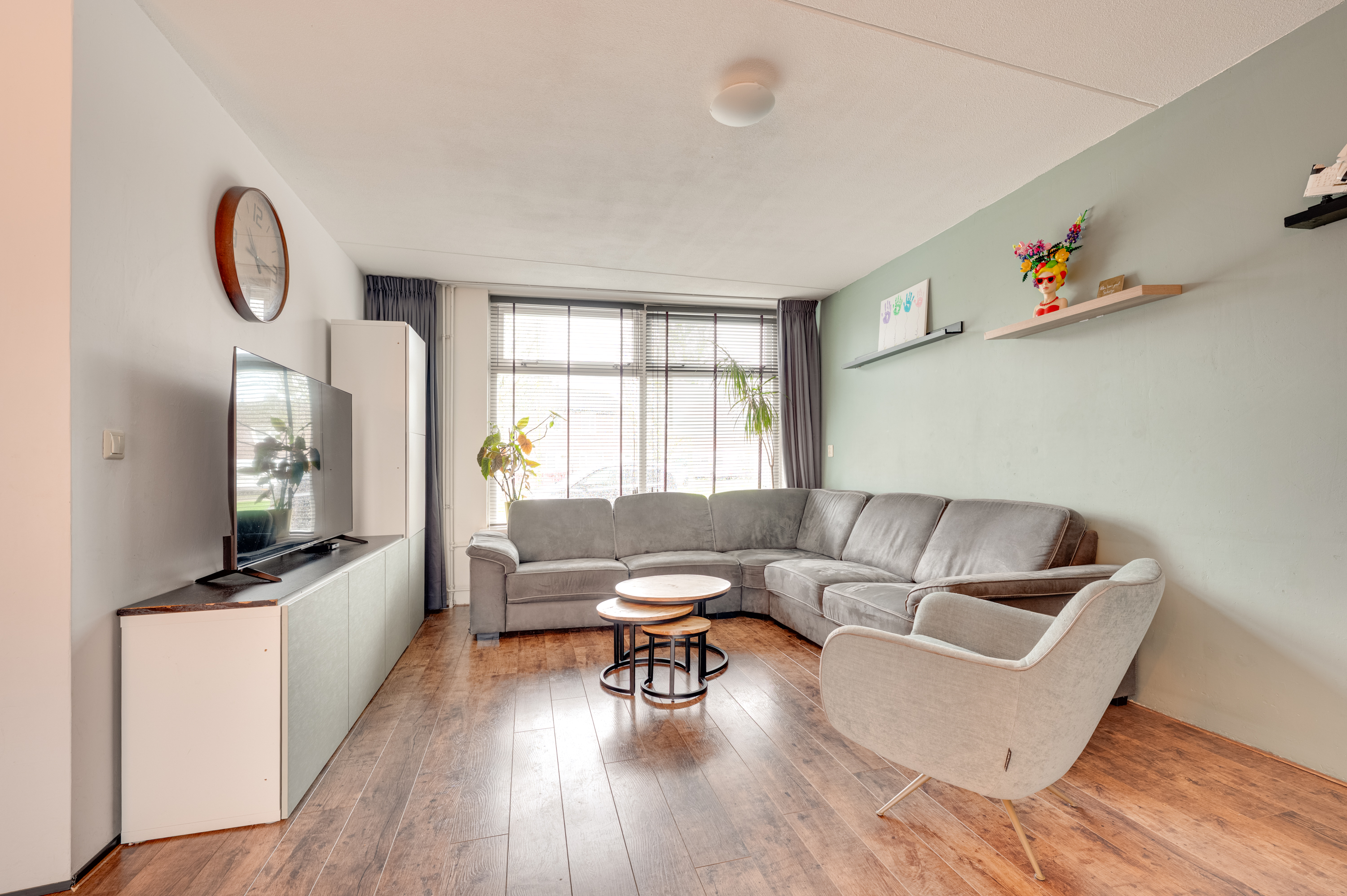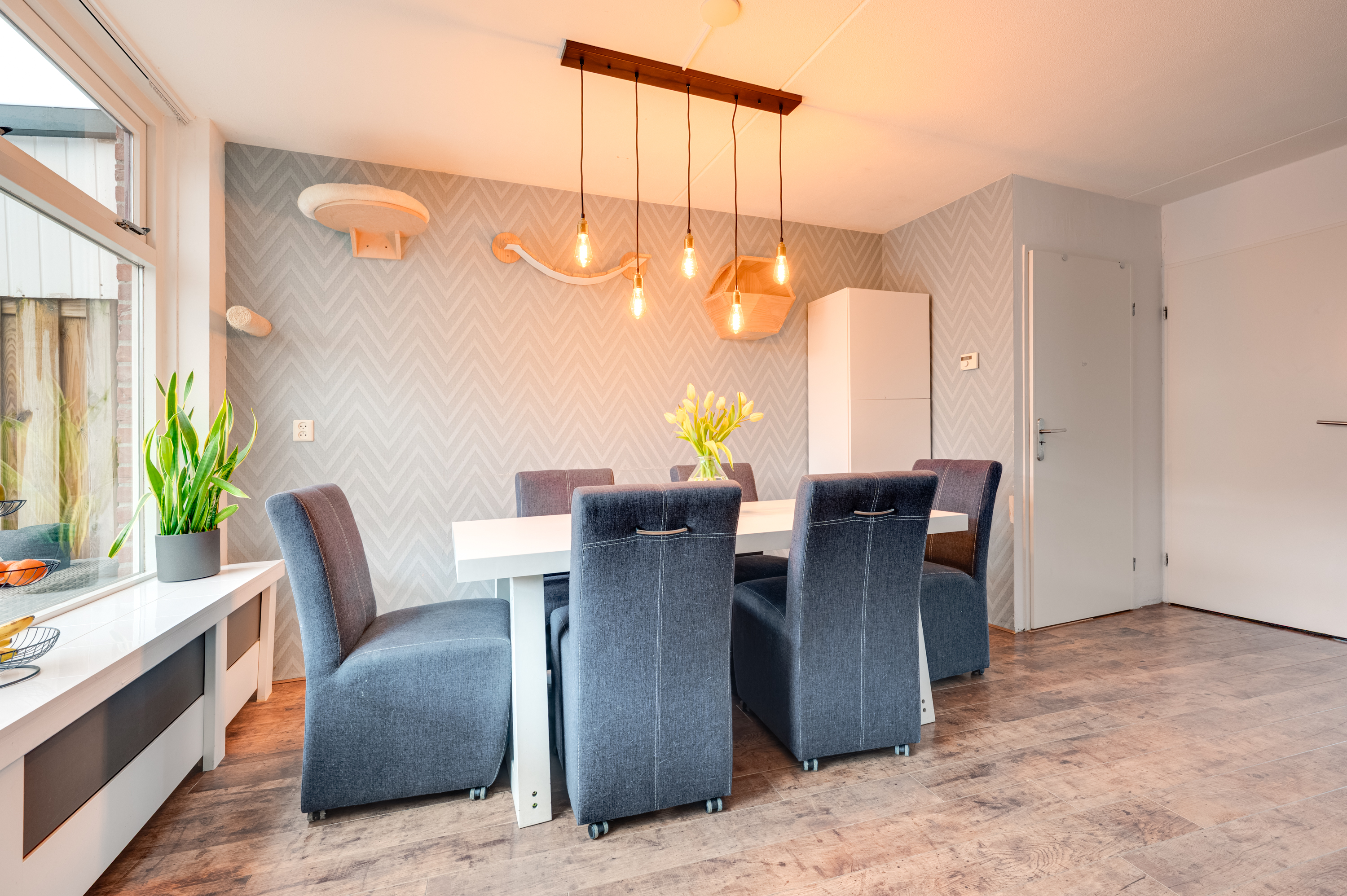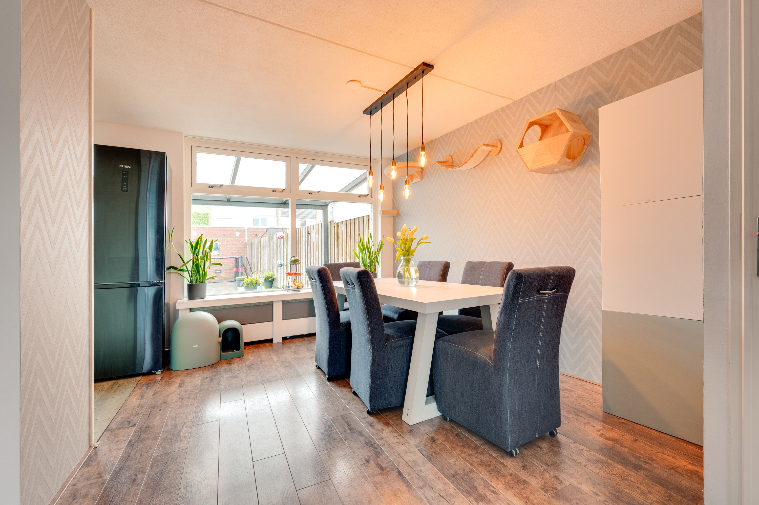 De lichte woonkamer ligt aan de voorzijde van het huis. Aan de achterzijde vind je de eetkamer, met mooi zicht op de achtertuin. In de woonkamer bevindt zich een praktische trapkast voor extra bergruimte. De laminaatvloer geeft de ruimte een verzorgde en rustige uitstraling. Vanuit de woonkamer loop je door naar de keuken.