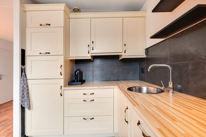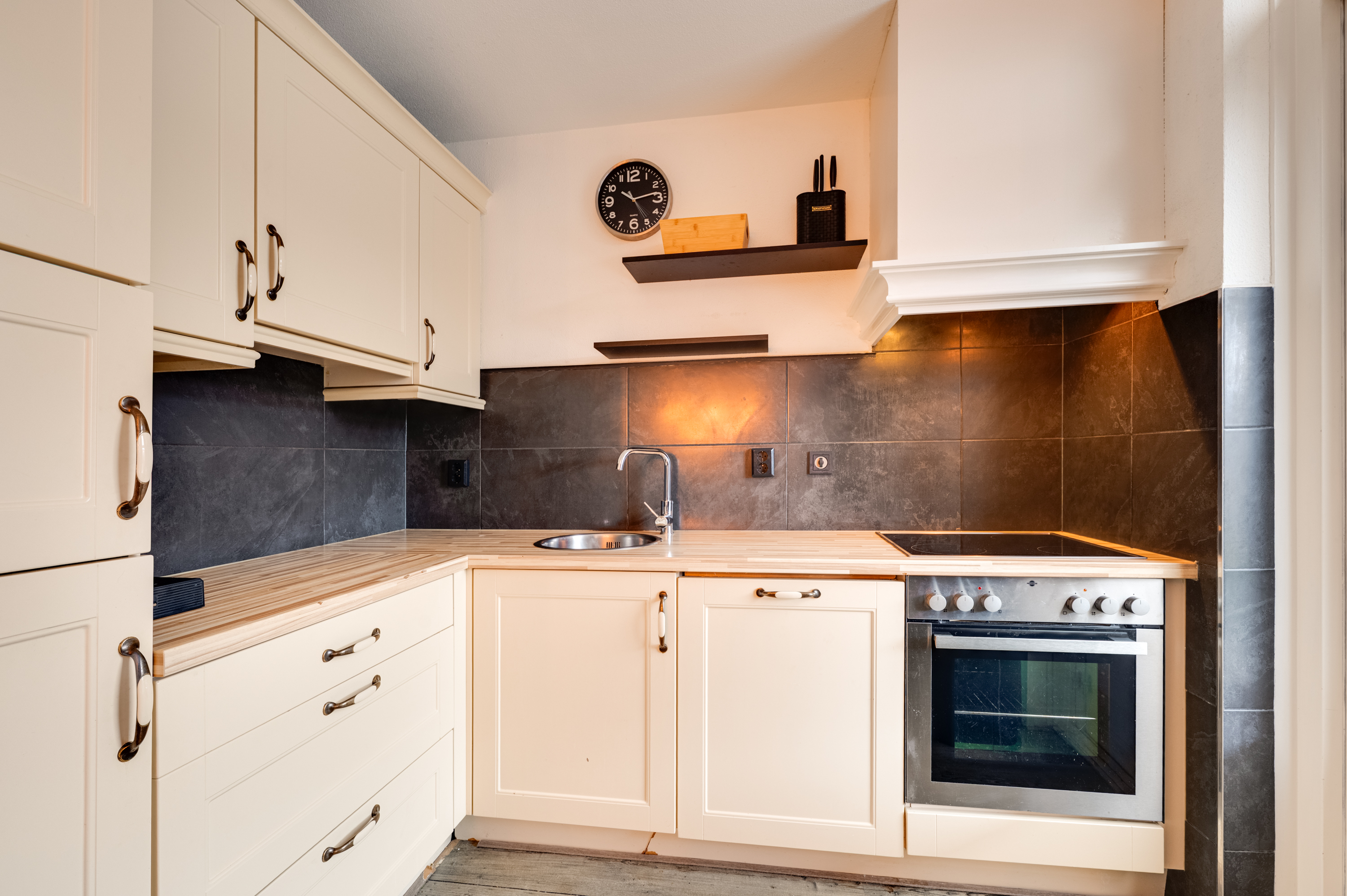 De halfopen keuken ligt aan de achterzijde van de woning. Het is een hoekkeuken die is voorzien van een elektrische kookplaat met afzuigkap, een oven, een vaatwasser en een vrijstaande koelkast. De keuken is netjes maar wel aan vernieuwing toe. Vanuit de keuken heb je direct toegang tot de achtertuin.