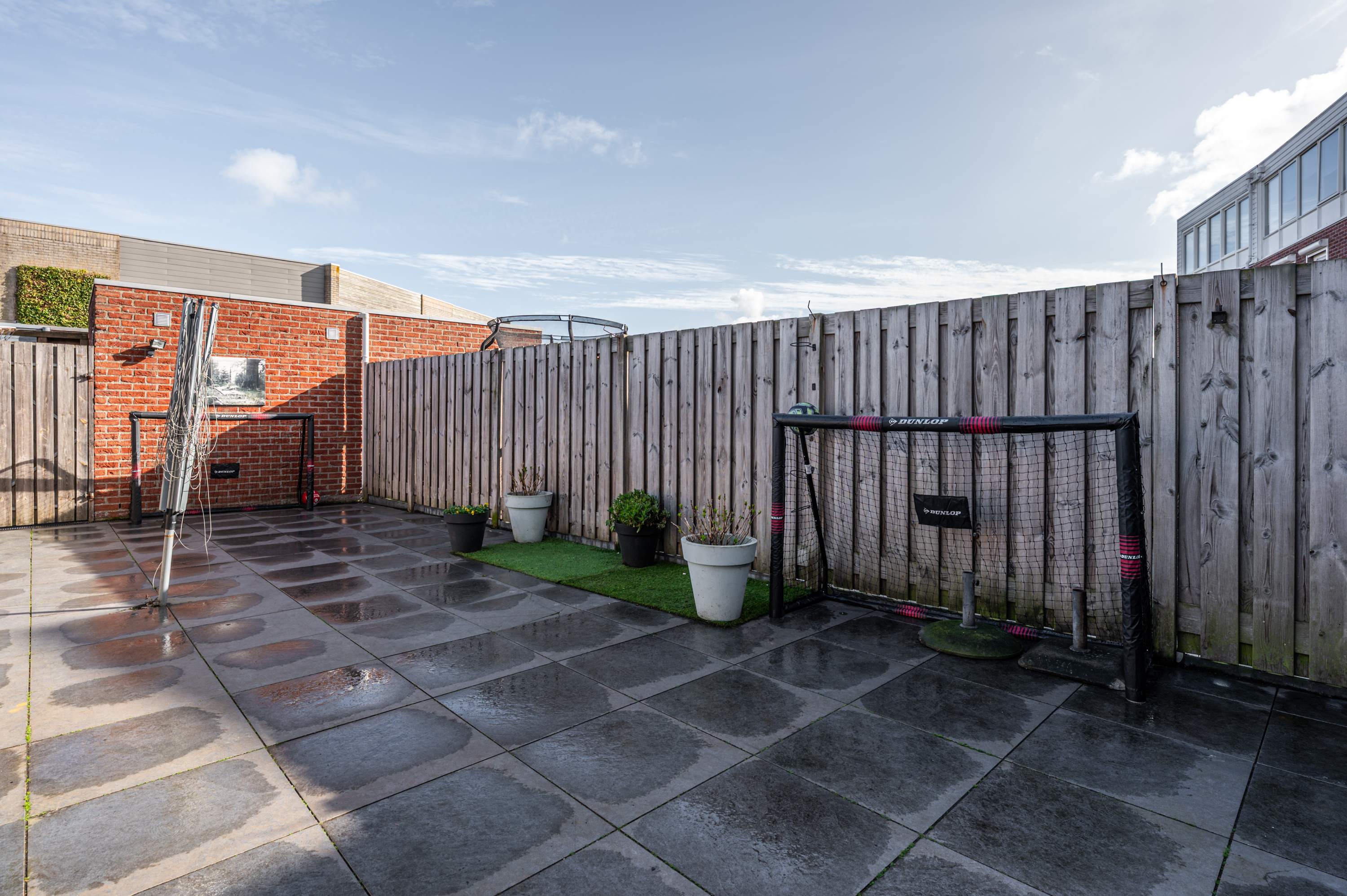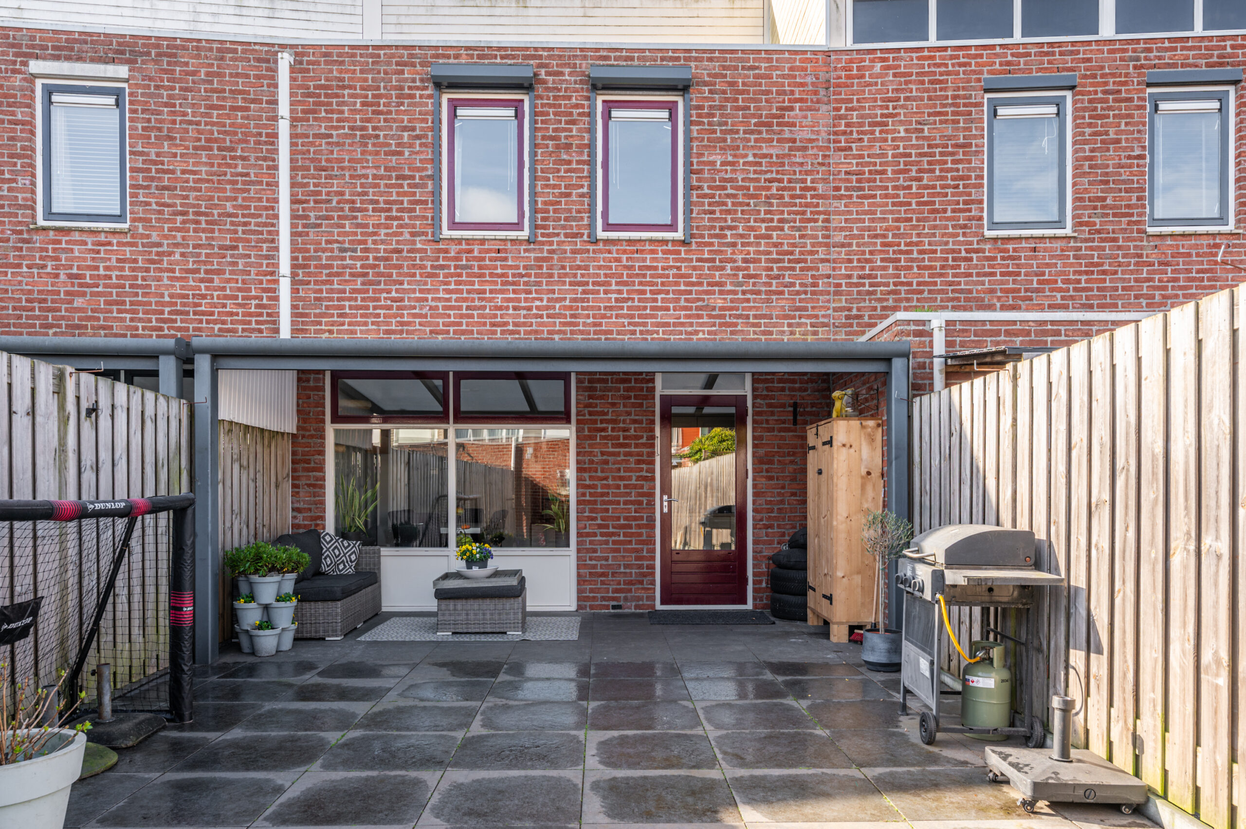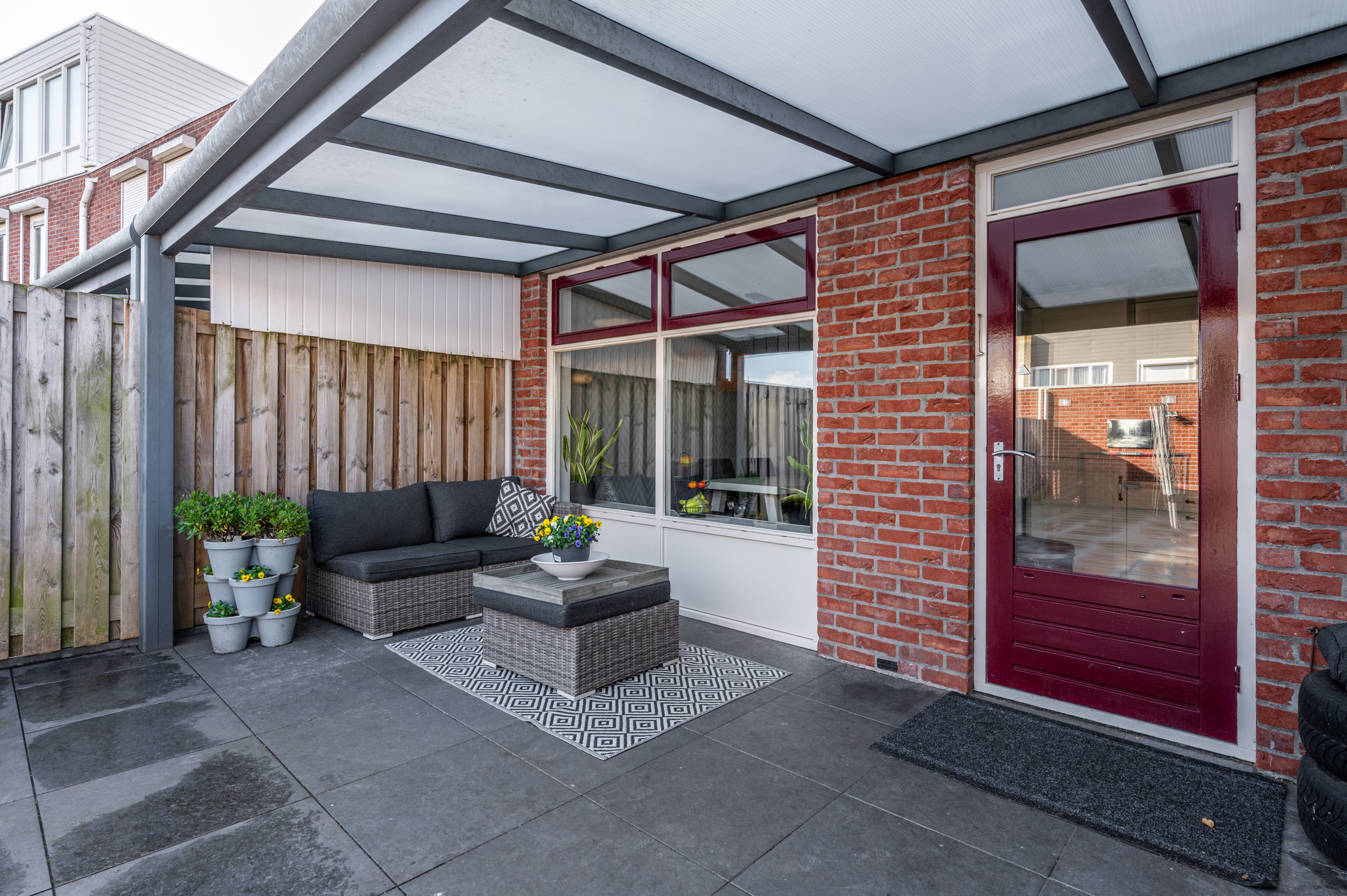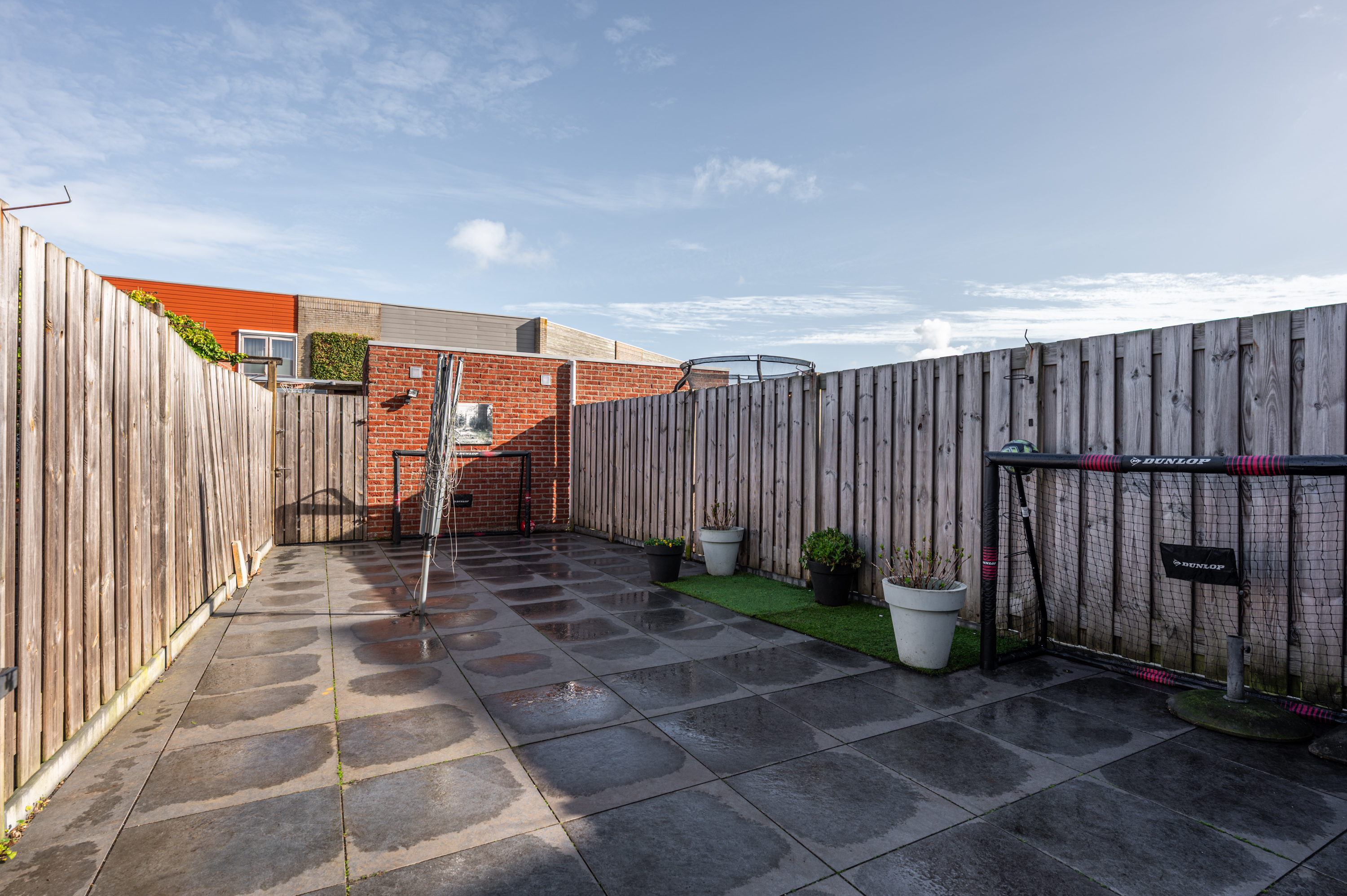 De achtertuin ligt op het noordoosten en is volledig betegeld met natuursteen tegels, waardoor de tuin onderhoudsarm is. Aan de achtergevel bevindt zich een aluminium overkapping met polycarbonaat dak, waardoor je ook bij minder mooi weer prettig buiten kunt zitten. De tuin is rondom voorzien van een schutting, wat zorgt voor privacy. Via de achterom poort bereik je direct de stenen berging van circa 7 m2, ideaal voor het stallen van fietsen en het opbergen van gereedschap en andere spullen.