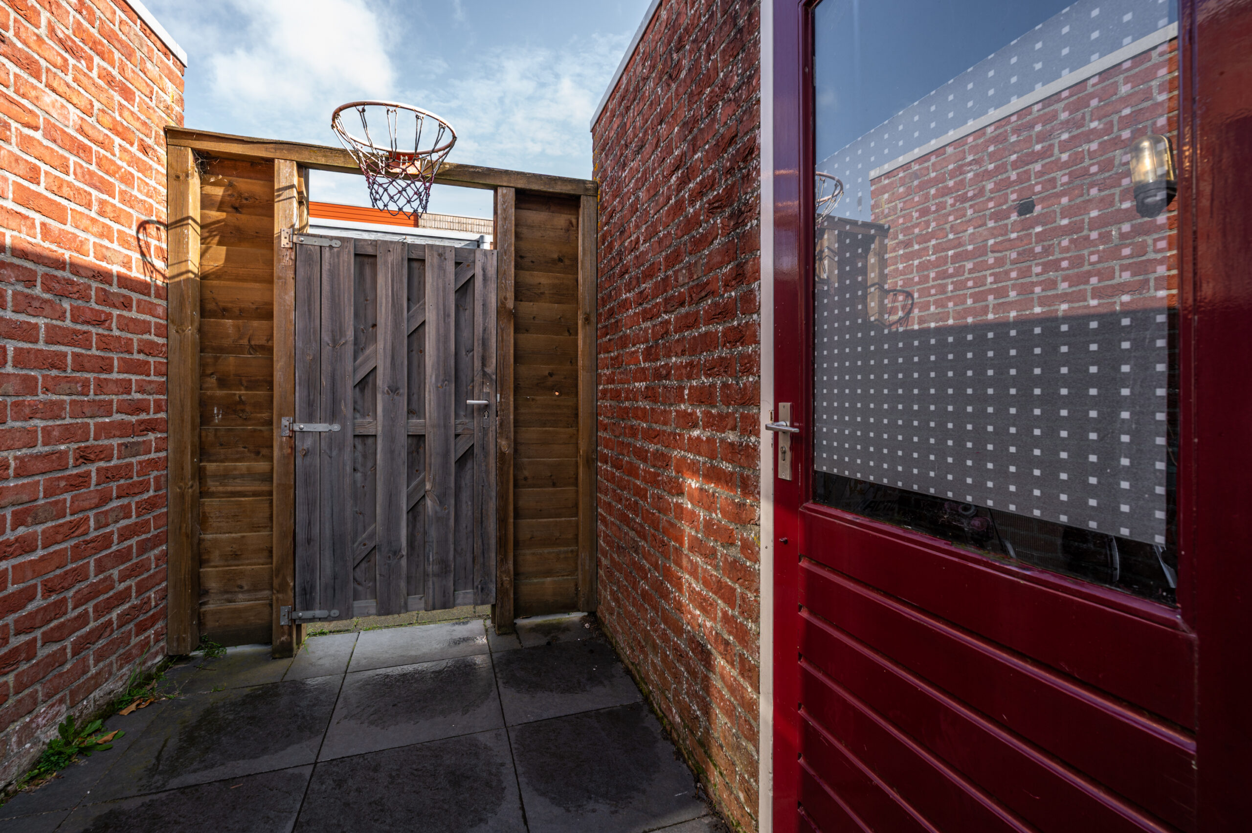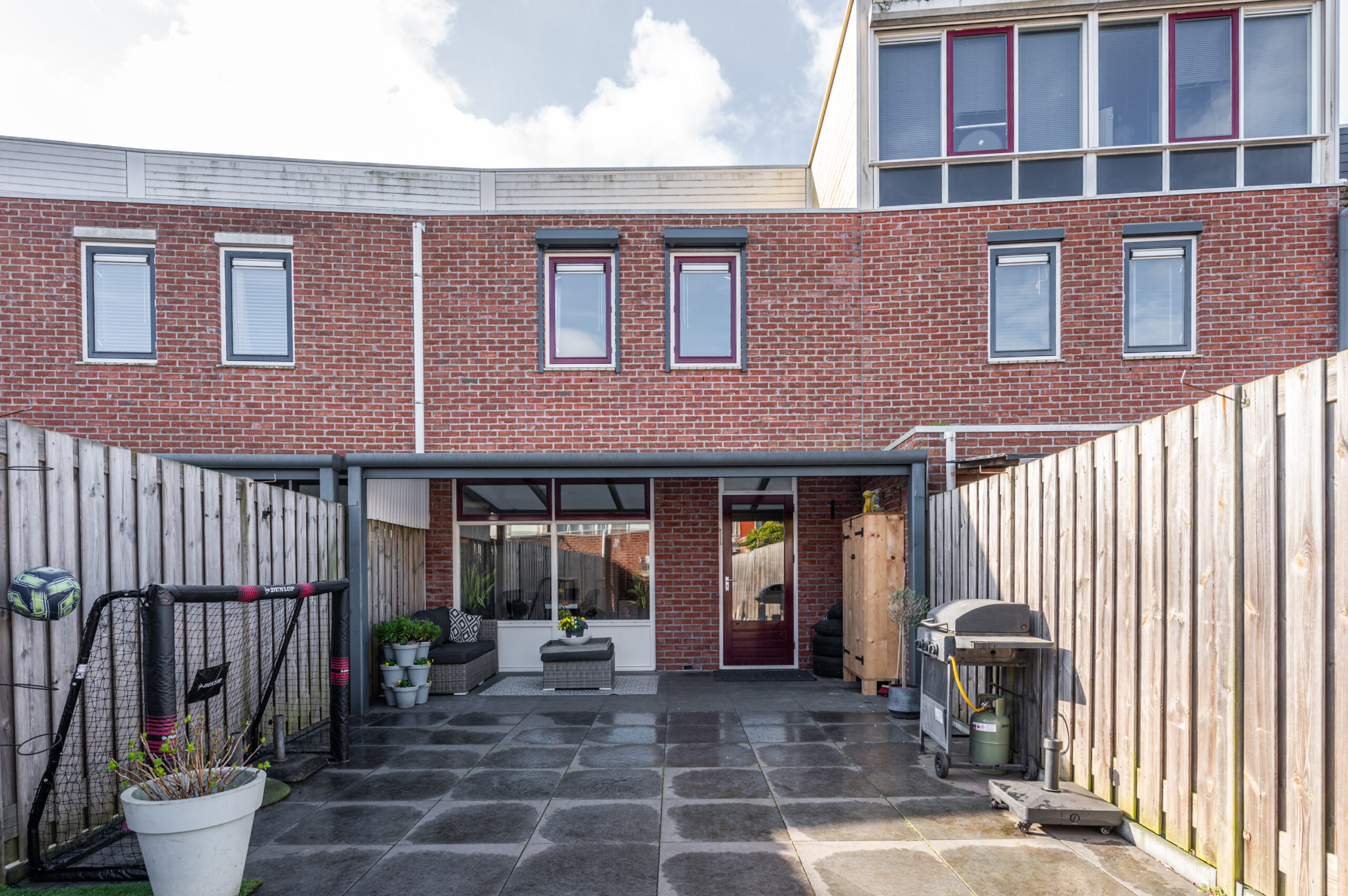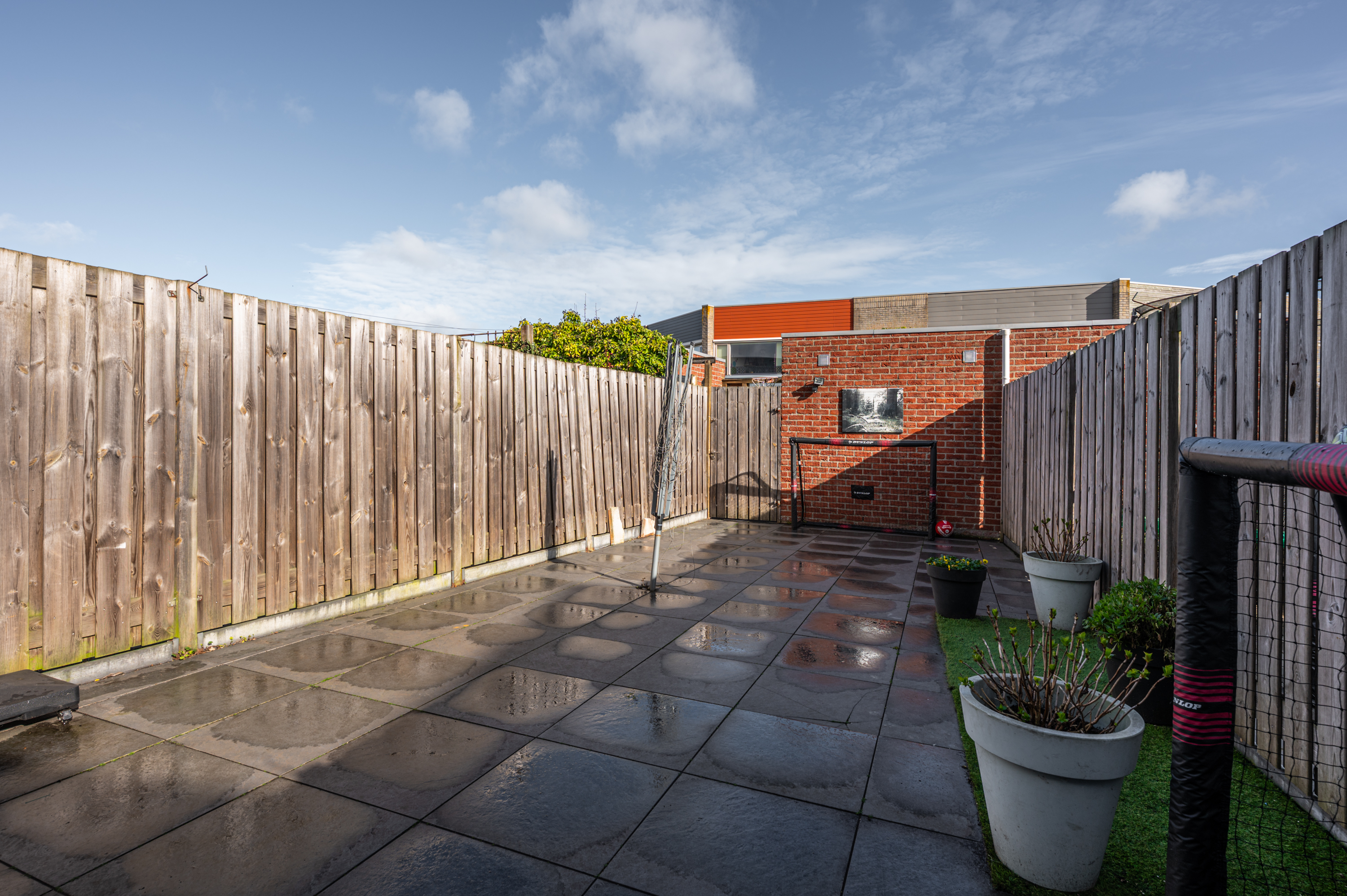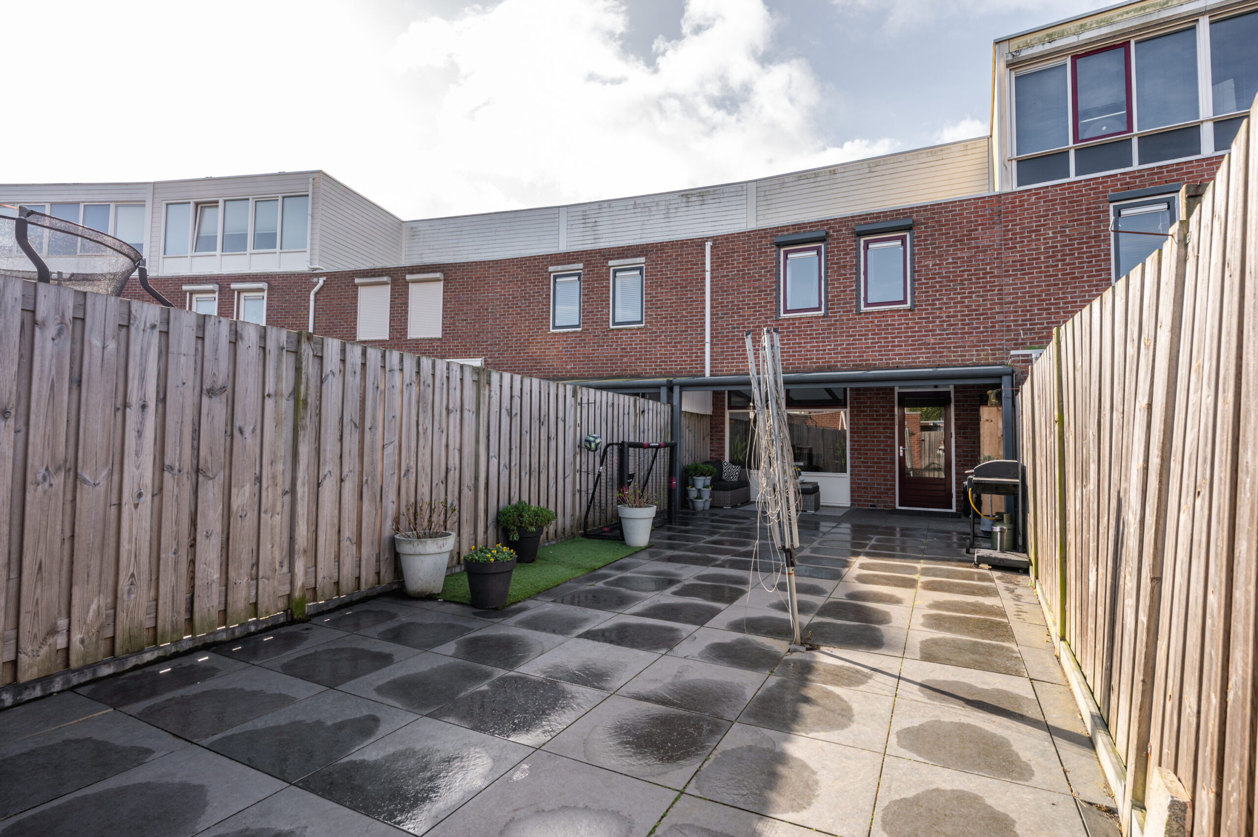 De achtertuin ligt op het noordoosten en is volledig betegeld met natuursteen tegels, waardoor de tuin onderhoudsarm is. Aan de achtergevel bevindt zich een aluminium overkapping met polycarbonaat dak, waardoor je ook bij minder mooi weer prettig buiten kunt zitten. De tuin is rondom voorzien van een schutting, wat zorgt voor privacy. Via de achterom poort bereik je direct de stenen berging van circa 7 m2, ideaal voor het stallen van fietsen en het opbergen van gereedschap en andere spullen.