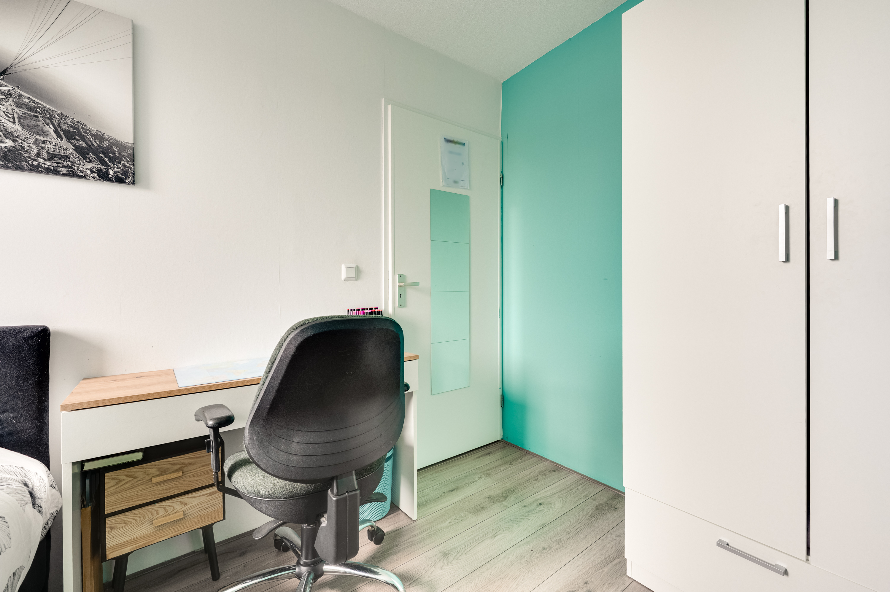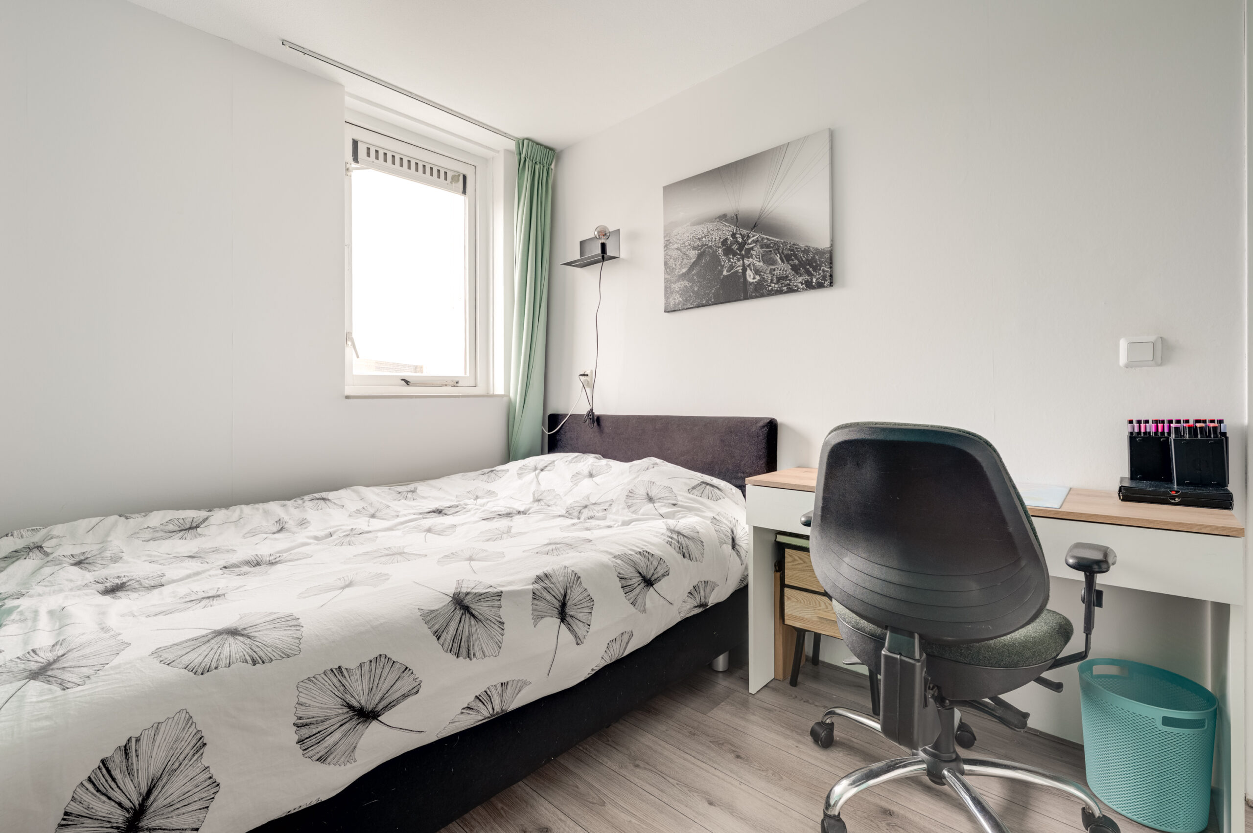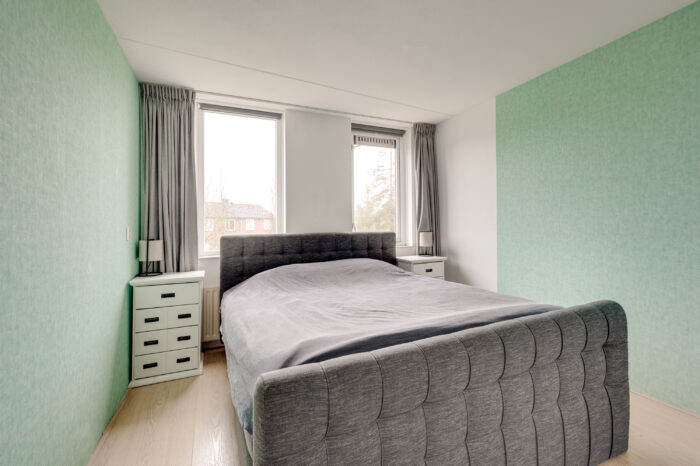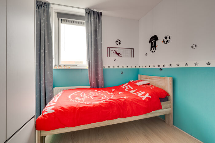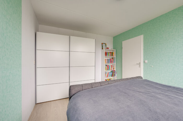 De extra slaapkamer is royaal en praktisch ingedeeld. Langs bijna de volledige breedte van de kamer staat een kast met schuifdeuren, waardoor je veel bergruimte hebt. Ook hier ligt een nette laminaatvloer.