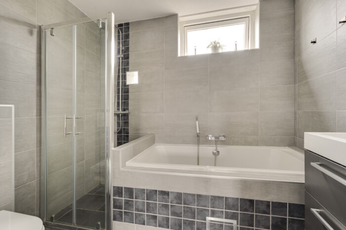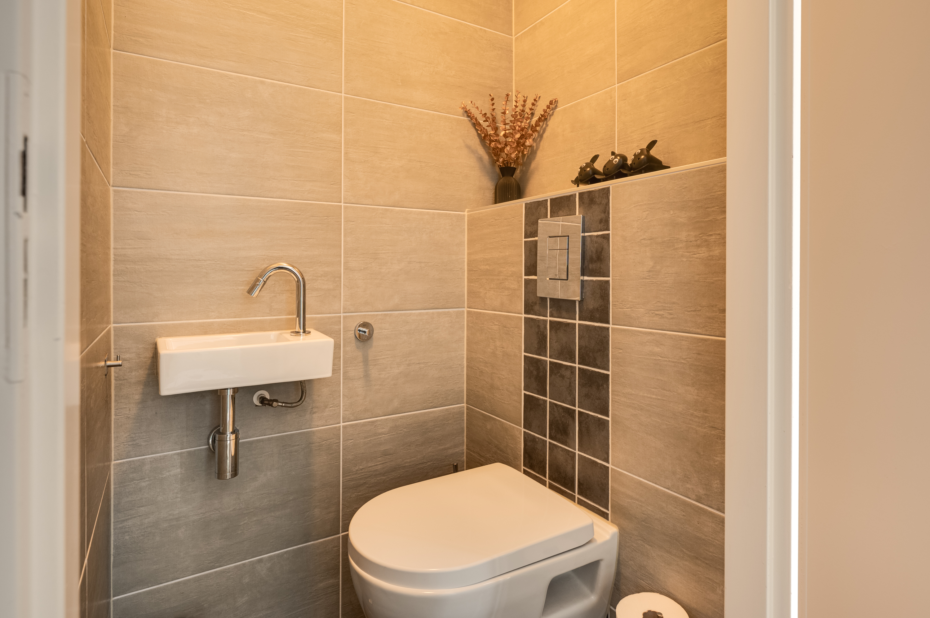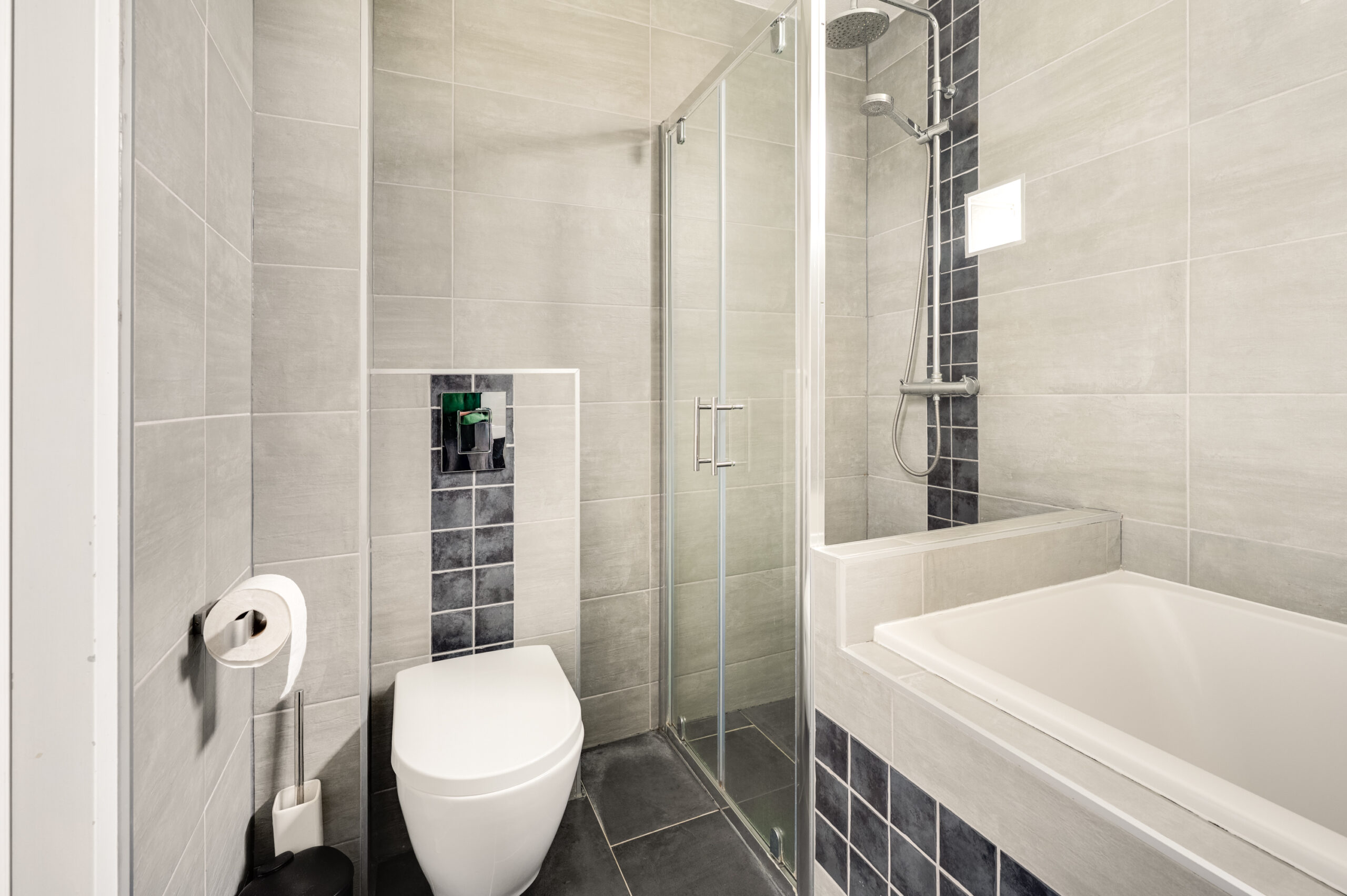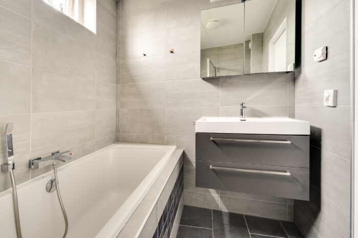 De badkamer is modern en volledig betegeld. De ruimte is ingericht met een toilet, een wastafel met meubel en een praktische spiegelkast. Verder vind je hier een ligbad, een inloopdouche en elektrische vloerverwarming. Dankzij het kiepraampje kan de badkamer goed worden geventileerd.