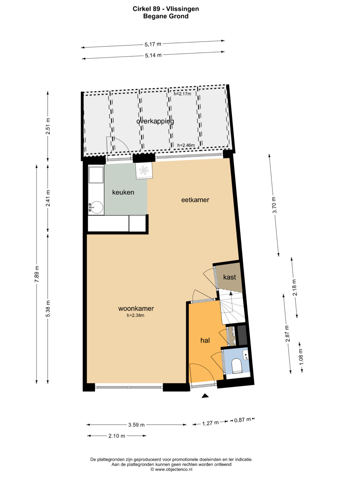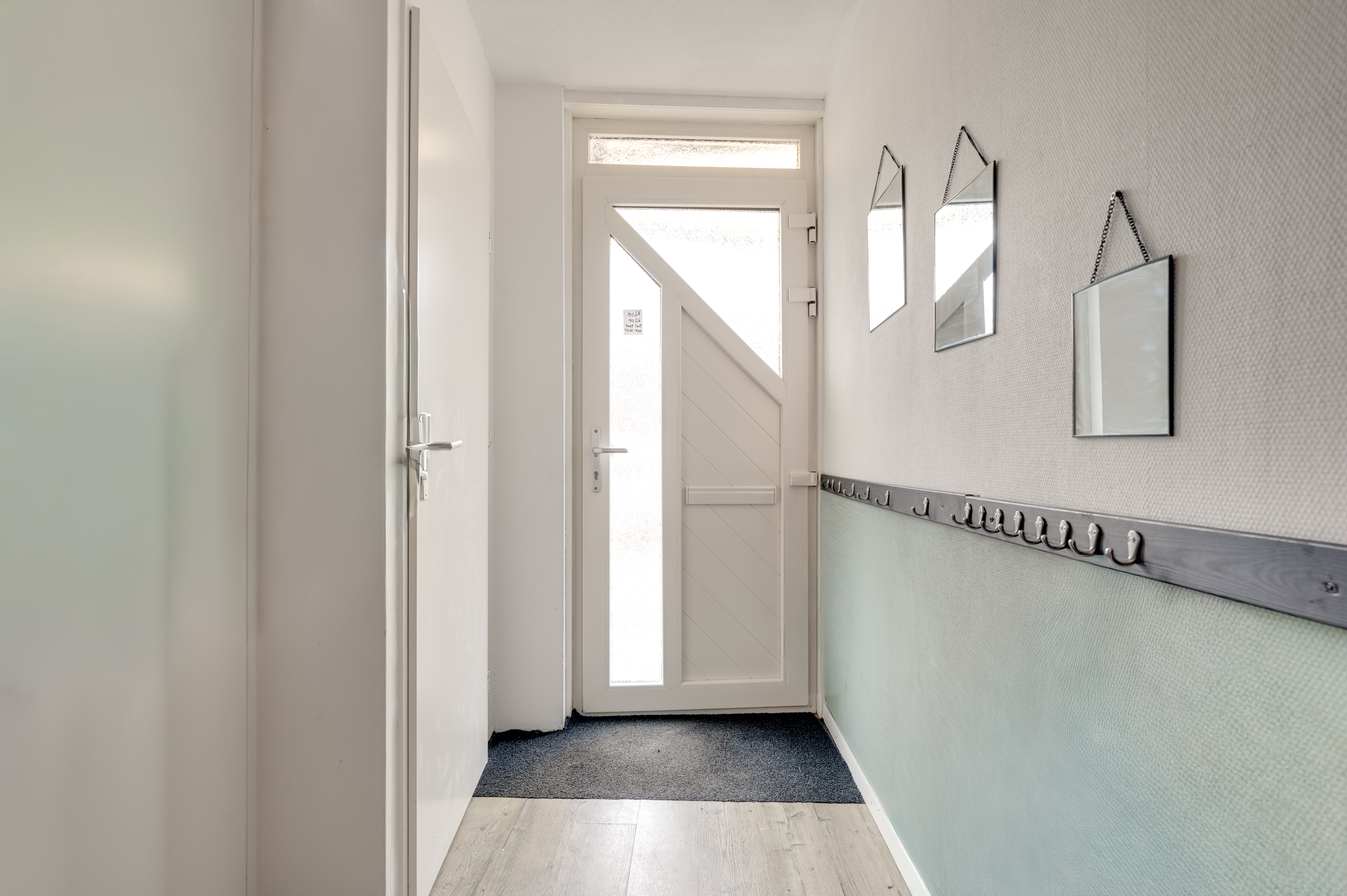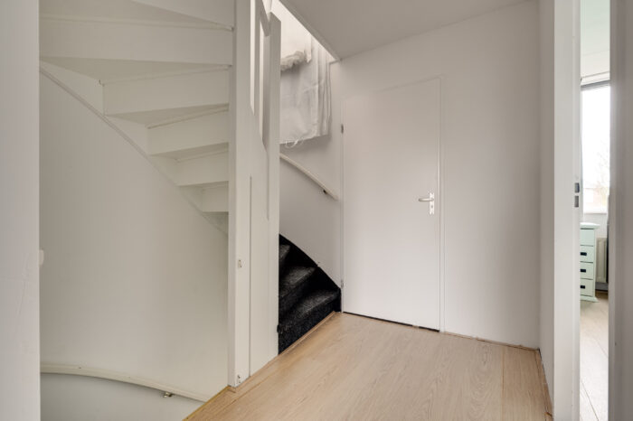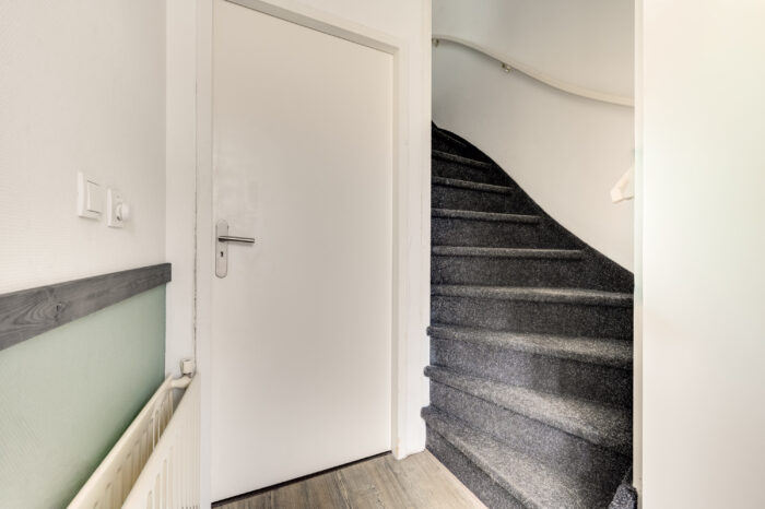 Je komt binnen in de hal met ruimte voor een garderobe. Hier vind je ook het toilet, de meterkast en de trap naar de eerste verdieping. Vanuit de hal loop je door naar de woonkamer.