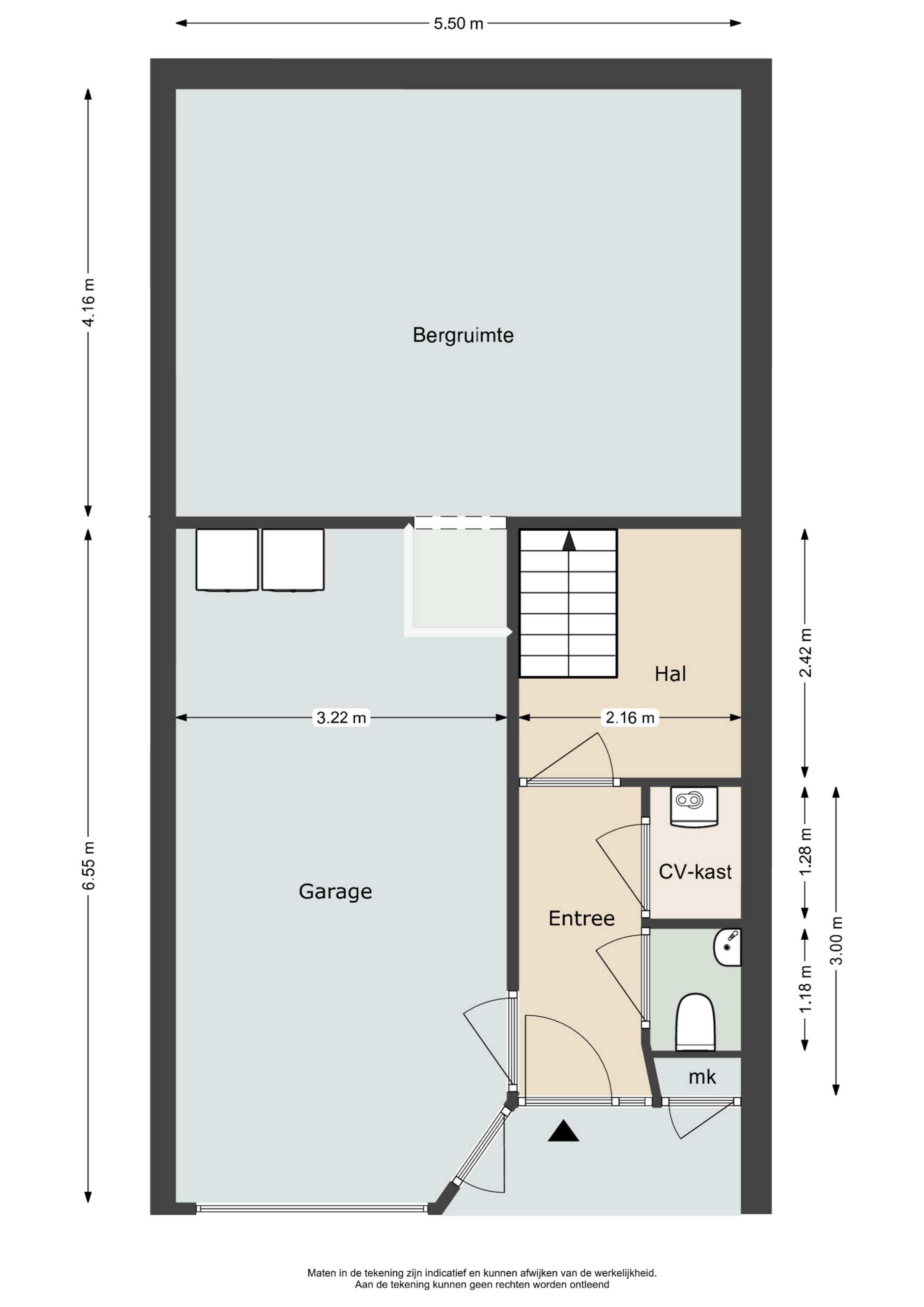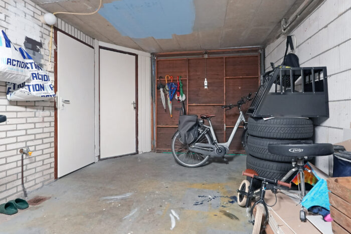 Je komt binnen in een nette hal met toegang tot het toilet, de meterkast en een aparte kast voor de cv-installatie. Vanuit de hal loop je door naar de ruime inpandige garage. Hier is plek voor je auto, fietsen en extra opslag. Ook vind je hier de aansluitingen voor de wasmachine en de droger. Achterin de garage is er nog een souterrain/bergruimte. Deze ligt iets lager en heeft geen stahoogte, maar is ideaal voor het opbergen van spullen die je niet dagelijks nodig hebt. De garage is ook van buitenaf bereikbaar, via een aparte loopdeur.