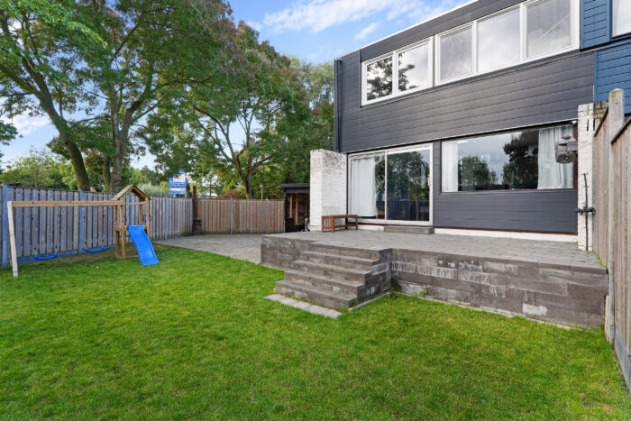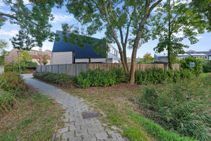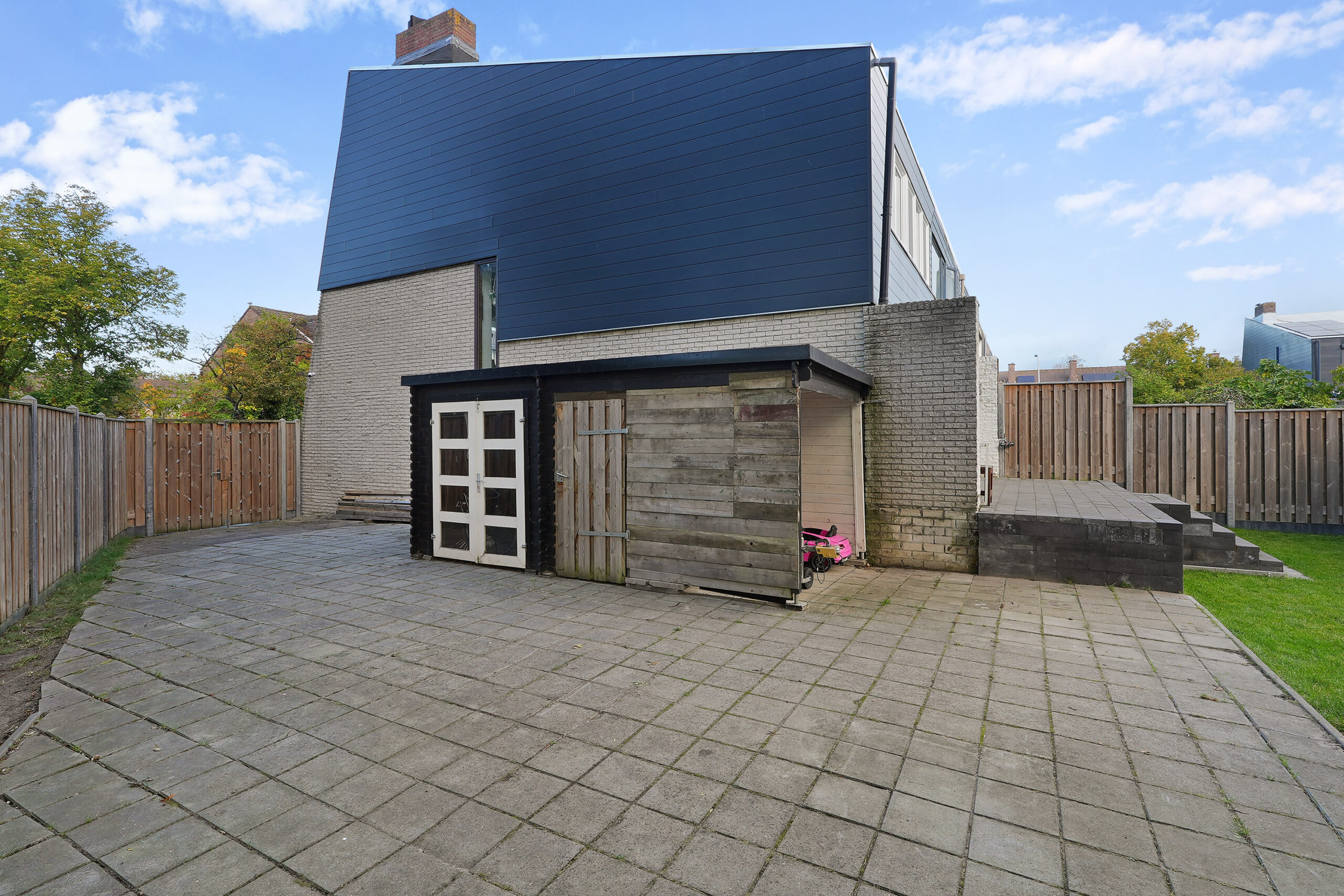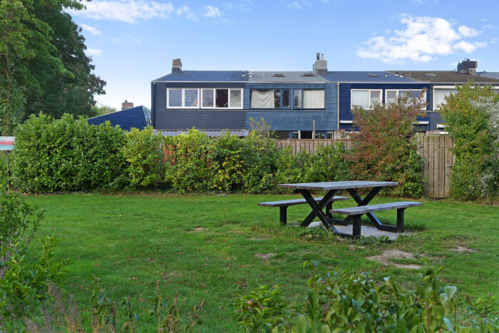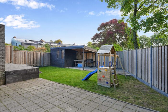 De woning heeft een royale tuin die ligt op het zuidoosten, aan de achterzijde én zijkant van het huis. Door de ligging en de nette schutting met betonpalen rondom heb je hier veel privacy. Je bereikt de tuin via de schuifpui in de woonkeuken of via de poort naast de woning. Direct achter de woning ligt een terras, en via een aantal treden stap je zo vanuit de woning de tuin in. Hier vind je een gazon, meerdere terrassen en achterin een tuinhuis met overkapping. Het tuinhuis is voorzien van elektriciteit en bedraad internet. In de tuin zelf is er ook een wateraansluiting en elektriciteit aanwezig. Aan de zijkant, tegen de woning aan is een overkapping met schuurtje, handig voor fietsen, tuingereedschap of als extra opslag. Grenzend aan de achtertuin ligt een openbare groenstrook met bomen en een zitgelegenheid.