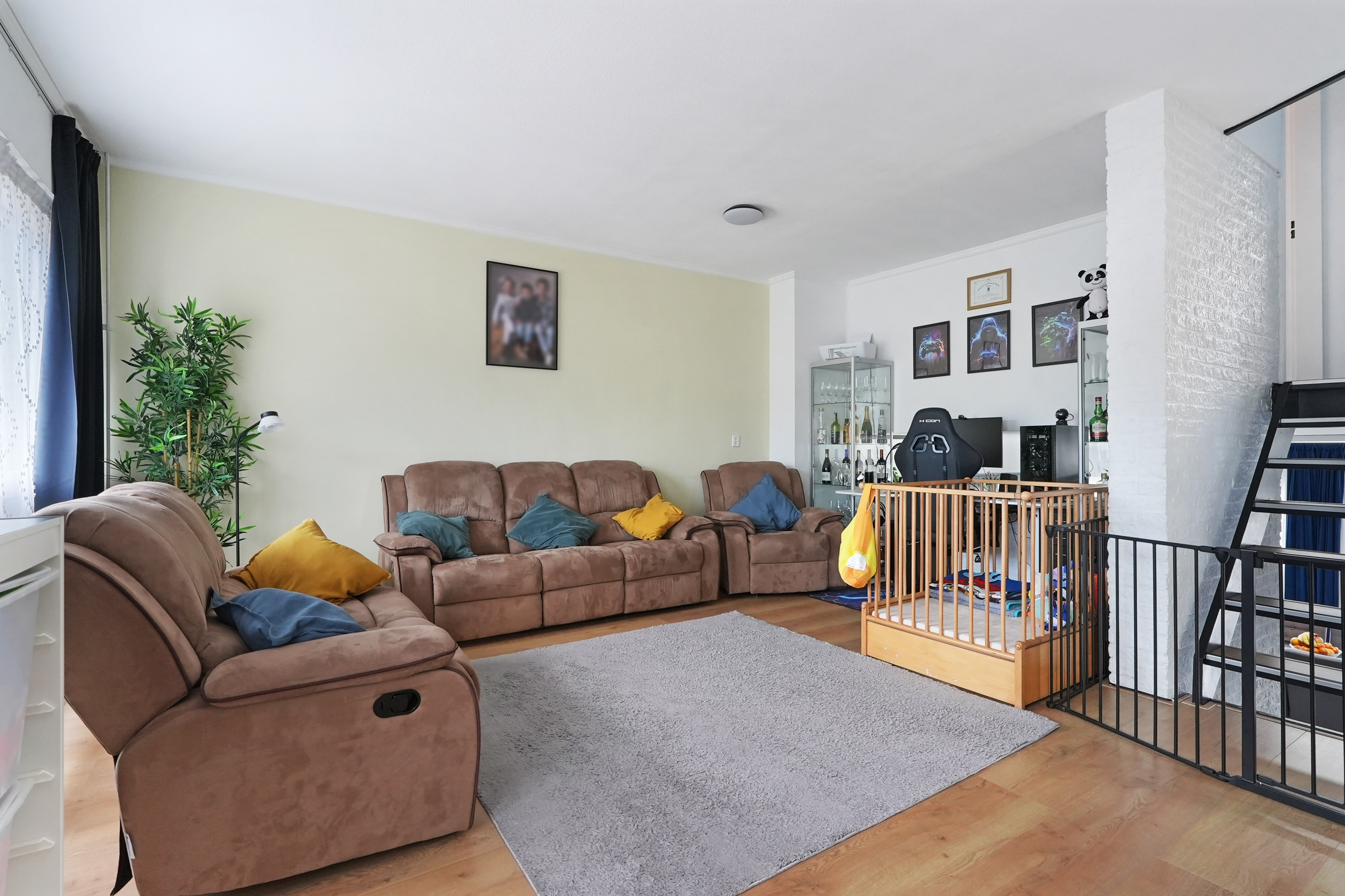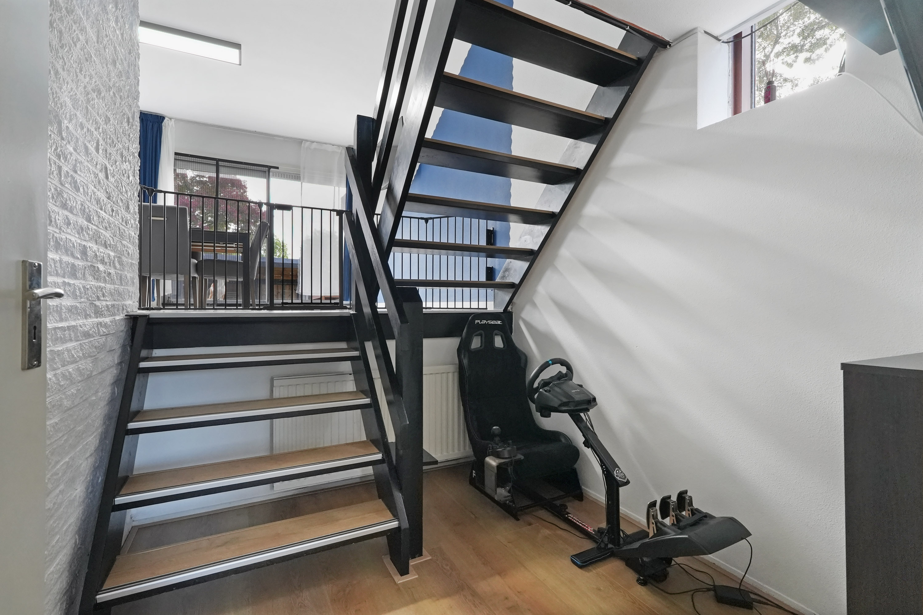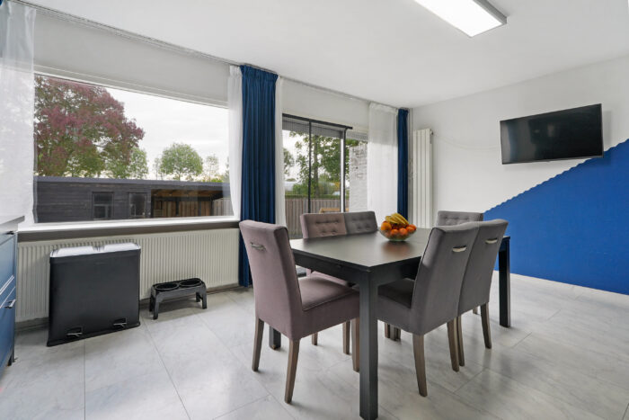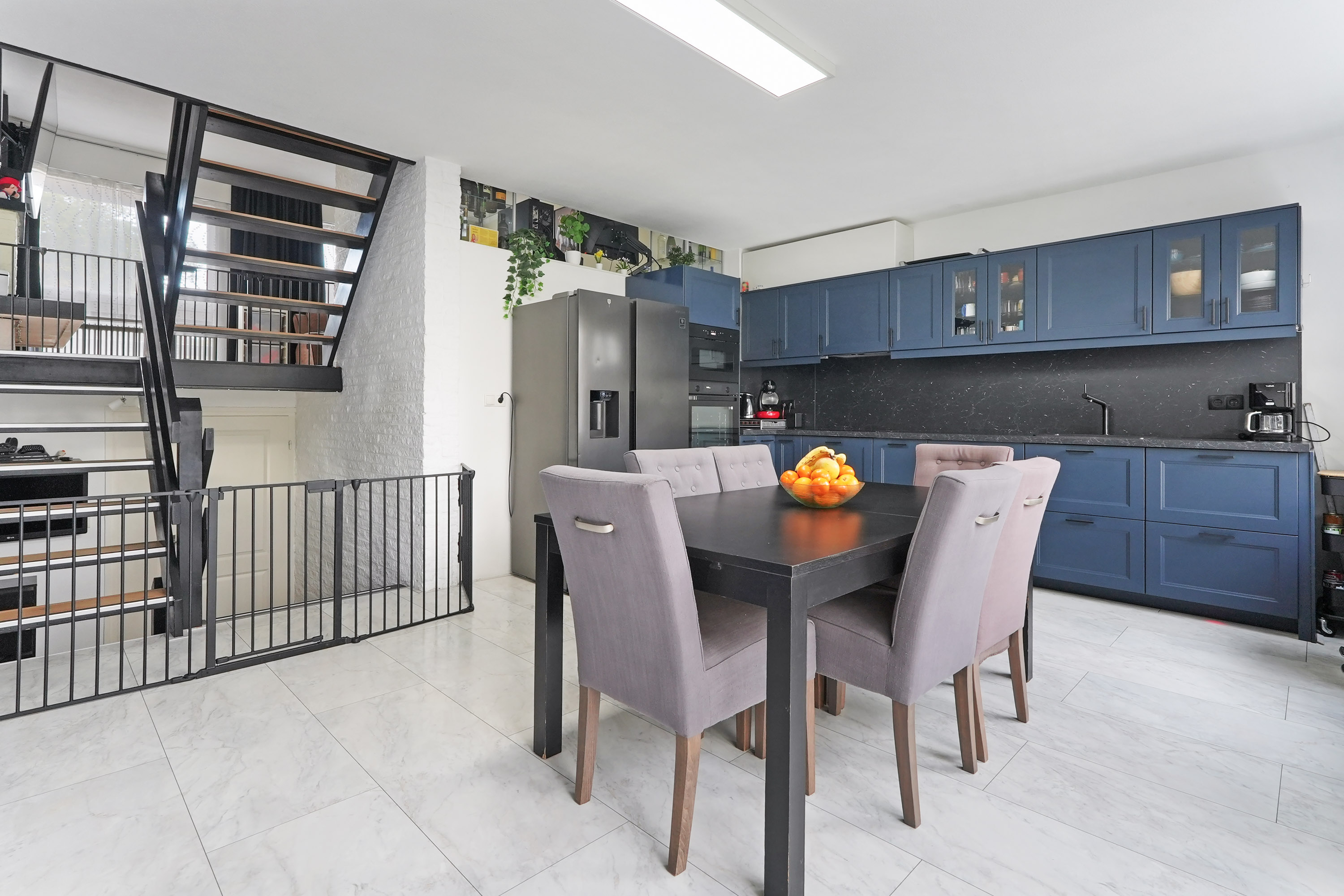 Via een korte trap vanuit de hal kom je in de ruime woonkeuken. De moderne keuken is in 2023 vernieuwd en voorzien van een kunststof werkblad, inductiekookplaat, afzuigkap, oven, magnetron en vaatwasser. De laminaatvloer geeft de keuken een moderne en strakke uitstraling. Er is ook een tv-aansluiting, zodat je tijdens het koken of eten gezellig kunt meekijken. Via de schuifpui heb je toegang tot de achtertuin.