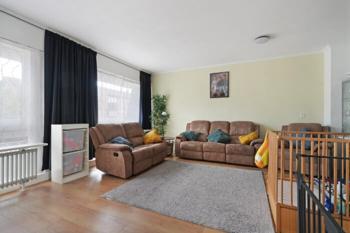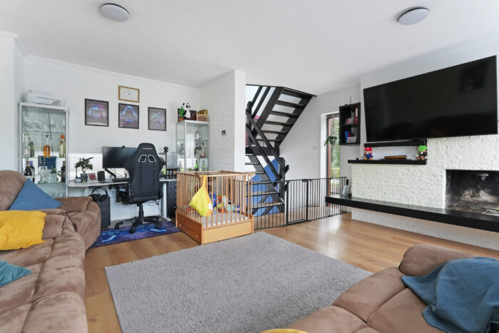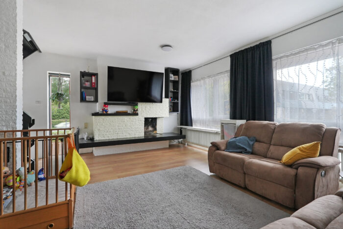 Op de eerste verdieping vind je de lichte woonkamer met een grote raampartij aan de voorzijde van de woning. Hierdoor komt er veel daglicht binnen en voelt de ruimte extra ruim aan. De sfeervolle open haard zorgt voor warmte en gezelligheid, vooral in de koudere maanden. Via de woonkamer heb je toegang tot de loggia. De vloer is afgewerkt met een laminaatvloer in houtlook.