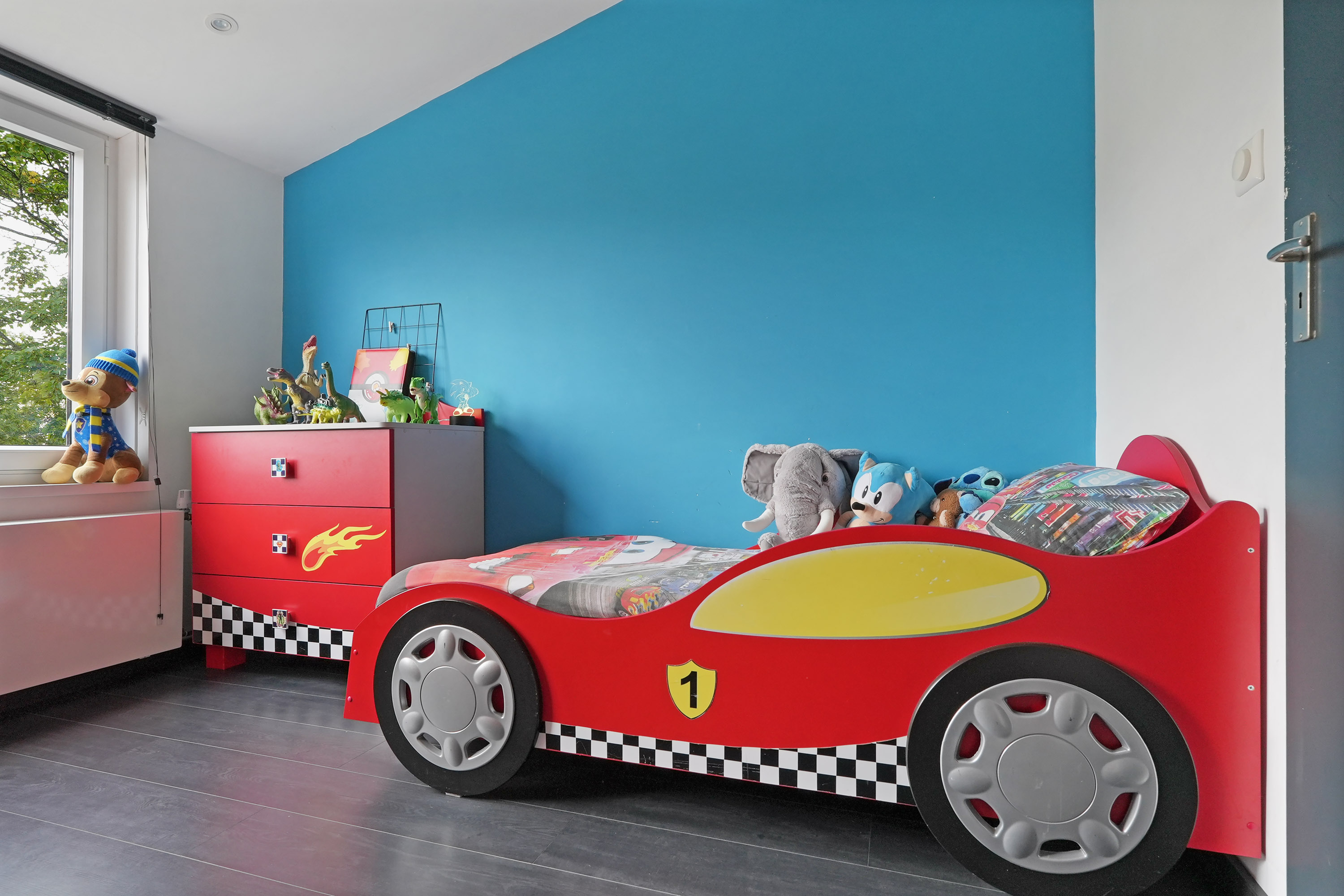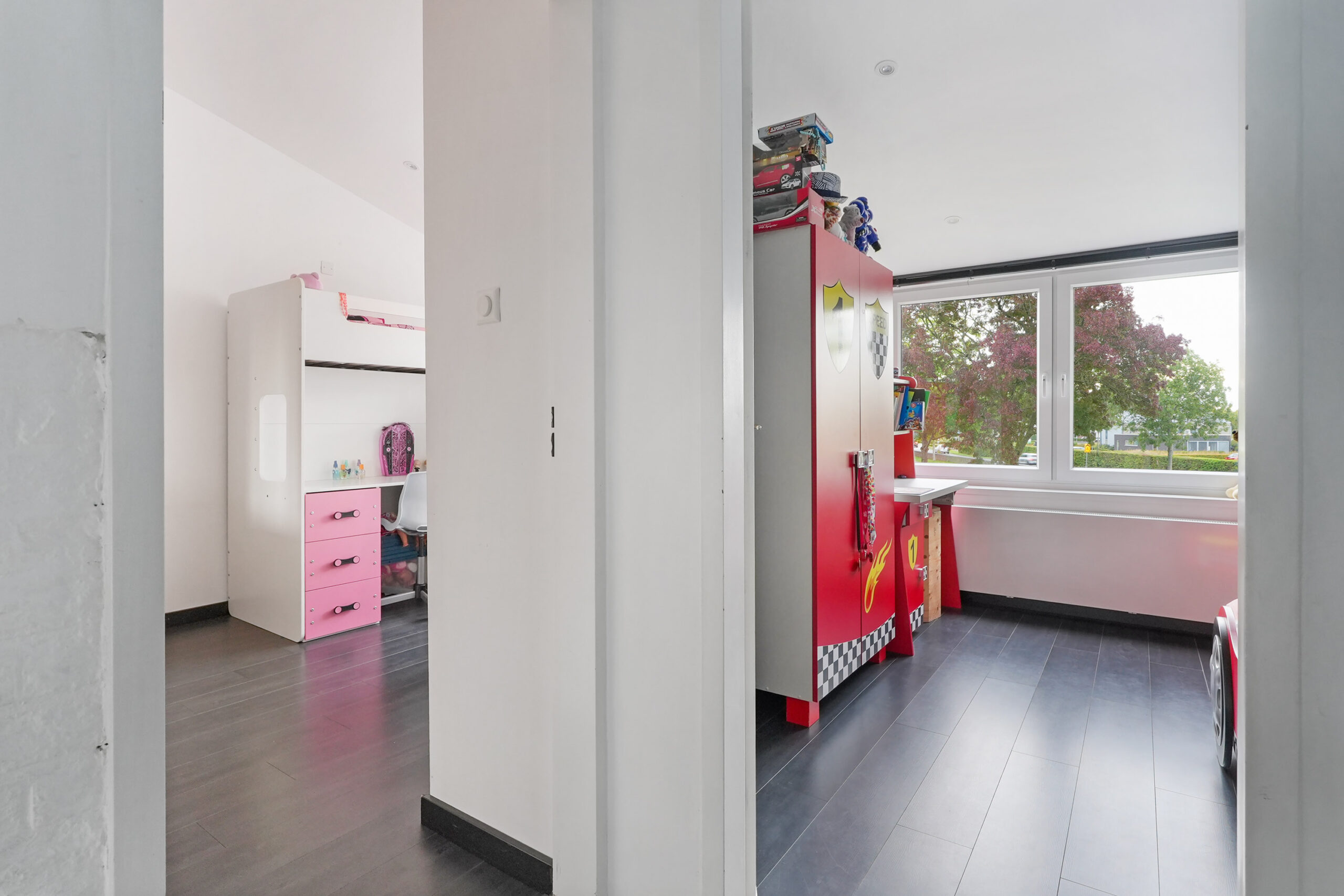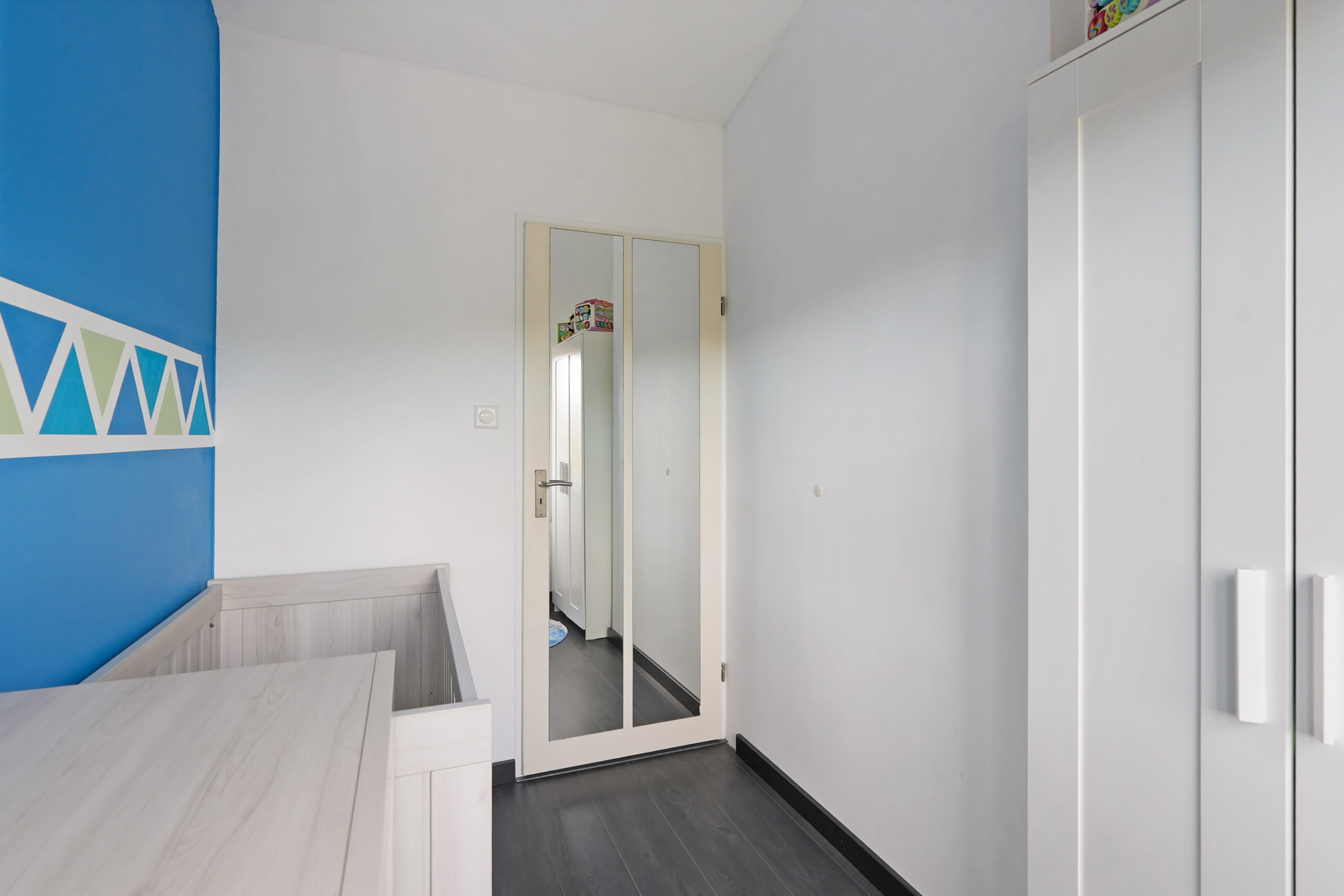 Op de tussenverdieping kom je via de overloop bij twee slaapkamers, beide gelegen aan de achterzijde van de woning. Deze kamers zijn netjes afgewerkt en hebben een doorlopende laminaatvloer in antracietkleur.
