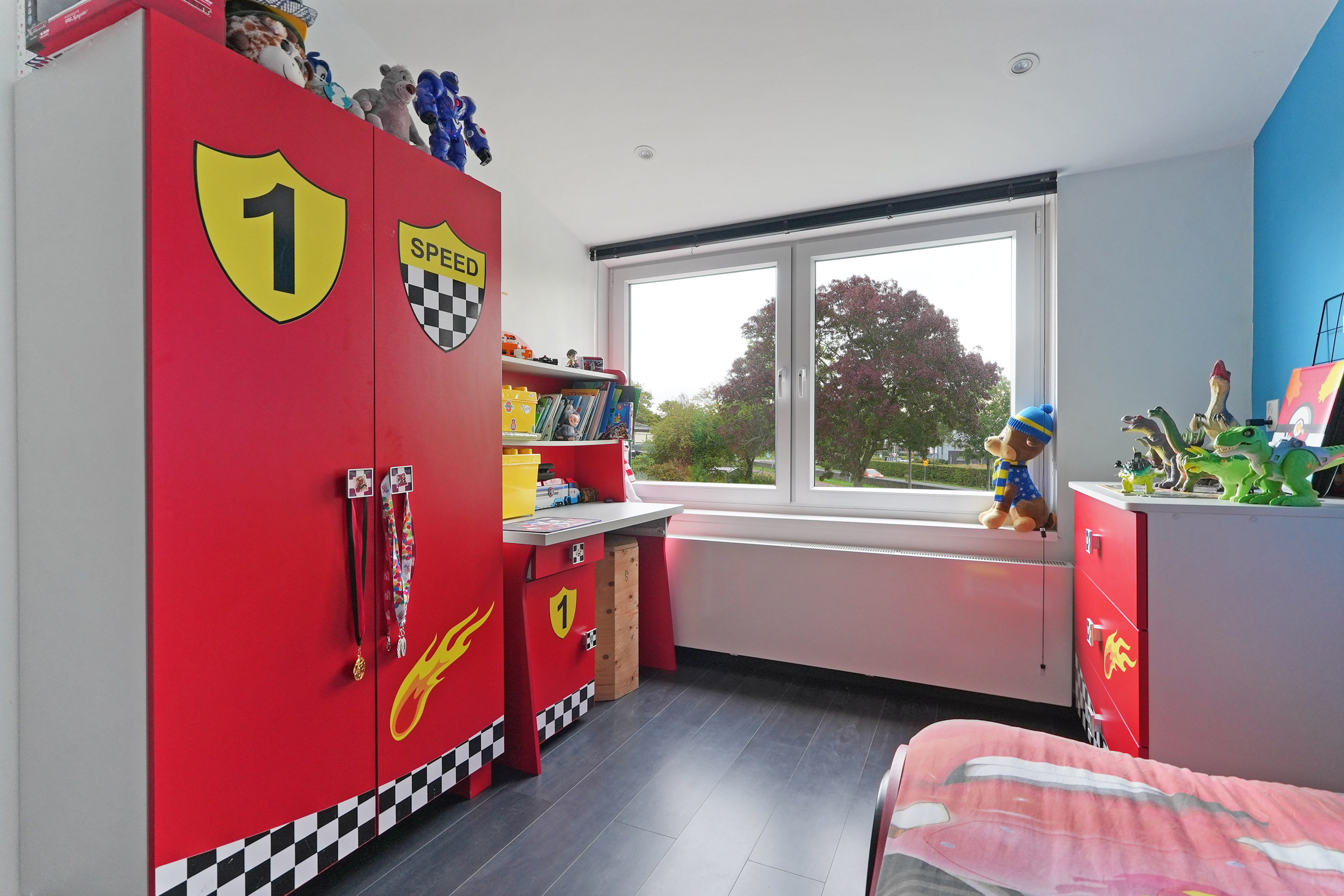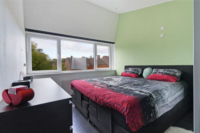 De grootste slaapkamer – slaapkamer 3 heeft kunststof kozijnen met twee draaikiepramen, wat zorgt voor veel licht. De kamer is netjes afgewerkt met een laminaatvloer en spotjes in het plafond.
