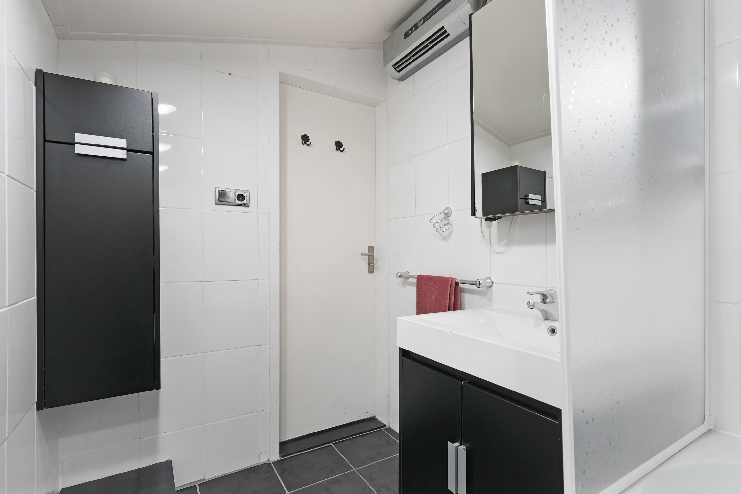 De badkamer is uitgevoerd in een stijlvolle zwart-wit kleurstelling en is volledig betegeld. Je vindt hier een ligbad met douche, een wastafel met meubel en spiegelkast, een toilet en mechanische ventilatie. De vloertegels maken het geheel compleet en zorgen voor een nette afwerking.