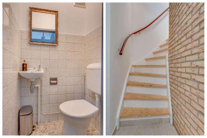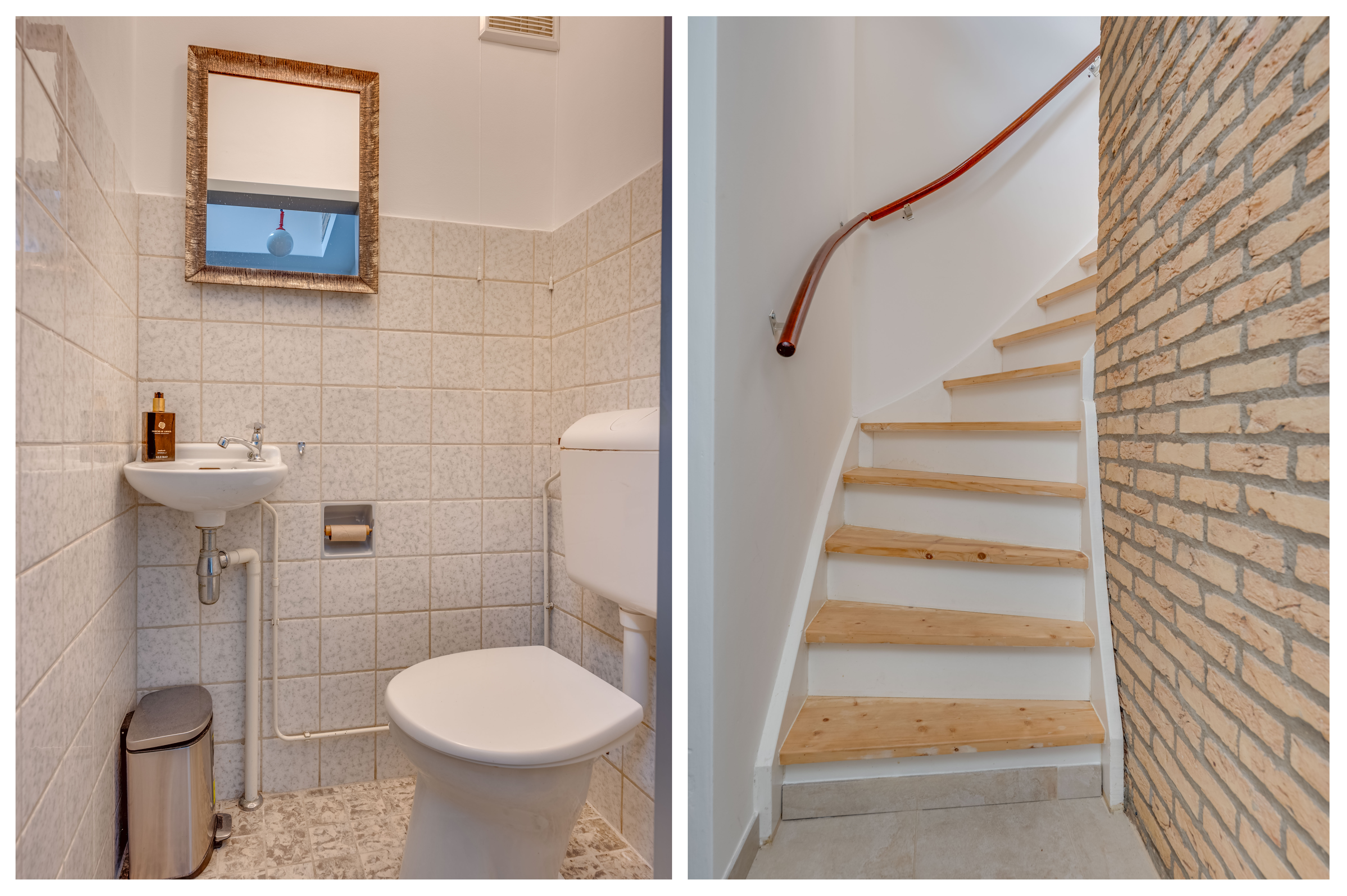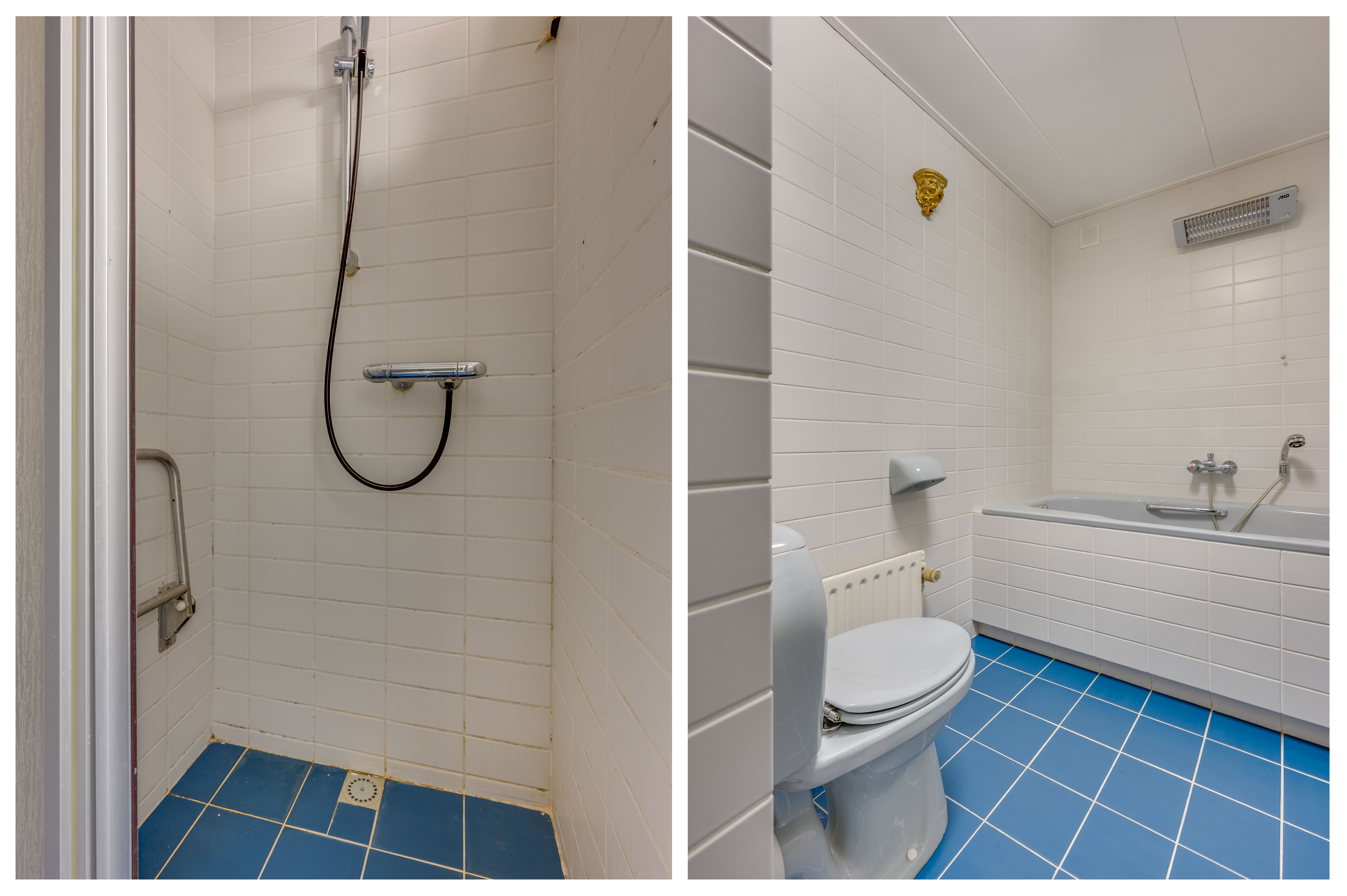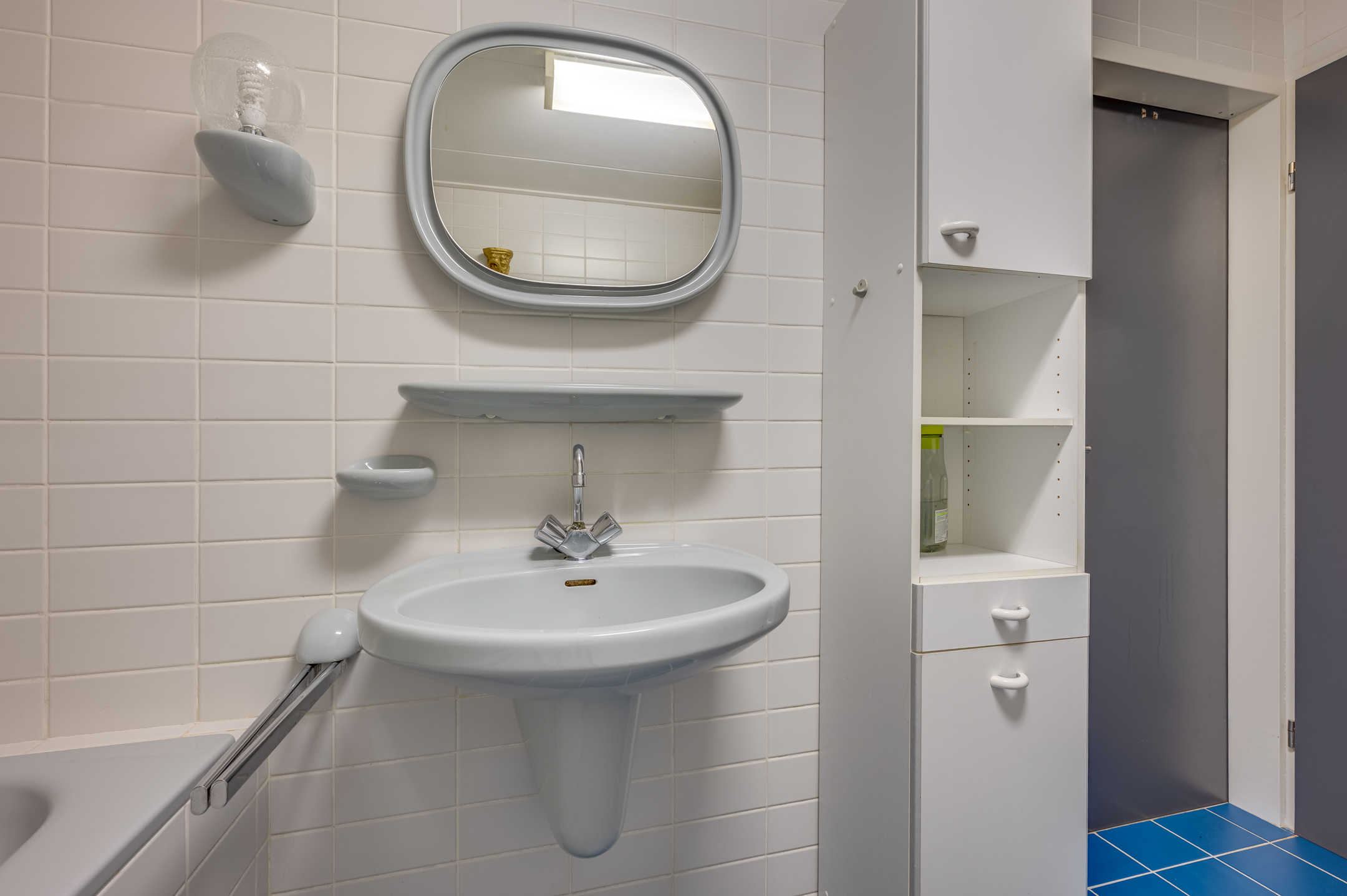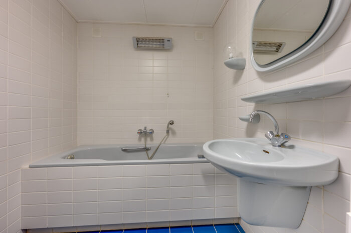 De badkamer is eenvoudig maar compleet ingericht. De ruimte is volledig betegeld en voorzien van mechanische ventilatie, wat zorgt voor een goede luchtcirculatie. Je vindt hier een toilet, een wastafel, een bad en een douche. De badkamer is zowel via de overloop als via de grote slaapkamer bereikbaar.