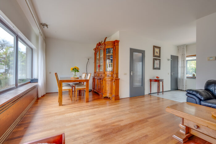 De woon- en eetkamer ligt aan de voorzijde van de woning. Dankzij de grote ramen komt er veel natuurlijk licht naar binnen. De ruimte is voorzien van strakke wanden en een laminaatvloer. In de kamer staat een gashaard, die eventueel kan worden aangepast naar een houthaard voor extra sfeer en warmte. Loop je verder naar achteren, dan kom je in de keuken.