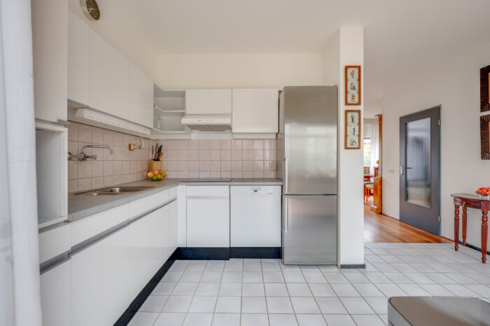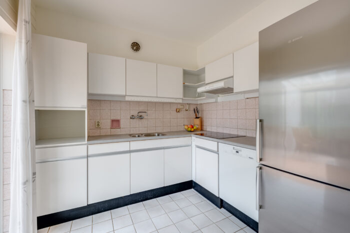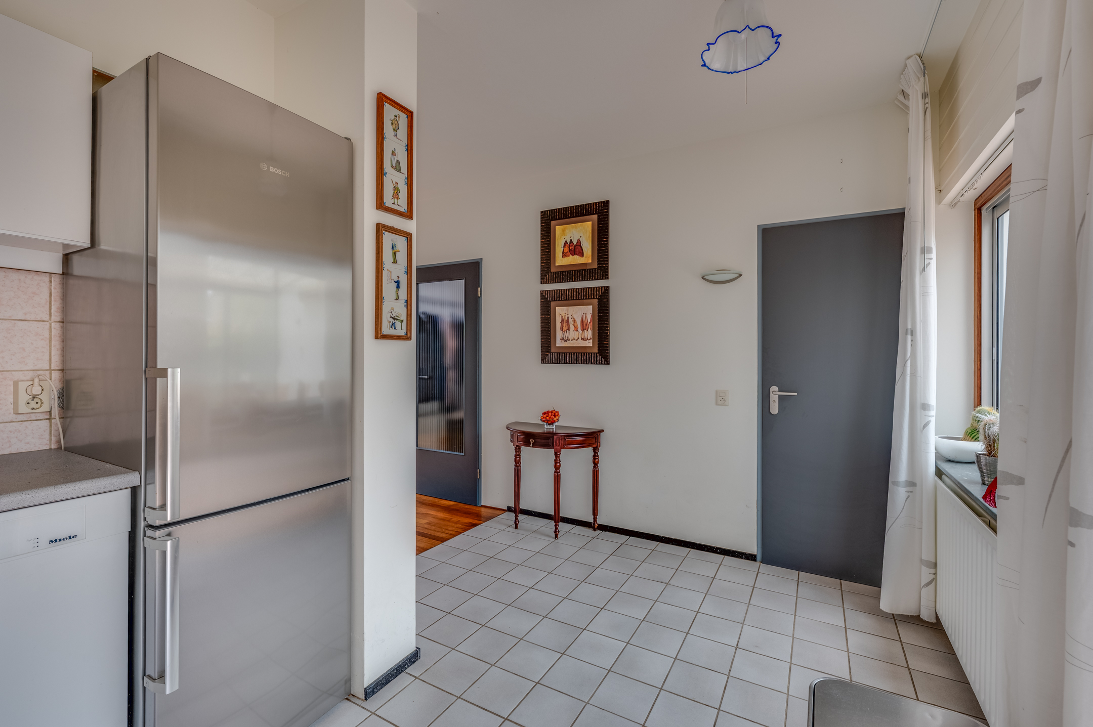 De halfopen keuken ligt aan de tuinzijde en is verbonden met de woonkamer. De keuken heeft een hoekopstelling en is eenvoudig maar praktisch ingericht. Je vindt hier een vierpits inductiekookplaat, een afzuigkap en een vaatwasser. Op de vloer liggen tegels met vloerverwarming. Vanuit de keuken heb je toegang tot een handige voorraadkast. Via de openslaande deuren kom je in de serre.