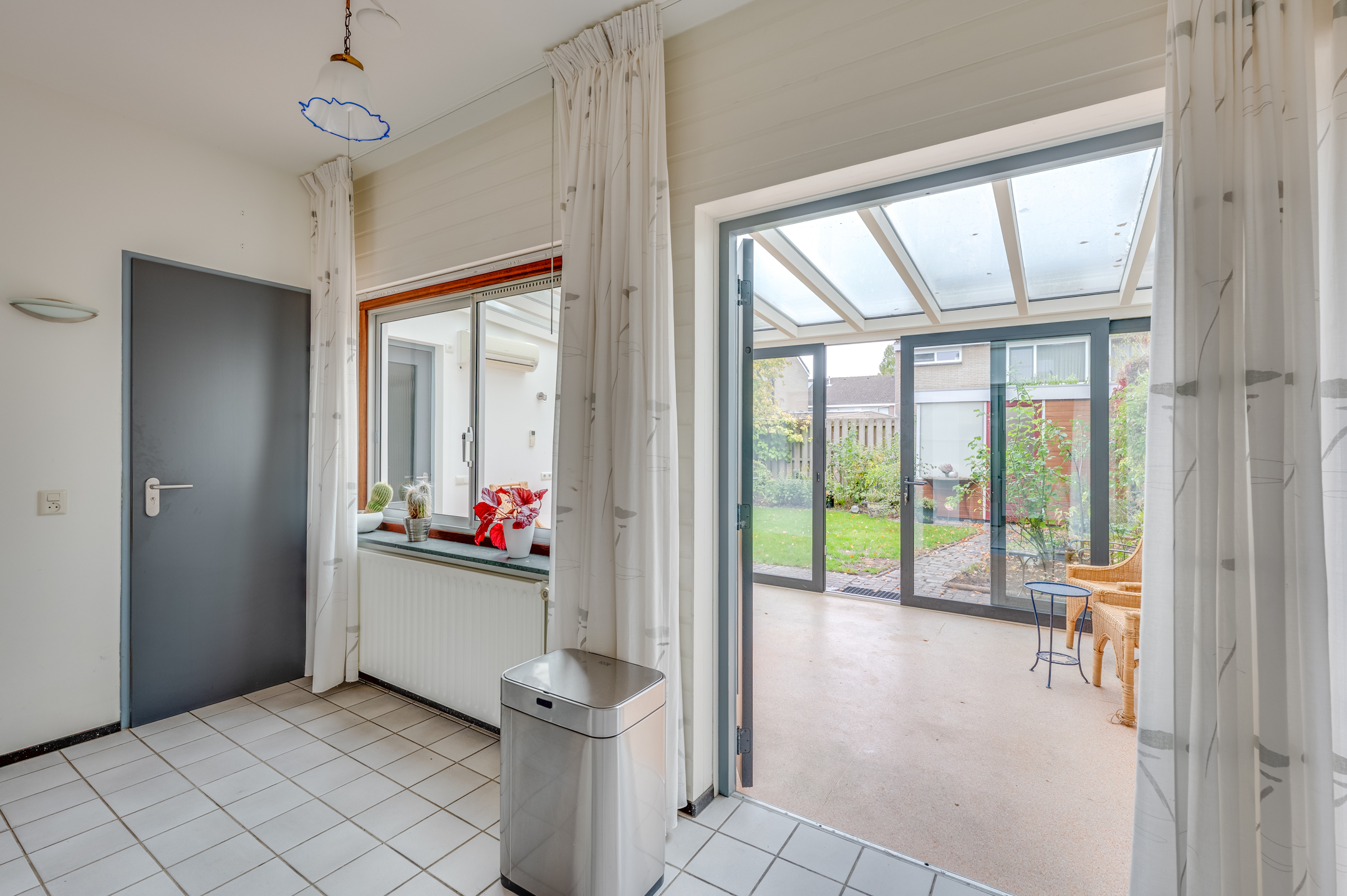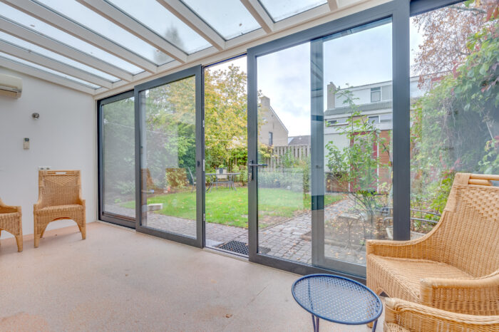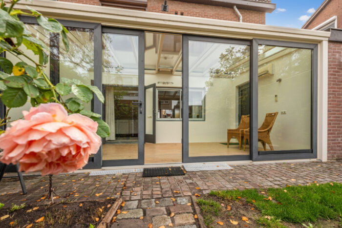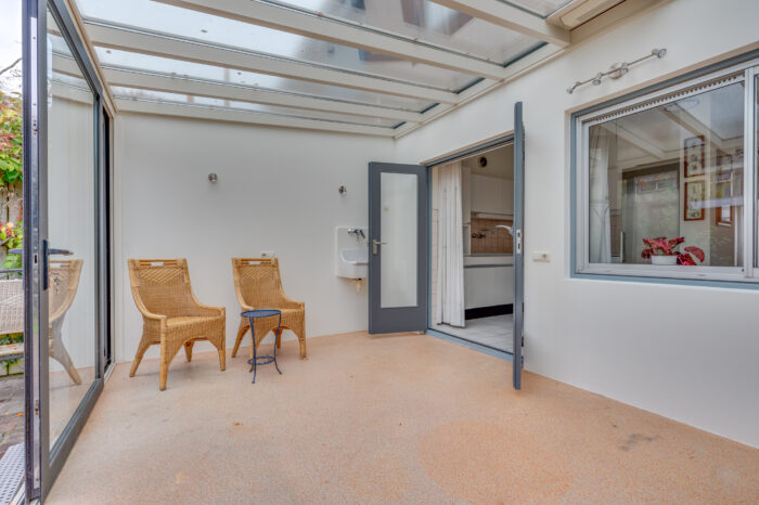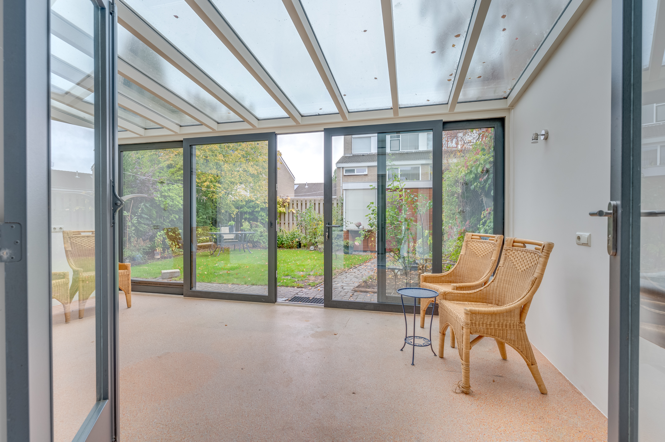 De serre is een fijne extra ruimte van ruim 15m2, die je het hele jaar door kunt gebruiken. Dankzij de airco blijft het hier in de zomer lekker koel. De ruimte is voorzien van elektriciteit, verlichting, en een koudwaterkraan met wasbak. De glazen dubbele schuifwand met HR++ dubbel glas zorgt voor veel lichtinval en een mooi uitzicht op de tuin. De dakconstructie bestaat uit glas en aluminium, wat zorgt voor een moderne uitstraling en goede isolatie. De muren zijn strak gestukt en geven de ruimte een nette afwerking. Vanuit de serre kun je binnendoor naar de garage.