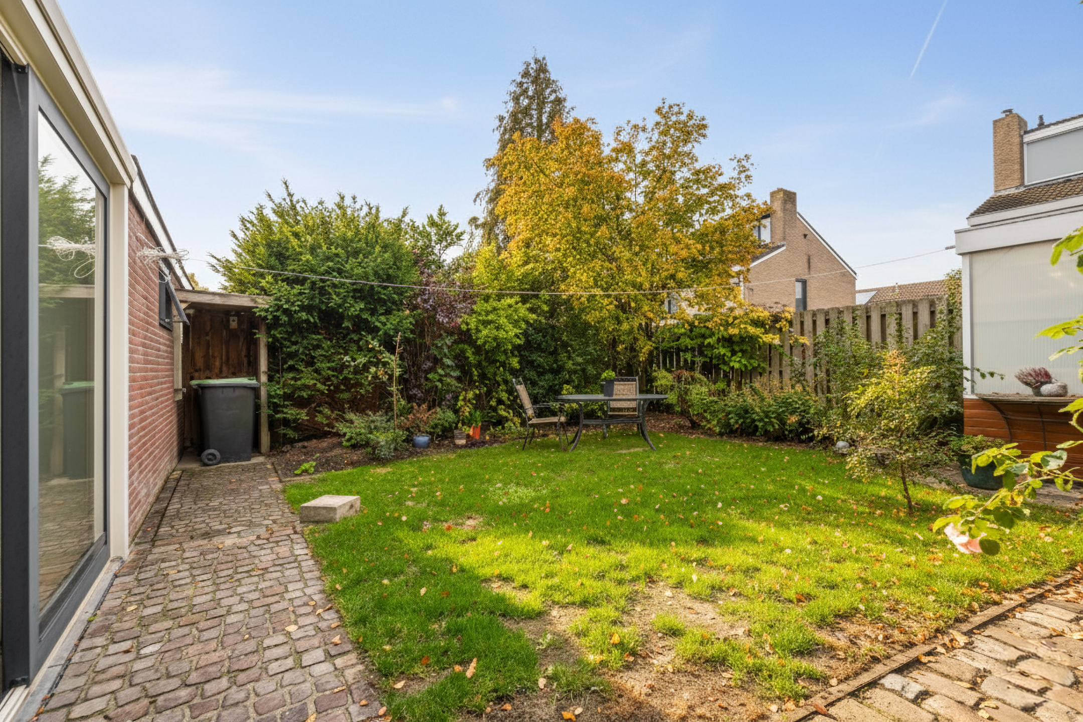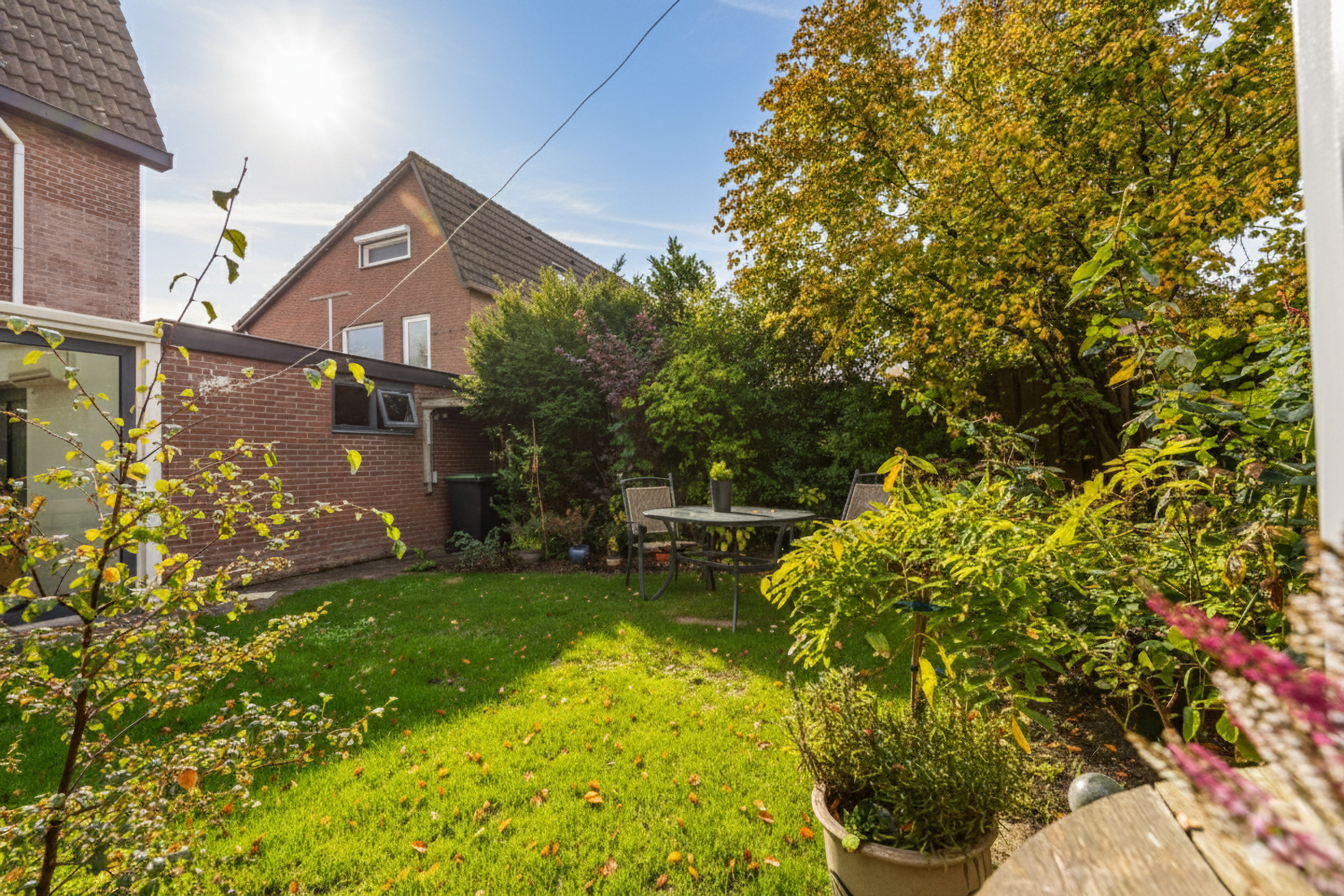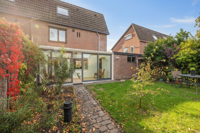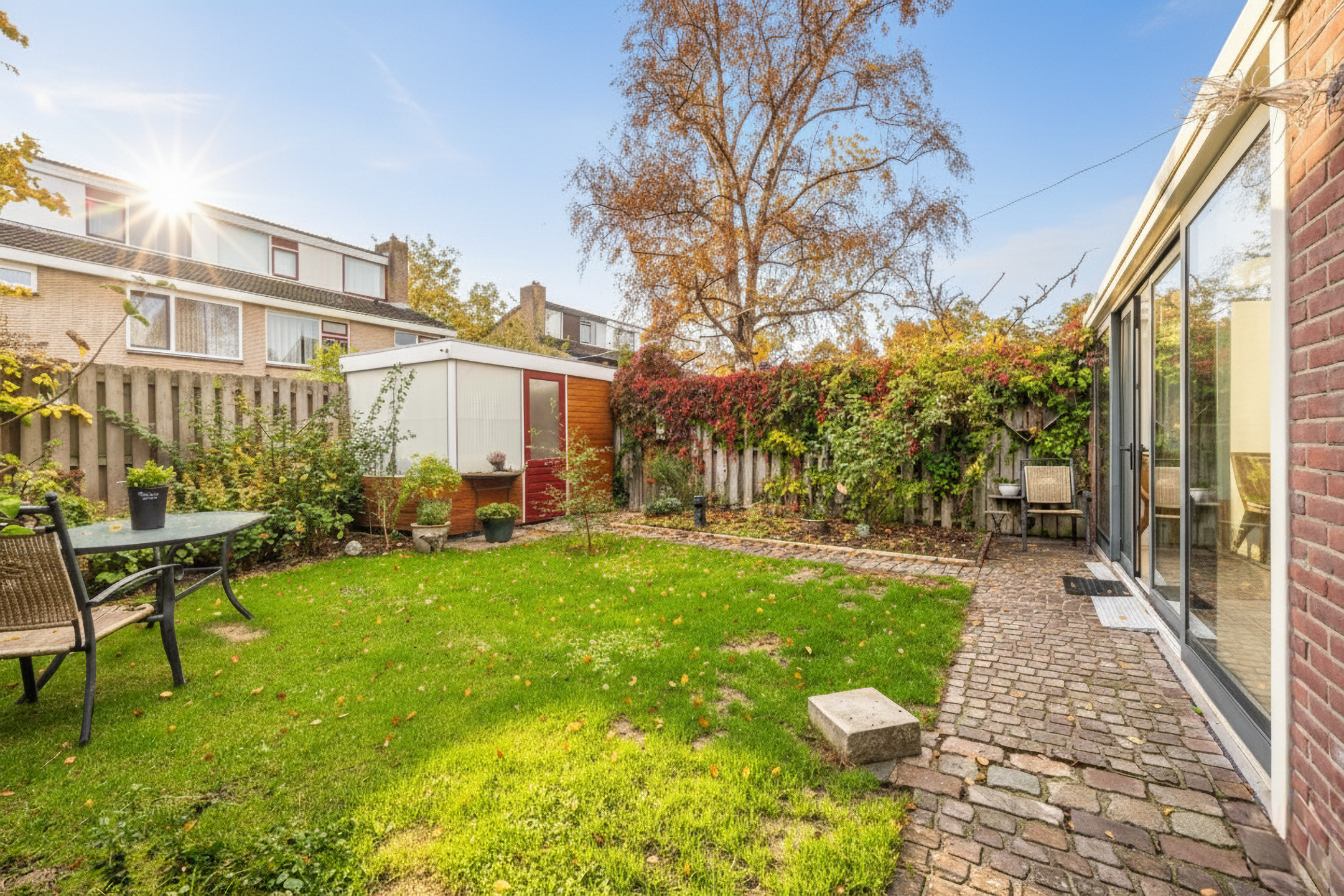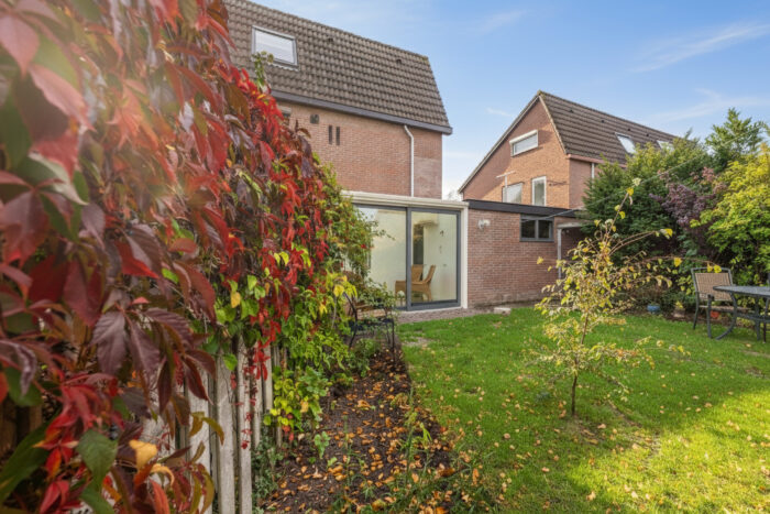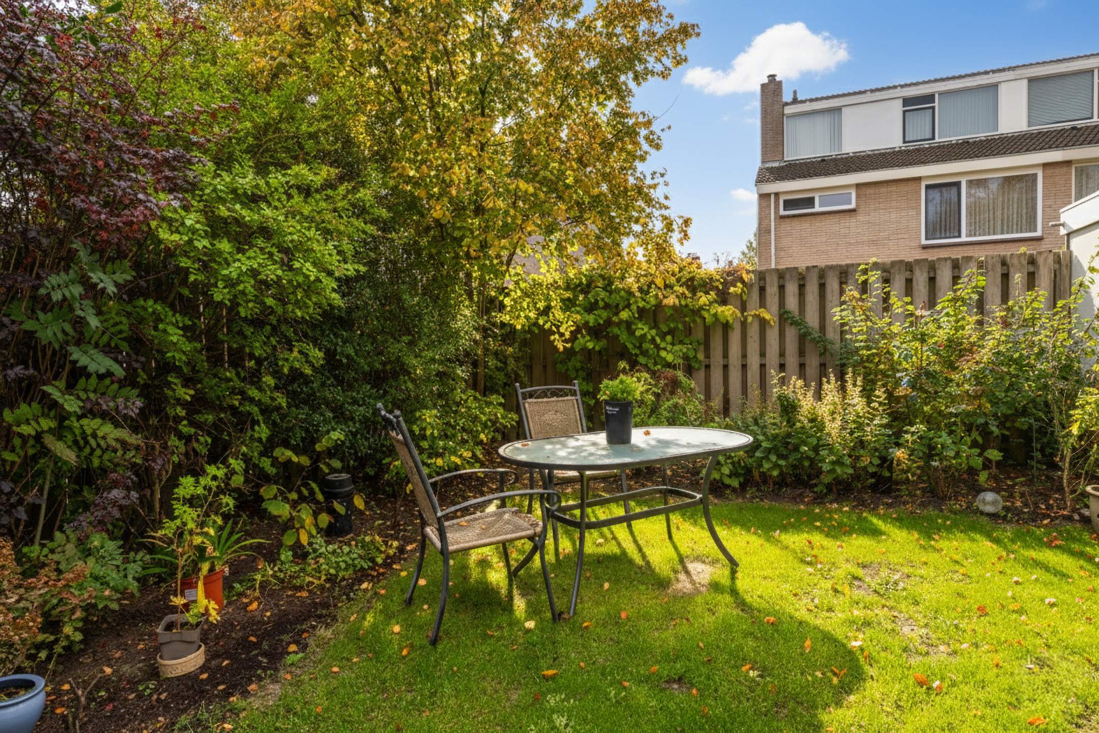 De achtertuin ligt op het zuidwesten, waardoor je hier volop kunt genieten van de middag- en avondzon. Je bereikt de tuin via de garage en vervolgens via de serre. Direct grenzend aan de serre ligt een strook terras. Vanaf hier loopt een pad richting de berging achterin de tuin. De berging is voorzien van elektriciteit en verlichting. Verder beschikt de tuin over een gazon en diverse beplanting. Tegen de garage is een afdakje geplaatst, handig voor het stallen van de containers. Rondom staat een schutting wat zorgt voor privacy en een veilige plek voor kinderen of huisdieren.