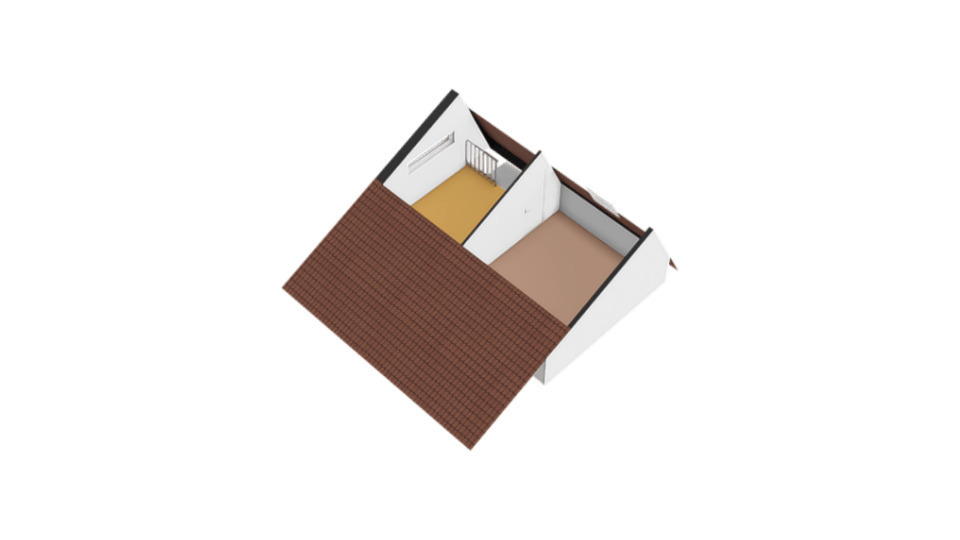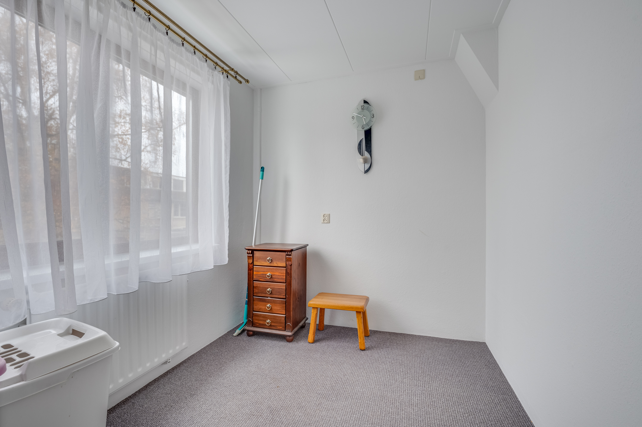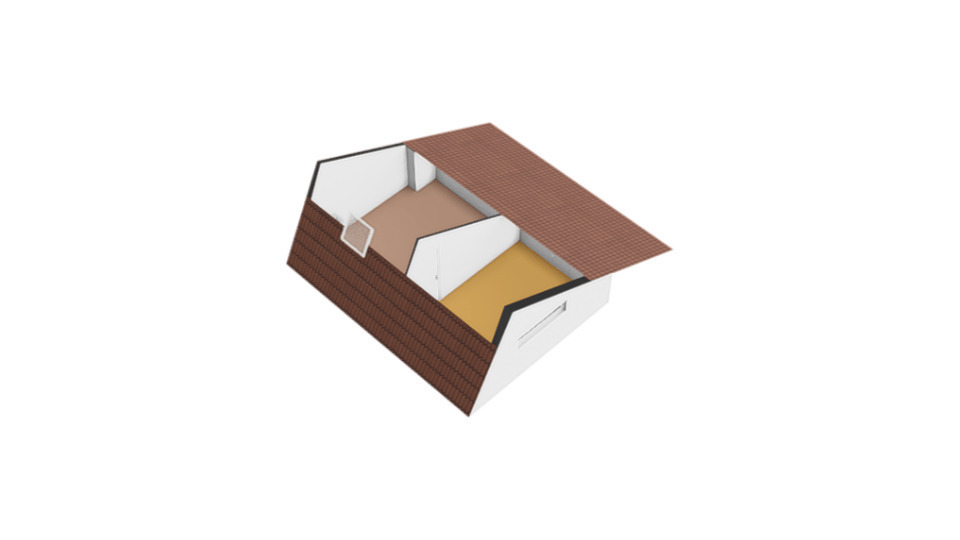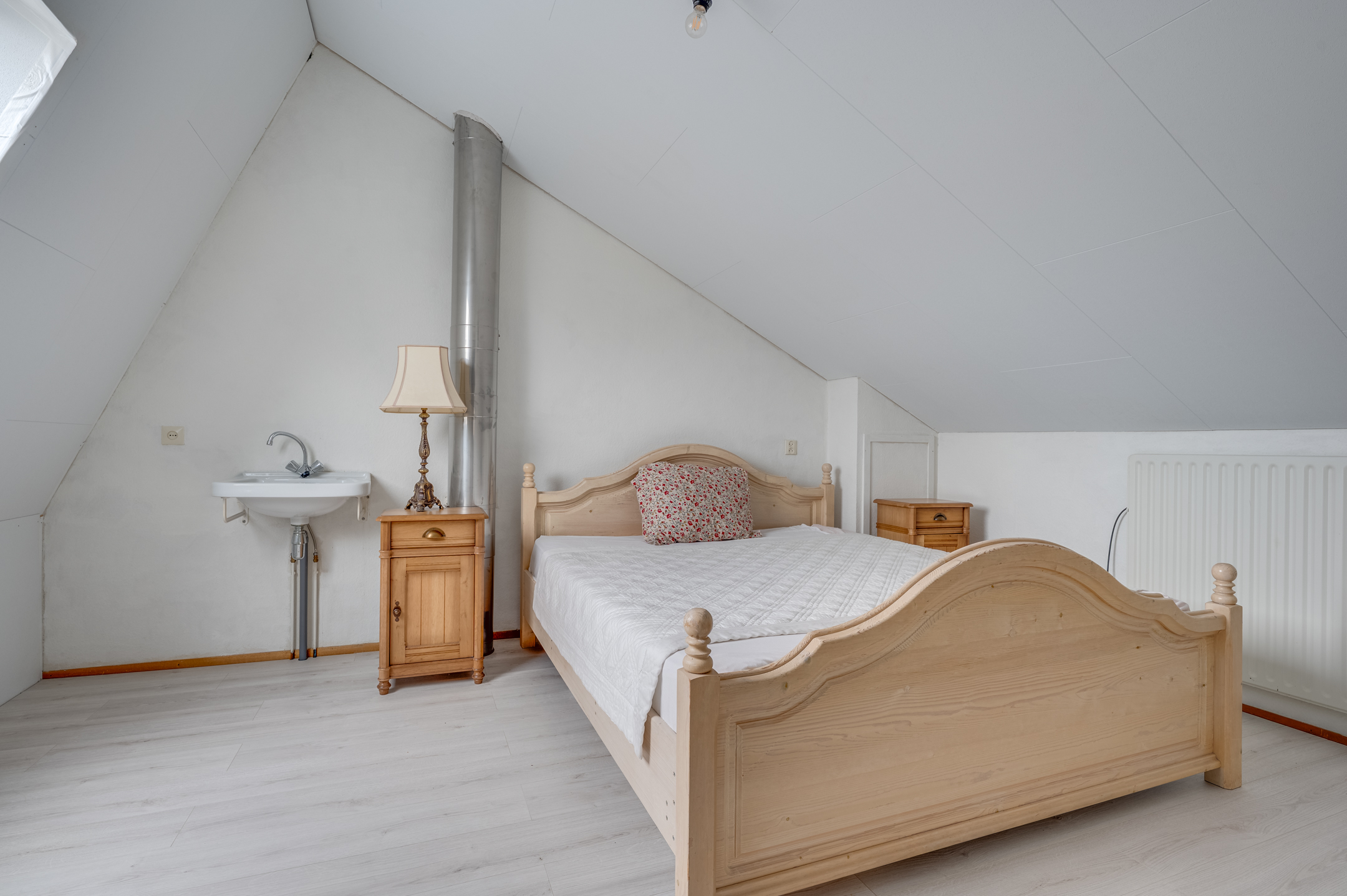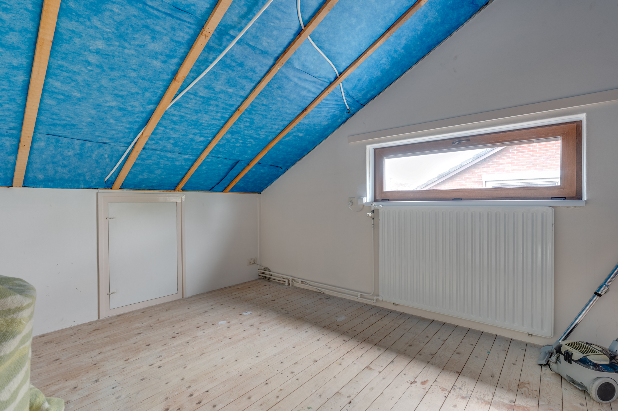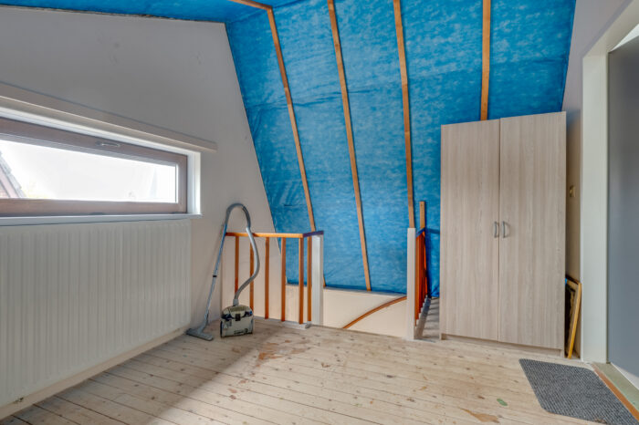 Een kleinere slaapkamer ligt aan de voorzijde van de zolderverdieping. Hier is een zijraam met triple glas en een elektrisch rolluik. Het dak is al geïsoleerd, maar nog niet helemaal afgewerkt. De vloer bestaat uit houten vloerdelen, met daaronder een betonvloer. Vanuit deze kamer heb je toegang tot een bergruimte achter een schot, die zich uitstrekt over de volledige lengte van het huis.