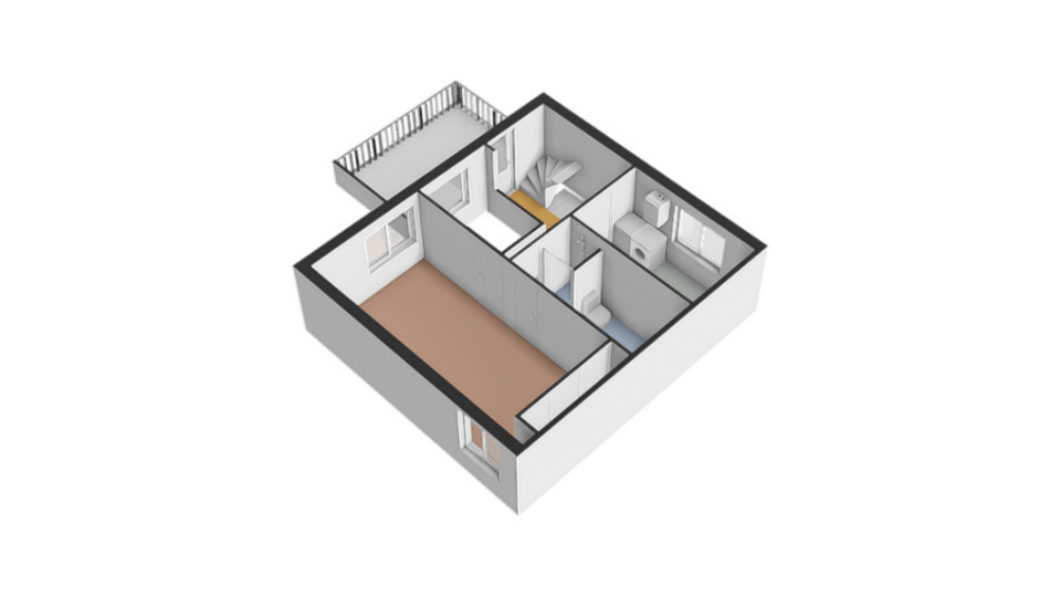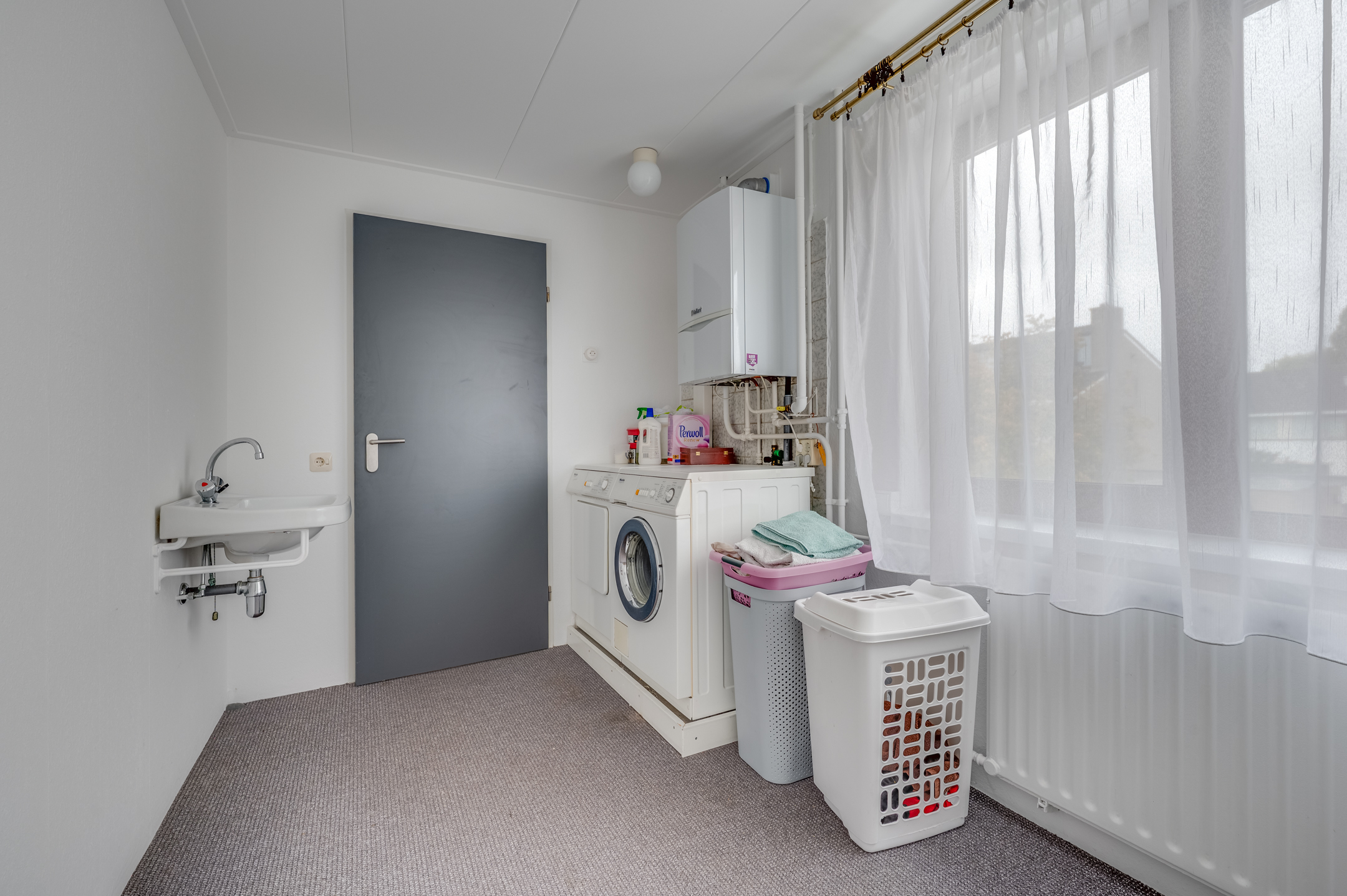 Aan de achterzijde van de woning bevindt zich een slaapkamer die ook dienst kan doen als wasruimte. Hier zijn de aansluitingen voor de wasmachine en droger, en je vindt er de cv-ketel. Er is ook een wastafel aanwezig.