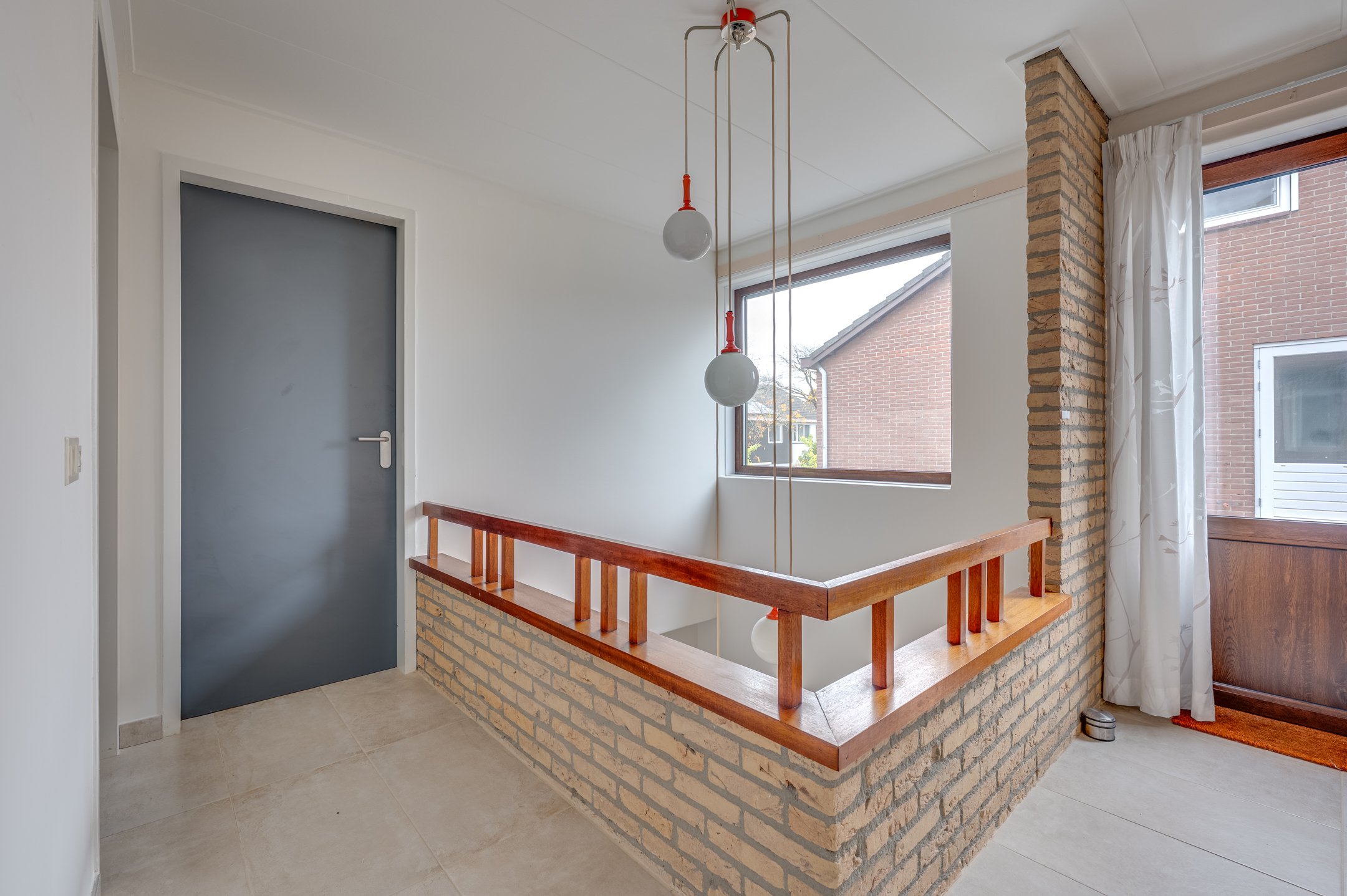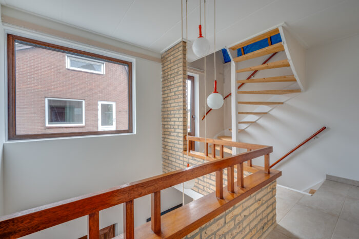 Via de trap in de hal kom je op een ruime overloop. Dankzij het grote raam is deze ruimte lekker licht. De tegelvloer zorgt voor een nette en onderhoudsvriendelijke afwerking. Vanaf de overloop kijk je uit op de vide en vanaf hier heb je toegang tot twee slaapkamers en de badkamer. Via de overloop heb je ook toegang tot het dakterras, een prima plek voor een zitje in de zon of om de was te laten drogen.