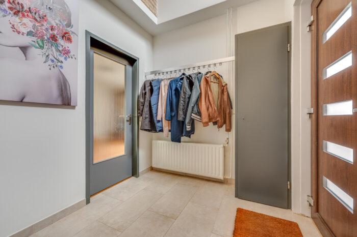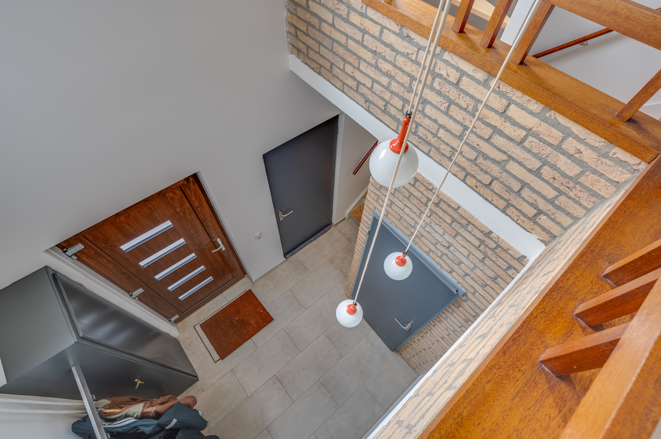 Via de ruime voortuin en de eigen oprit kom je bij de (overdekte) voordeur, die zich aan de zijkant van de woning bevindt. Je stapt binnen in een lichte en ruime hal, die extra hoog is door de vide. Dit geeft meteen een open en ruimtelijk gevoel. In de hal vind je de garderobe, het toilet, de meterkast, de trap naar boven, en de toegang tot de woonkamer. Ook kun je vanuit de hal direct naar de garage. De muren zijn recent gestukt en zien er strak uit en op de vloer ligt een nette tegelvloer.