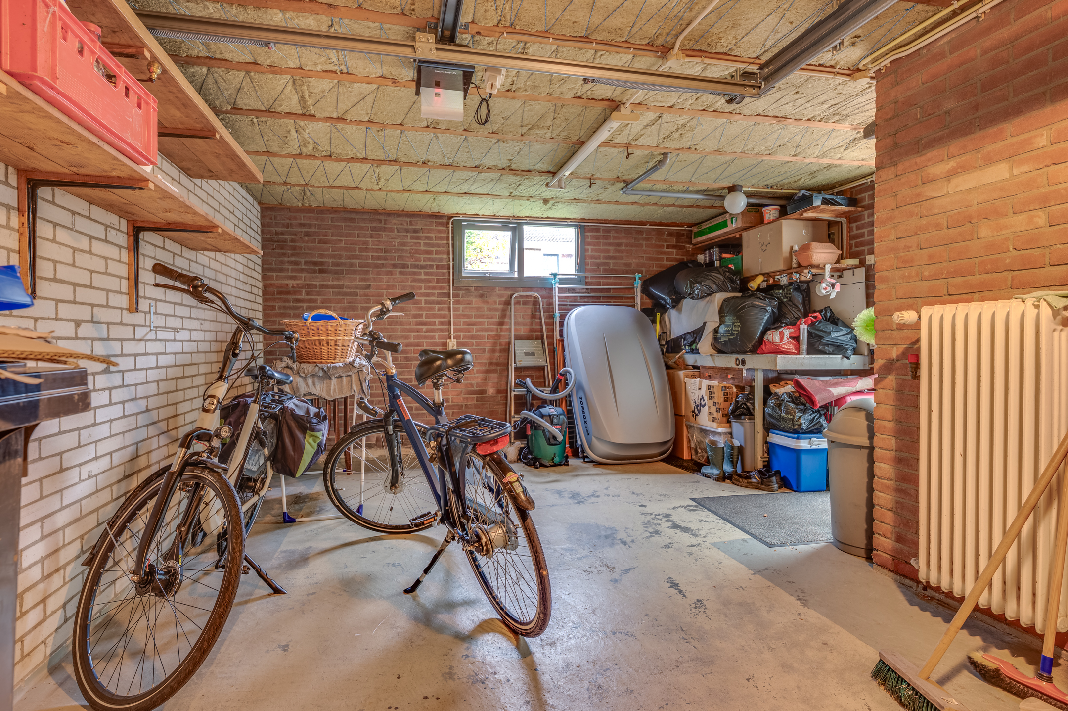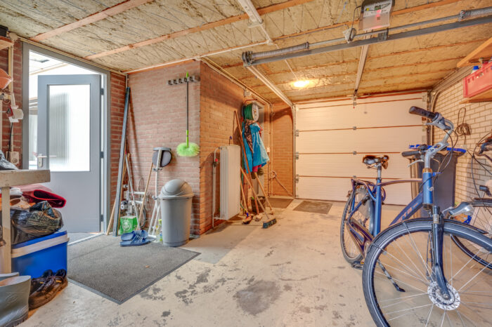 De garage is aangebouwd aan de woning en is zowel van binnenuit bereikbaar via de hal, als via de elektrische geïsoleerde garagedeur aan de voorzijde. Het is een royale garage met ruimte voor zowel opslag als het parkeren van een auto. De garage is voorzien van dakisolatie, elektriciteit en water, en hier bevindt zich ook de pomp voor de vloerverwarming. Aan de achterzijde zit een kiepraam, wat zorgt voor daglicht en ventilatie. Daarnaast is er een deur naar de serre, waardoor je gemakkelijk toegang hebt tot de tuin.