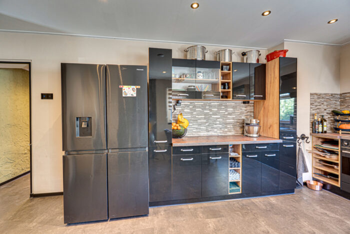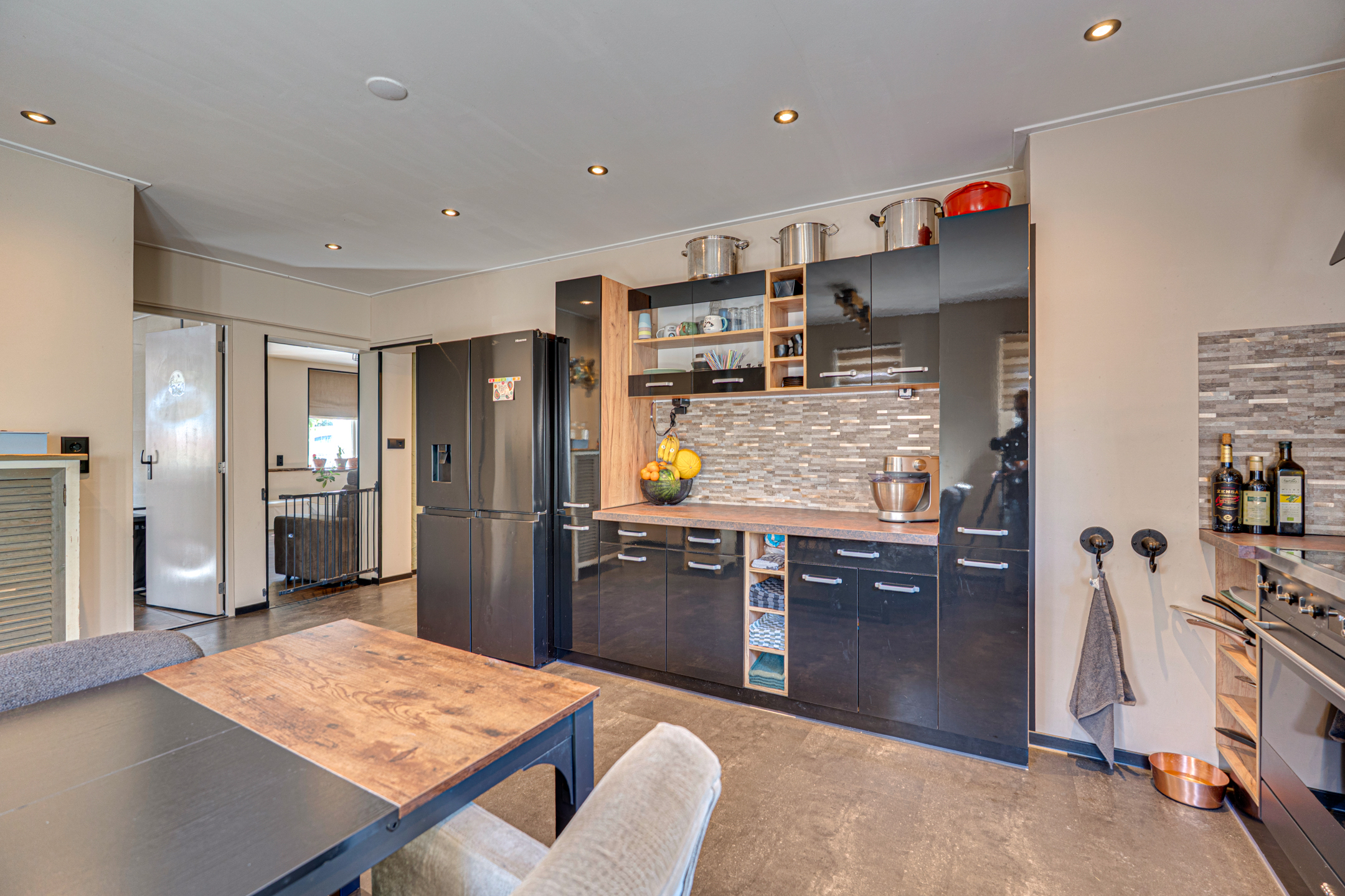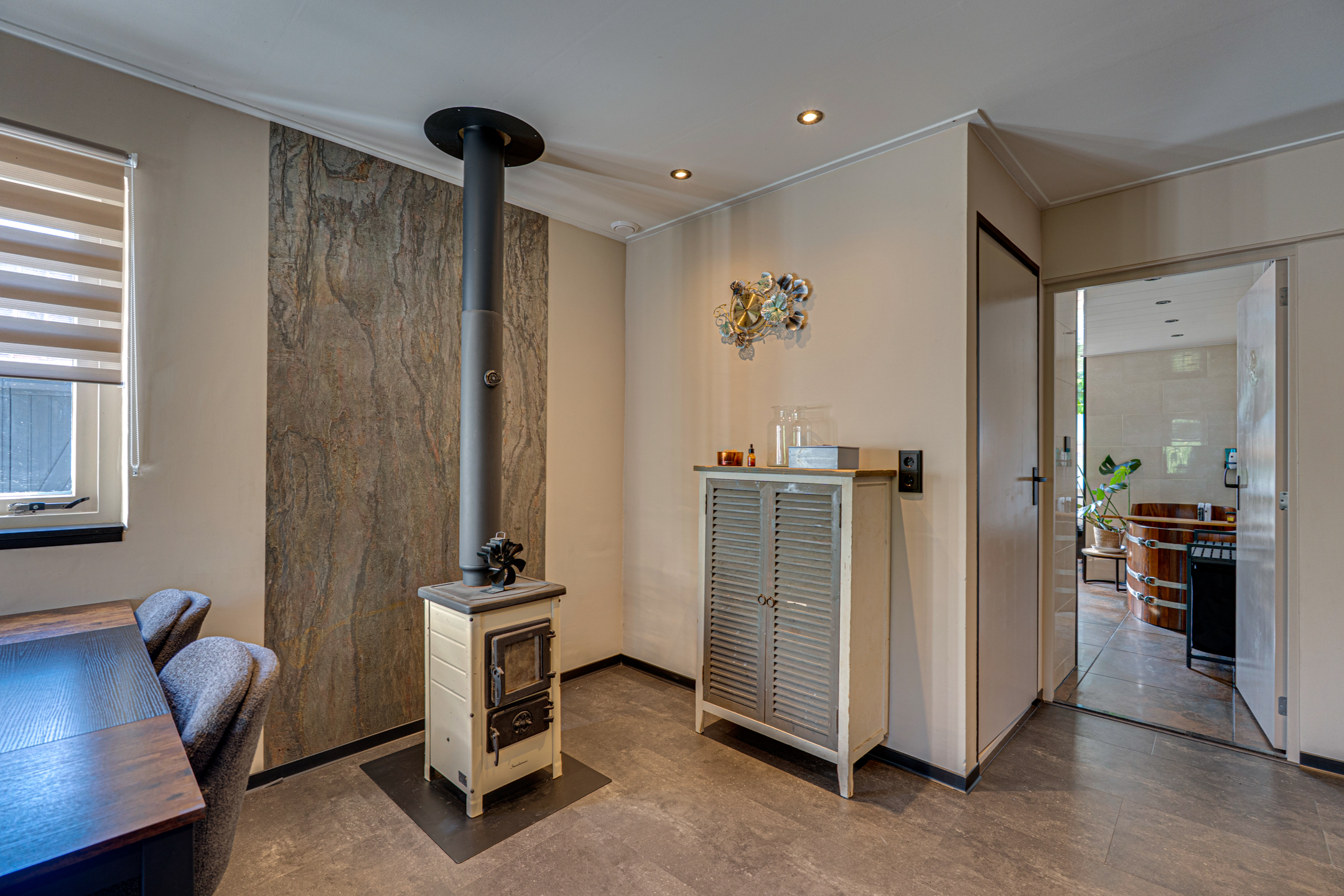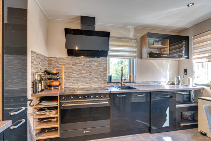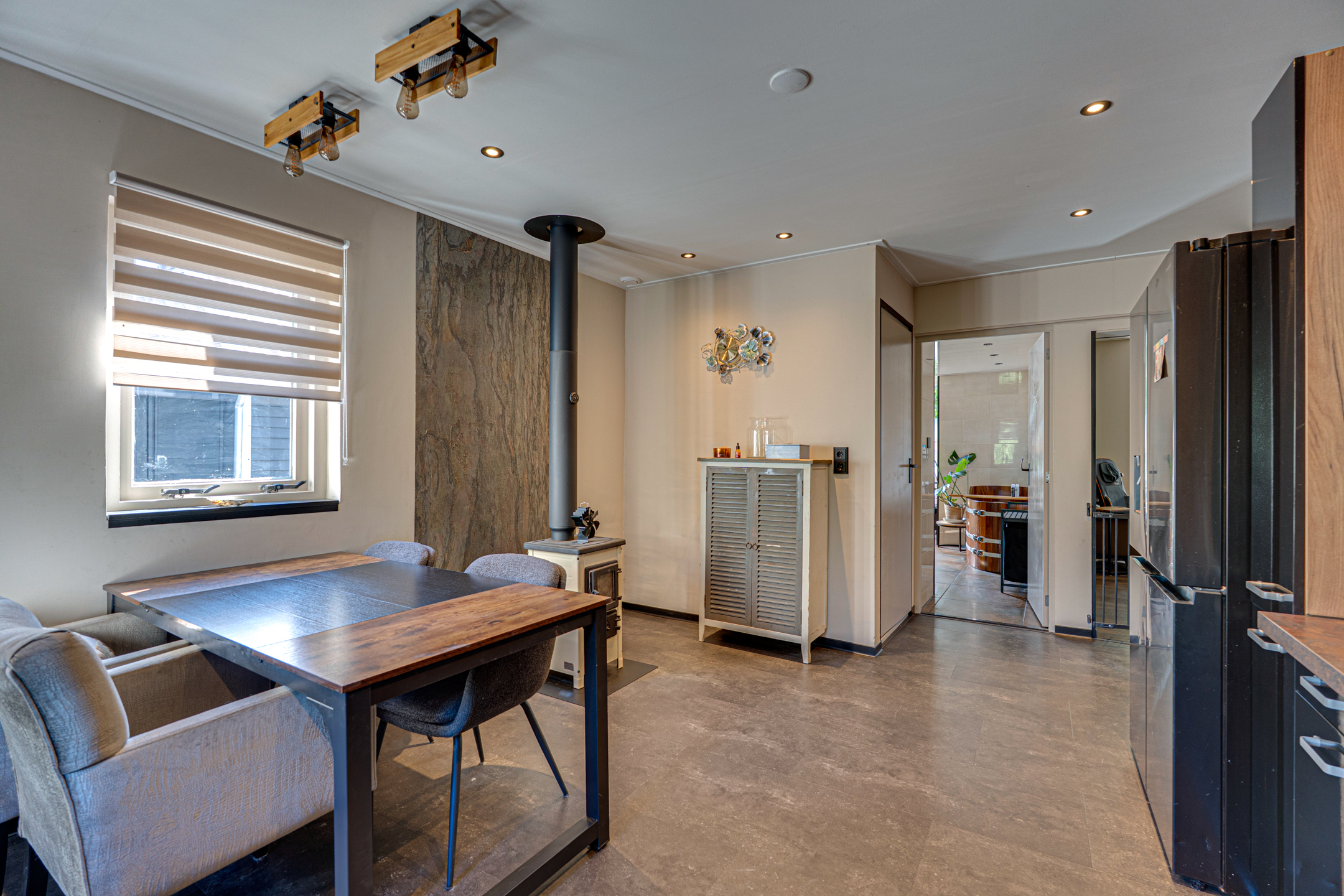 De woonkeuken is ruim en hier geniet je van veel licht. Hier is volop plek om uitgebreid te koken en samen te eten. Dankzij de indeling is er voldoende ruimte voor een eettafel. De keuken is uitgevoerd in een L-opstelling en van alle gemakken voorzien: grote oven, een afzuigkap, een 5-pits inductiekookplaat, een spoelbak met kunststof werkblad, een vaatwasser en een vrijstaande koelvriescombinatie. Daarnaast is er een handige koffiecorner met apothekerskasten voor extra bergruimte. De keuken is voorzien van spotjes in het plafond die zorgen voor fijne verlichting. Een leuk detail is de houtkachel, die extra sfeer toevoegt aan deze fijne plek in huis.