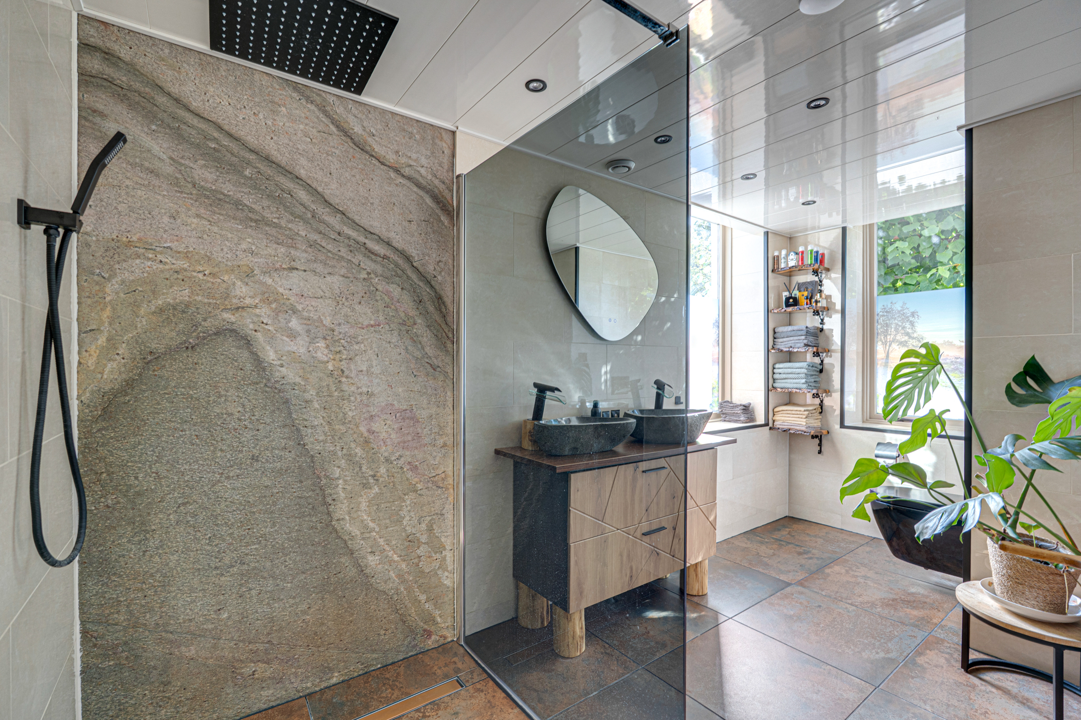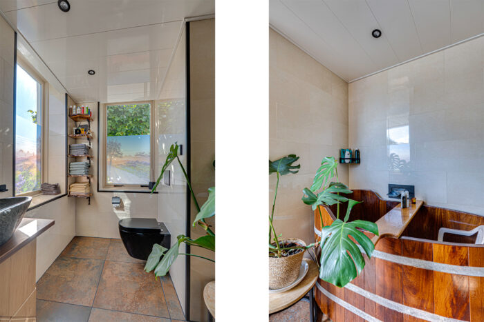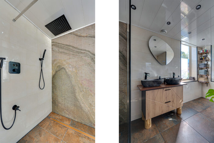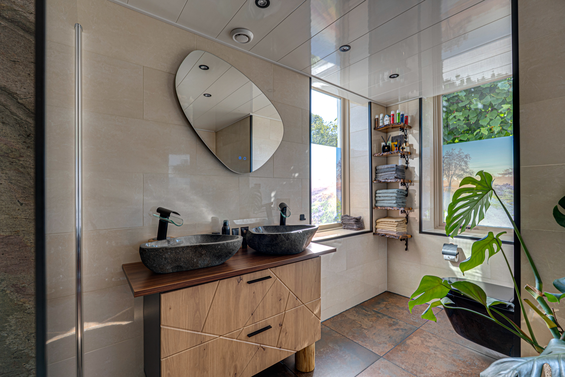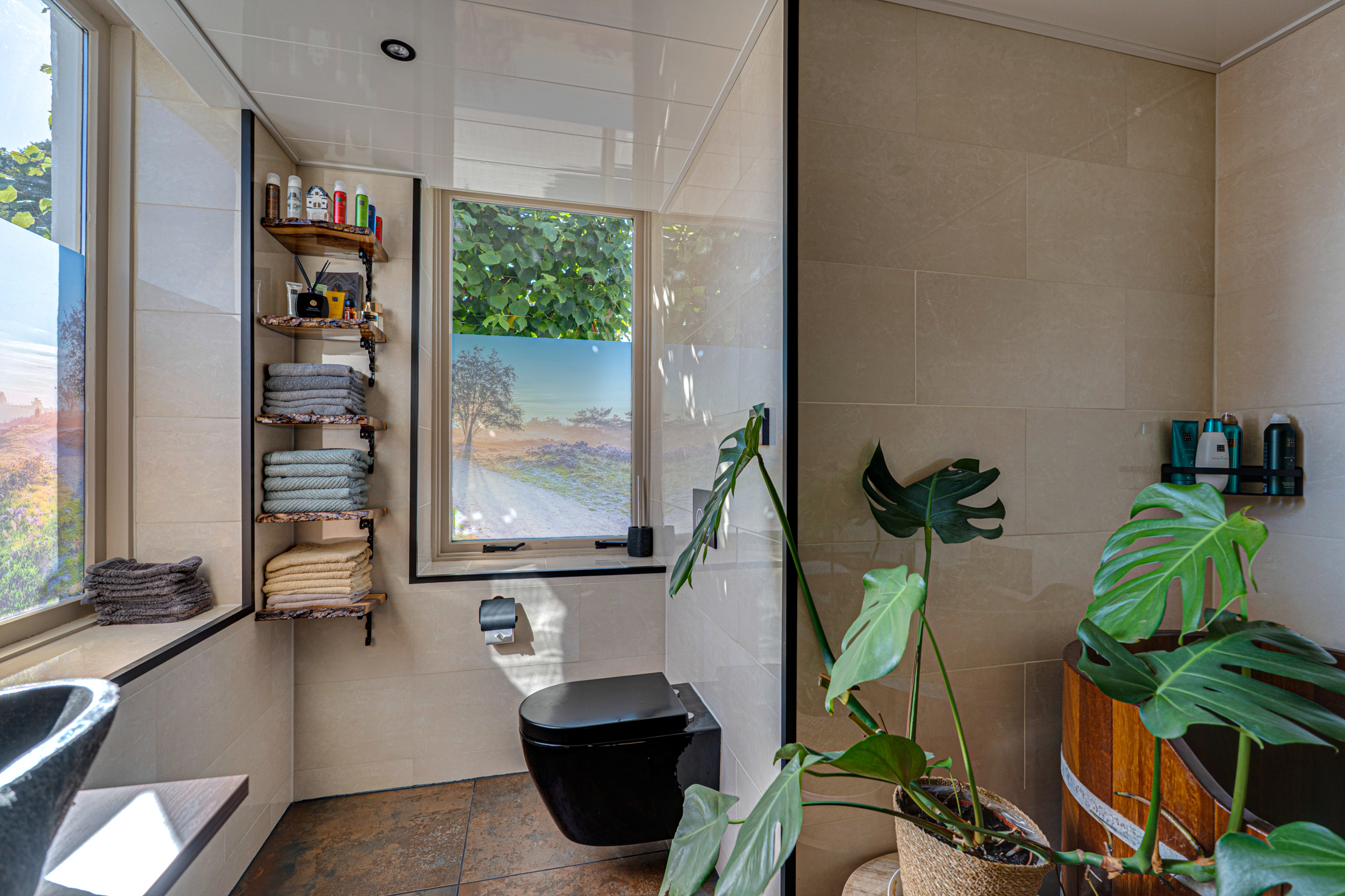 Ook vinden we op de begane grond de moderne en comfortabel ingerichte badkamer, deze is voorzien van een inloopdouche, een wastafelmeubel met dubbele waskommen, een zitbad en een toilet. De ruimte is voorzien van een tegelvloer met elektrische vloerverwarming, waardoor het hier altijd behaaglijk aanvoelt. Het kunststof plafond met spotjes zorgt voor een strakke afwerking en goede verlichting. Daarnaast is er zowel mechanische ventilatie als natuurlijke ventilatie via het raam.
