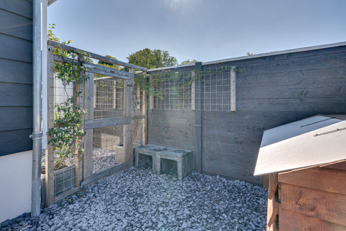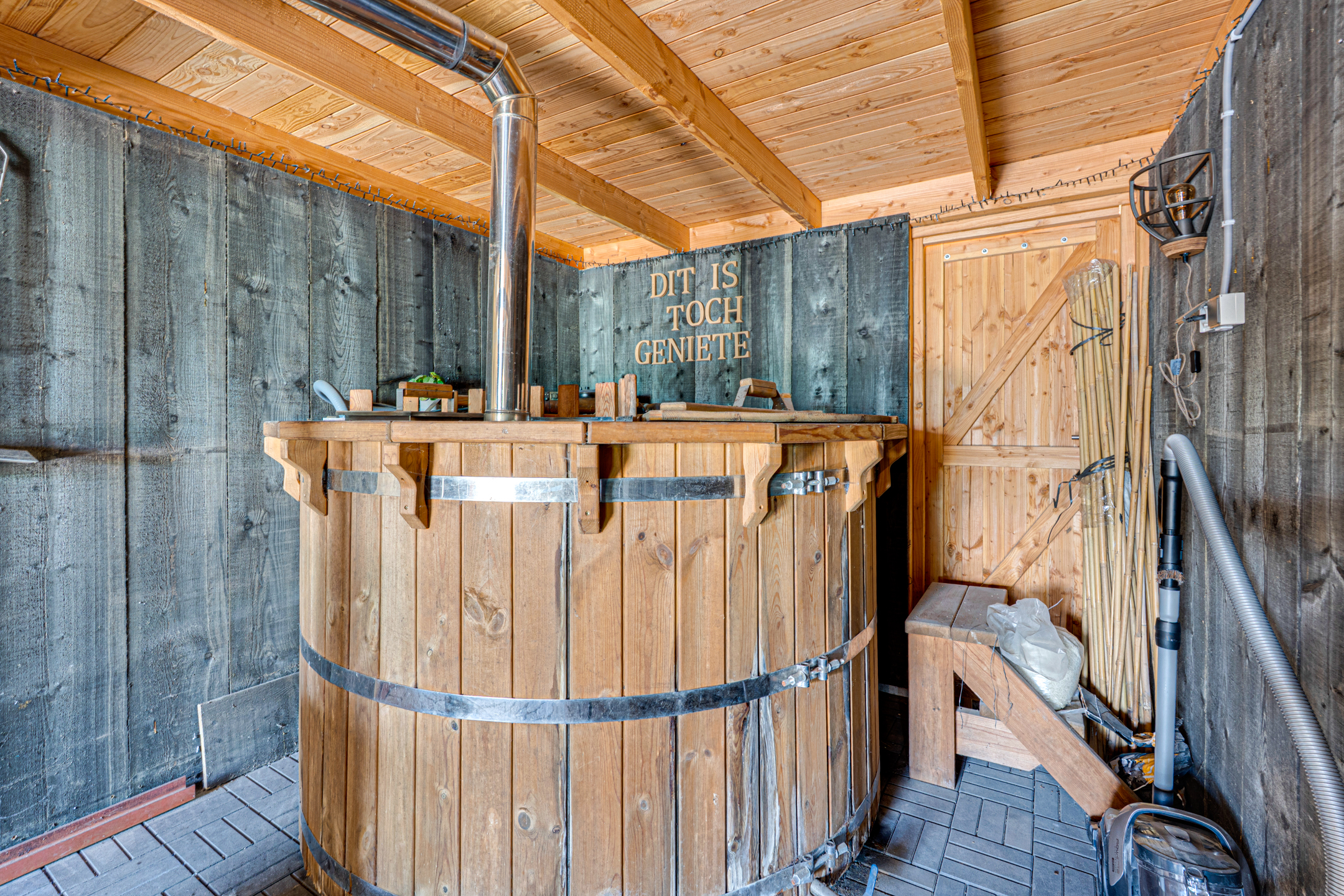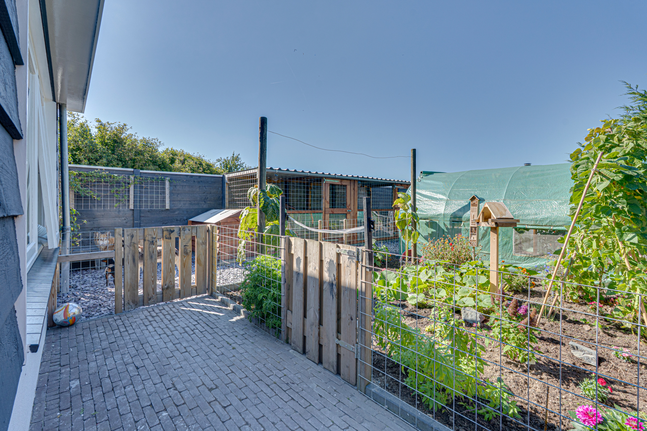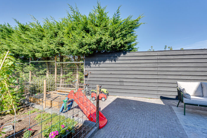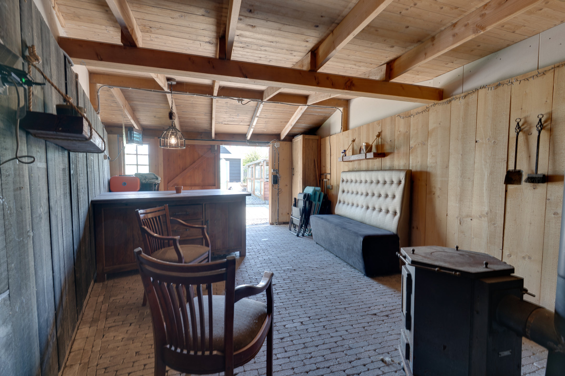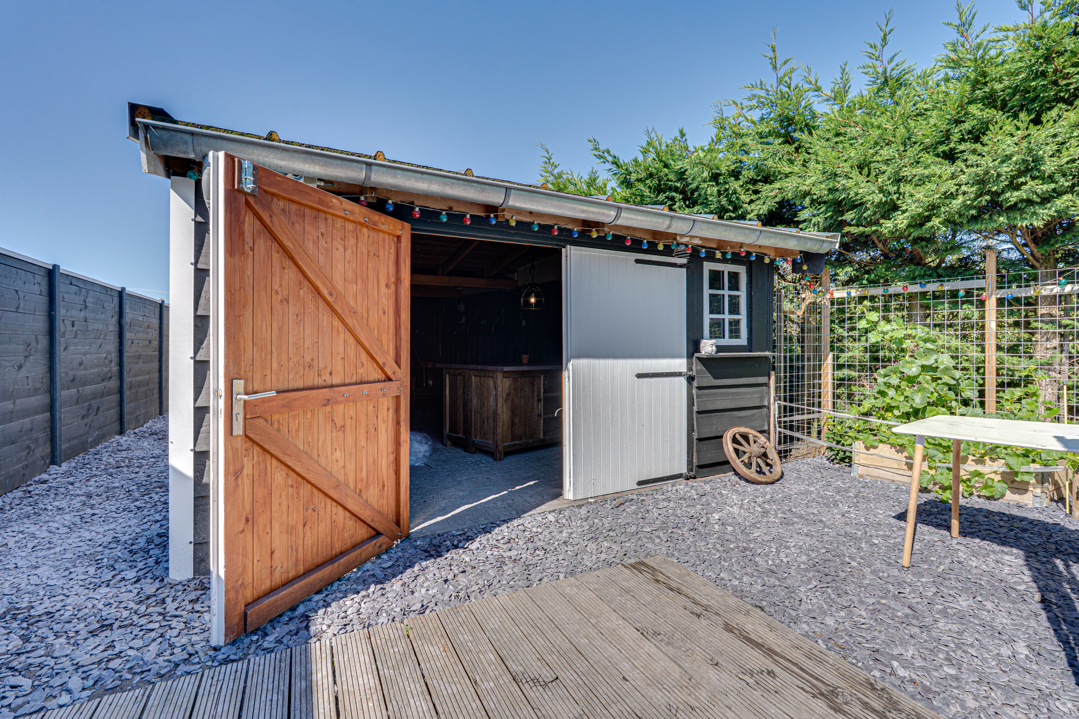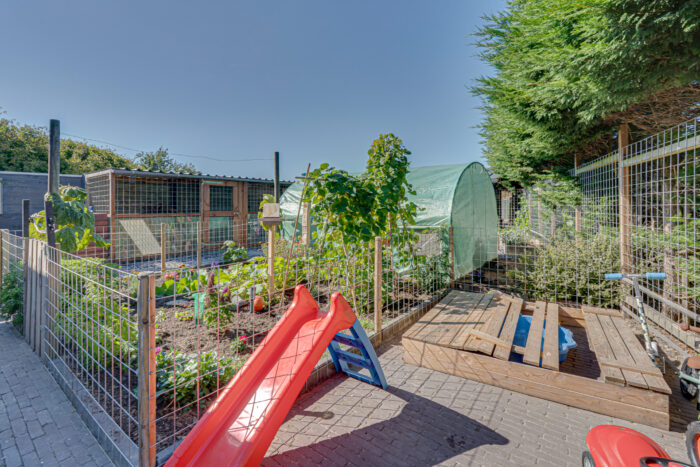 De achtertuin is een echt pluspunt. Royale afmetingen, en gelegen op het zuidwesten. Hier kun je de hele dag van de zon profiteren. Dankzij de verschillende terrassen is er altijd een fijn plekje om te zitten. Verder is er een moestuin en een kippenren. Achter in de tuin staat een vrijstaand houten tuinhuis voorzien van een gezellige hottub. “Dat is toch geniete”. Het tuinhuis biedt vele mogelijkheden. Het is bijvoorbeeld in te richten met een zithoek, buitenkeuken of zelfs een bar. Achter het tuinhuis ligt bovendien nog een extra stuk tuin dat multifunctioneel te gebruiken is.
