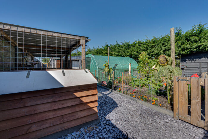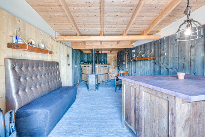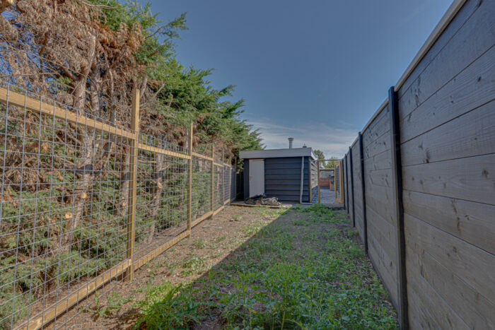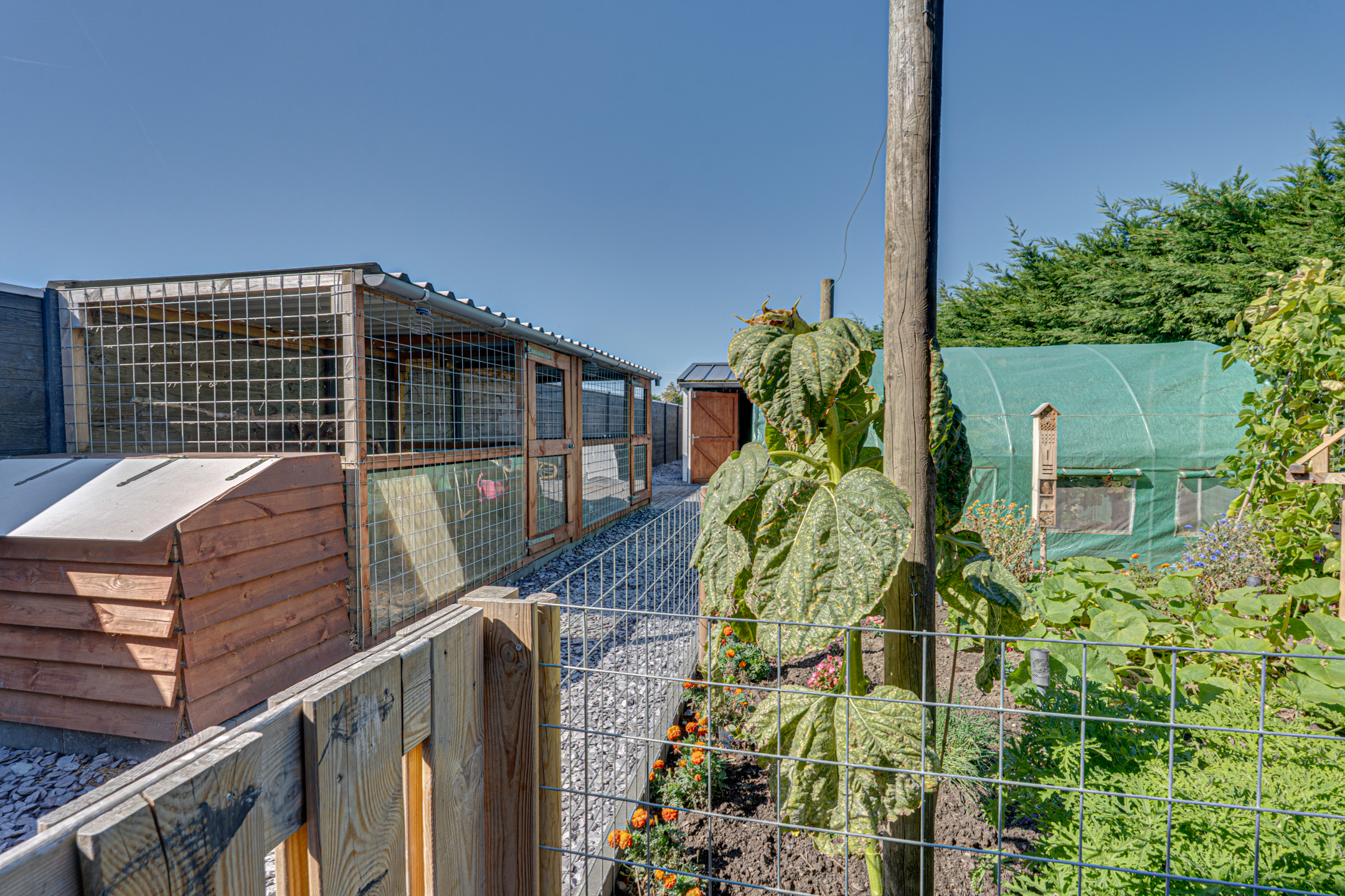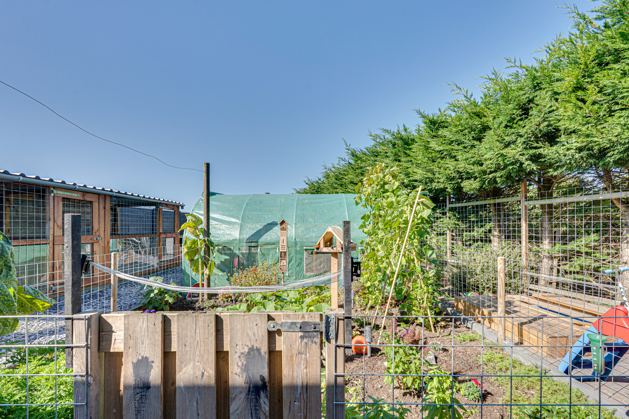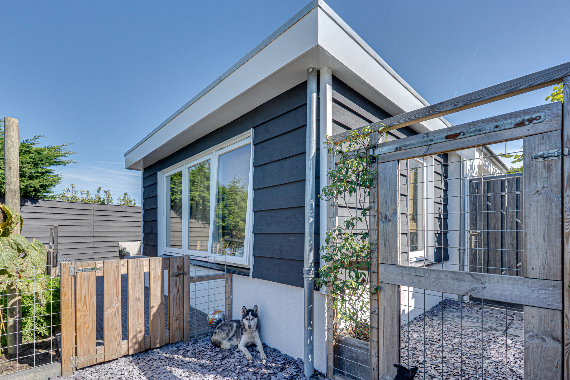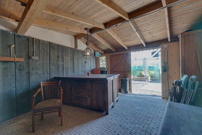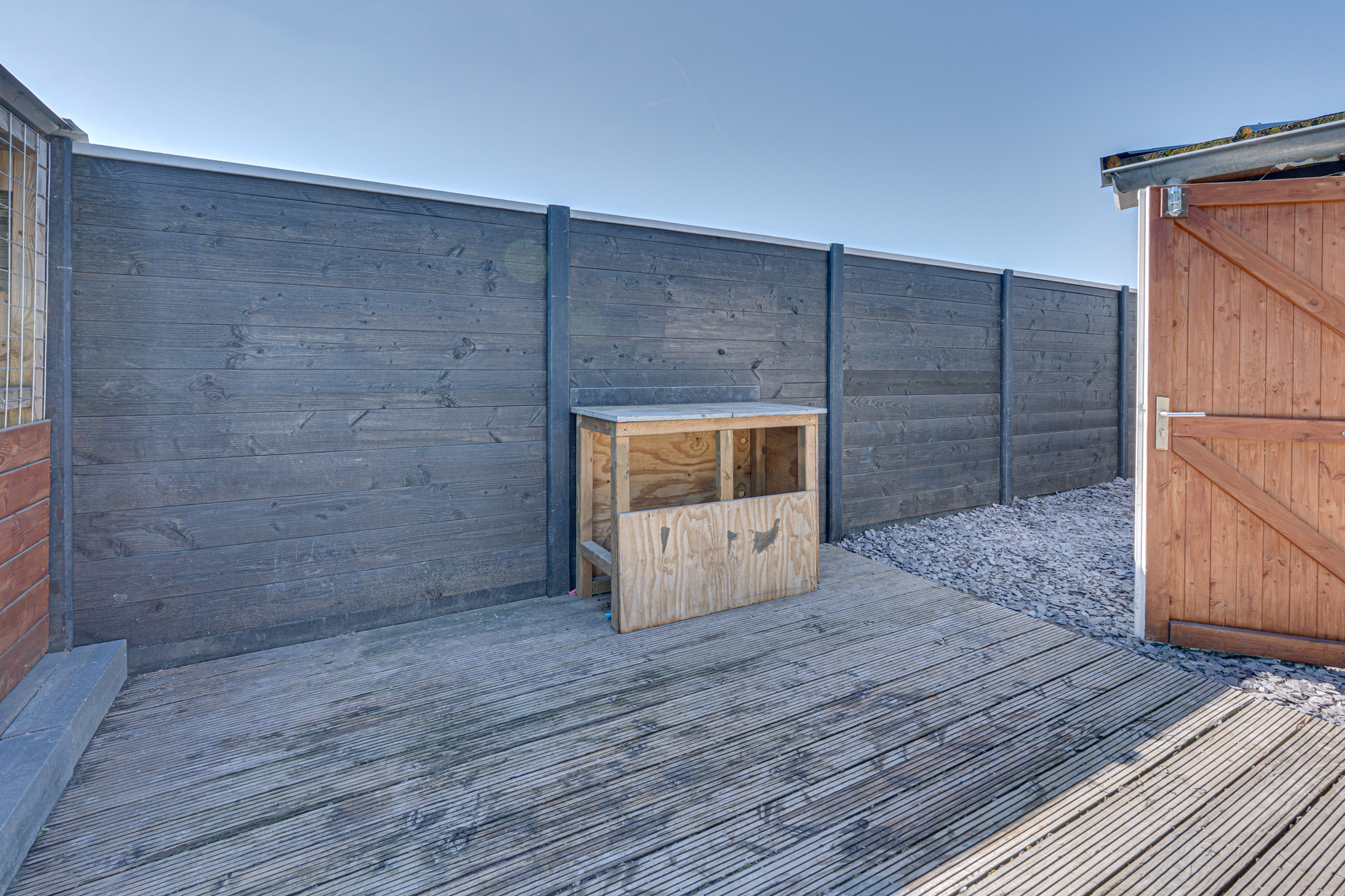 De achtertuin is een echt pluspunt. Royale afmetingen, en gelegen op het zuidwesten. Hier kun je de hele dag van de zon profiteren. Dankzij de verschillende terrassen is er altijd een fijn plekje om te zitten. Verder is er een moestuin en een kippenren. Achter in de tuin staat een vrijstaand houten tuinhuis voorzien van een gezellige hottub. “Dat is toch geniete”. Het tuinhuis biedt vele mogelijkheden. Het is bijvoorbeeld in te richten met een zithoek, buitenkeuken of zelfs een bar. Achter het tuinhuis ligt bovendien nog een extra stuk tuin dat multifunctioneel te gebruiken is.
