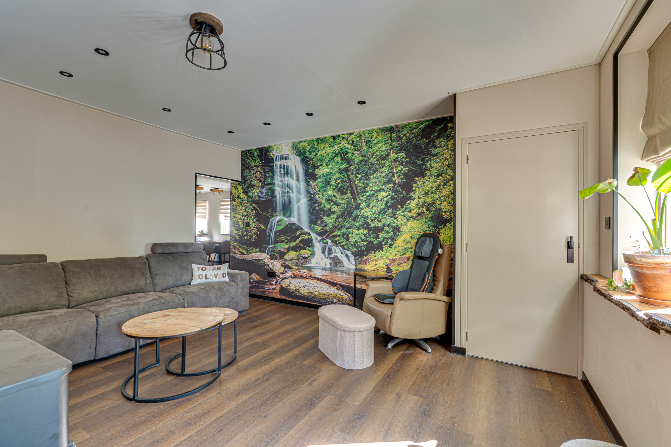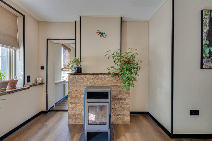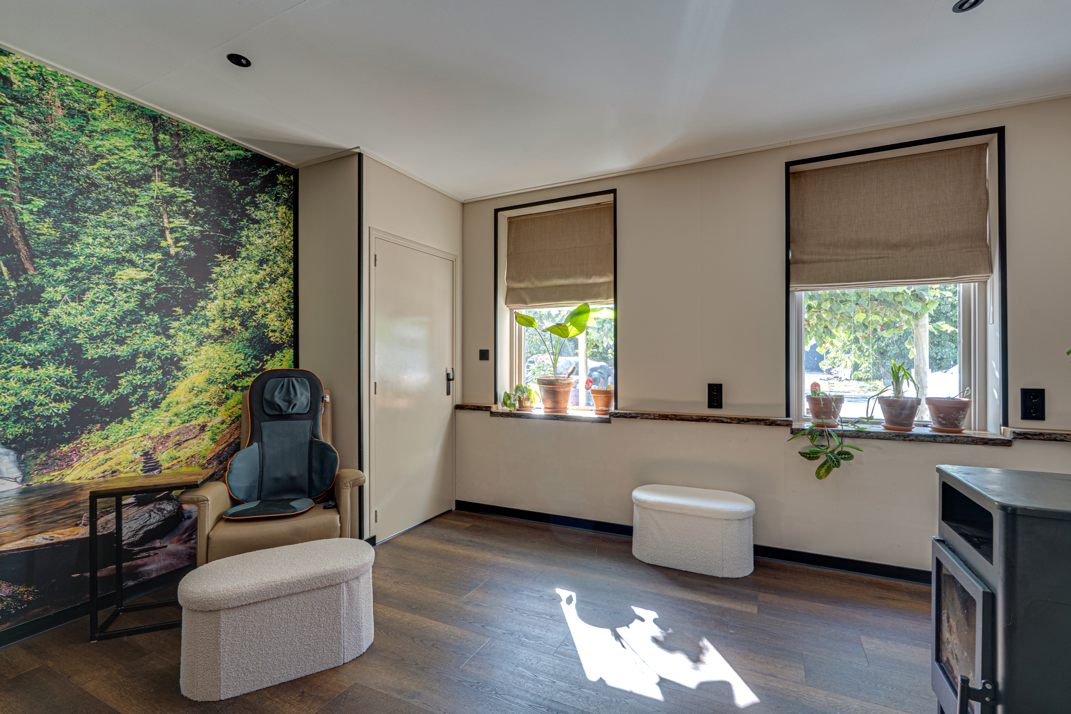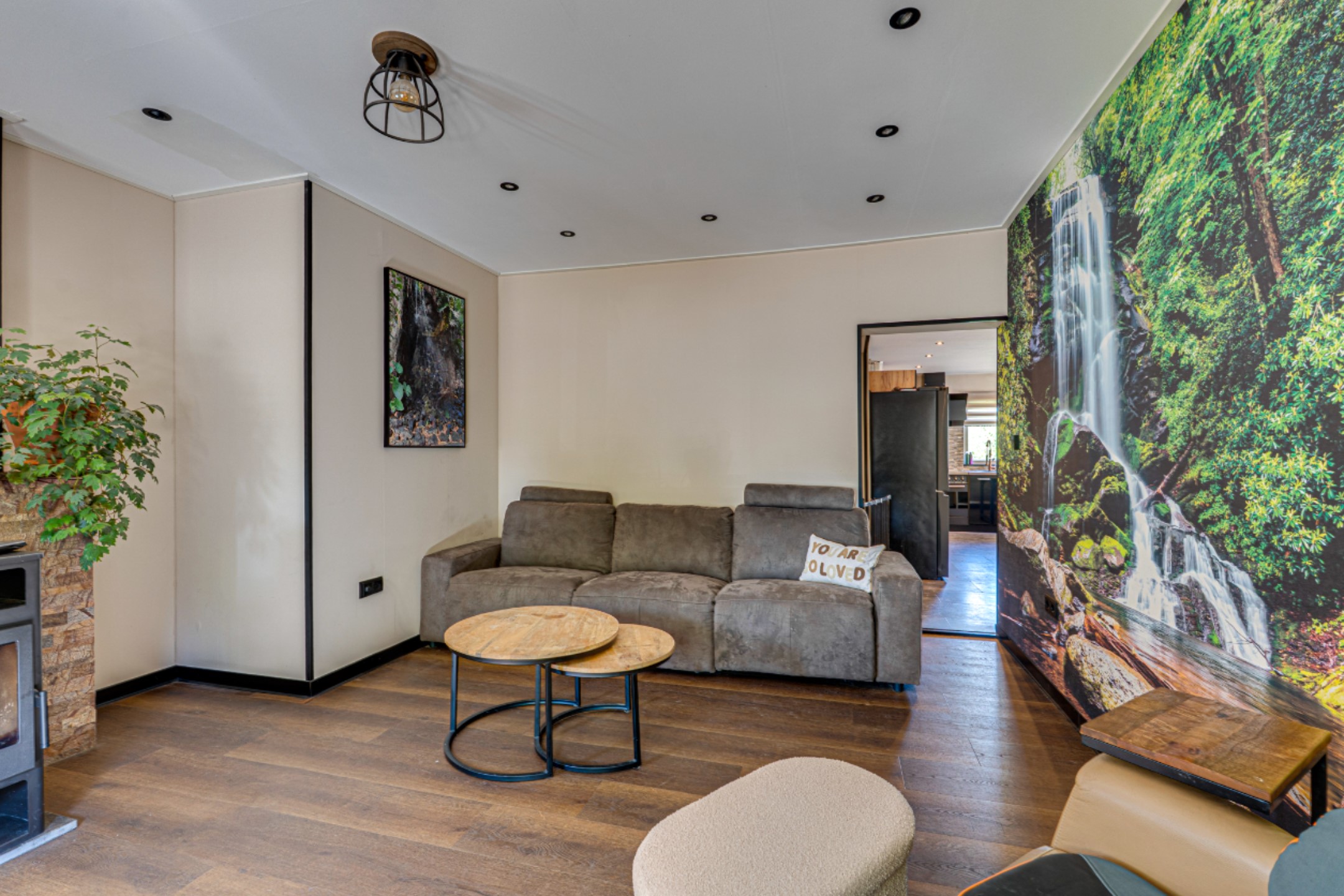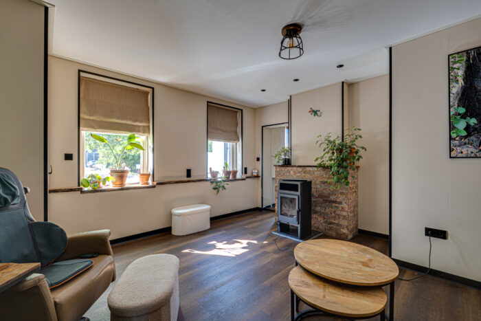 De woonkamer straalt gezelligheid uit en heeft een fijne lichtinval. De houtkachel zorgt daarnaast voor extra warmte en sfeer tijdens de koudere maanden. Vanuit de woonkamer kijk je uit over de weg en heb je directe toegang tot een slaapkamer en de keuken.