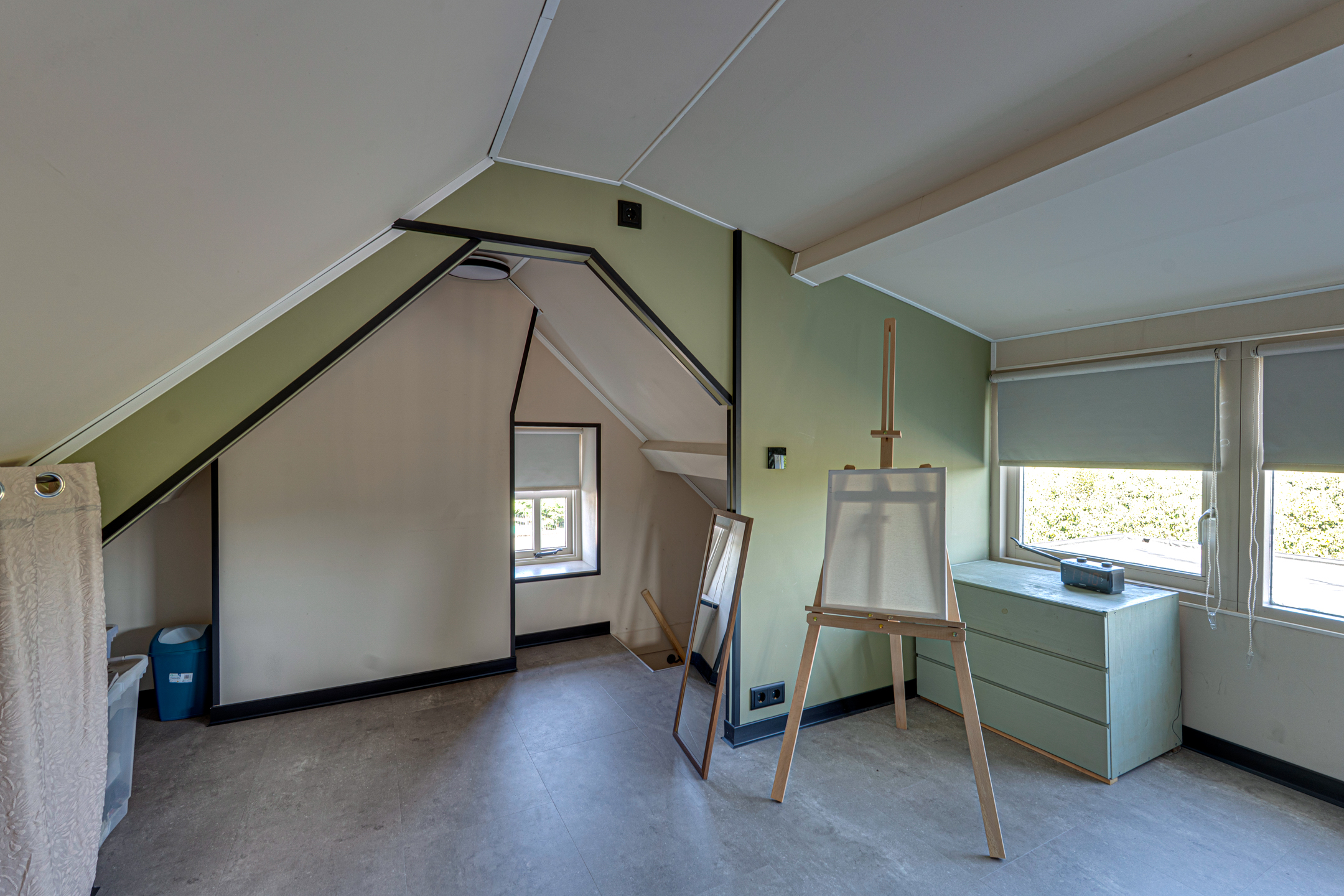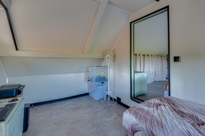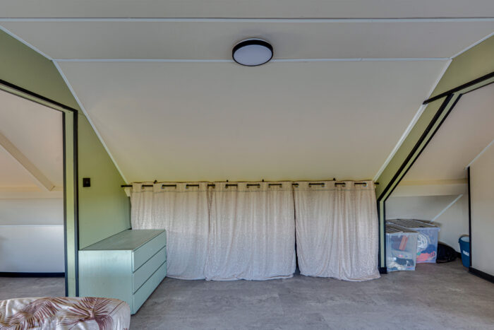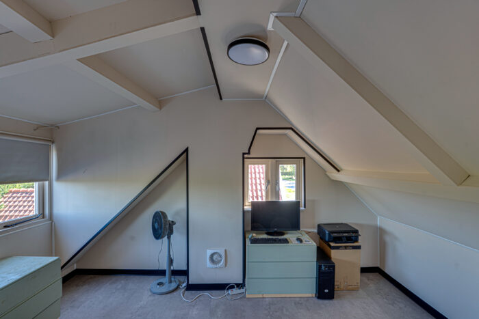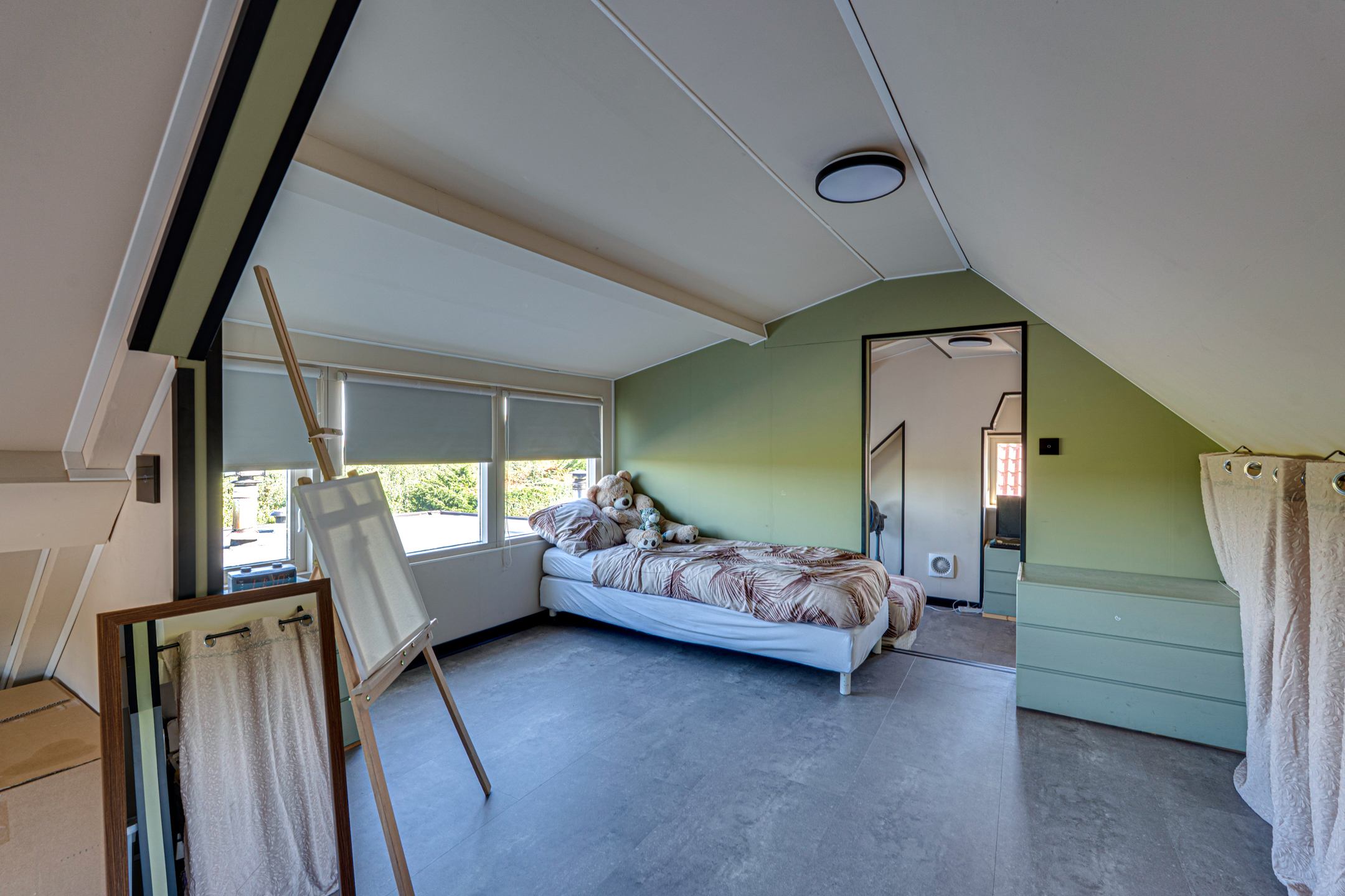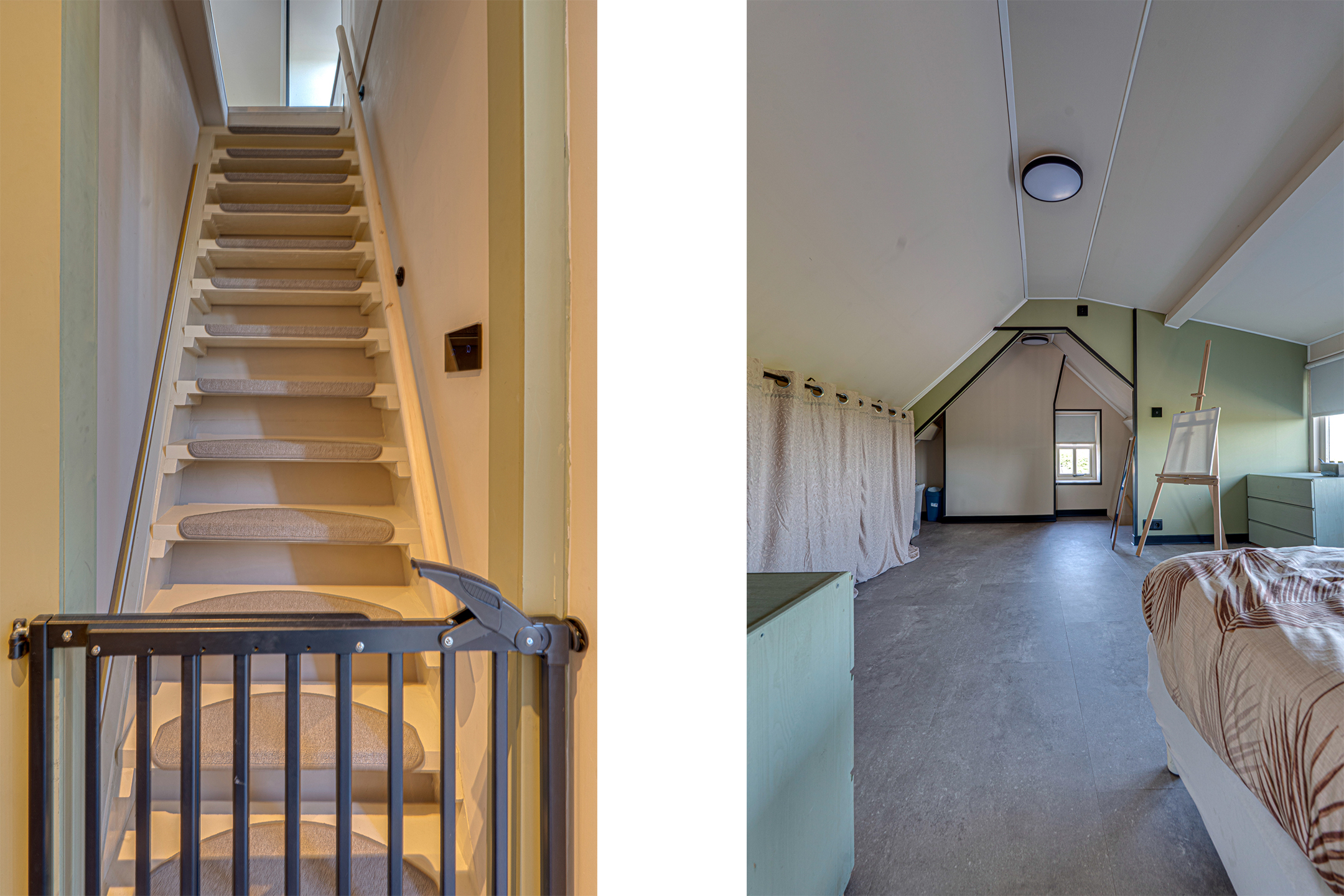 Vanuit de centrale hal kun je via de trapopgang de verdieping bereiken. Hier vind je nog twee slaapkamers, waardoor de woning in totaal over vier slaapkamers beschikt. De ruimte boven is licht en ruimtelijk dankzij een dakkapel over bijna de gehele breedte. De verdieping is nu verdeeld in twee kamers door een gipswand, maar kan desgewenst ook weer tot één grote kamer worden samengevoegd. Het achterste gedeelte ligt iets lager en is bereikbaar via een klein afstapje. Er is extra bergruimte in de dak schuinte aanwezig.