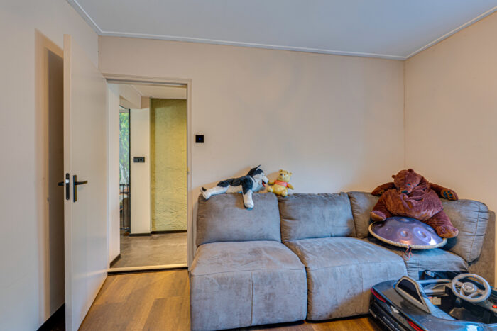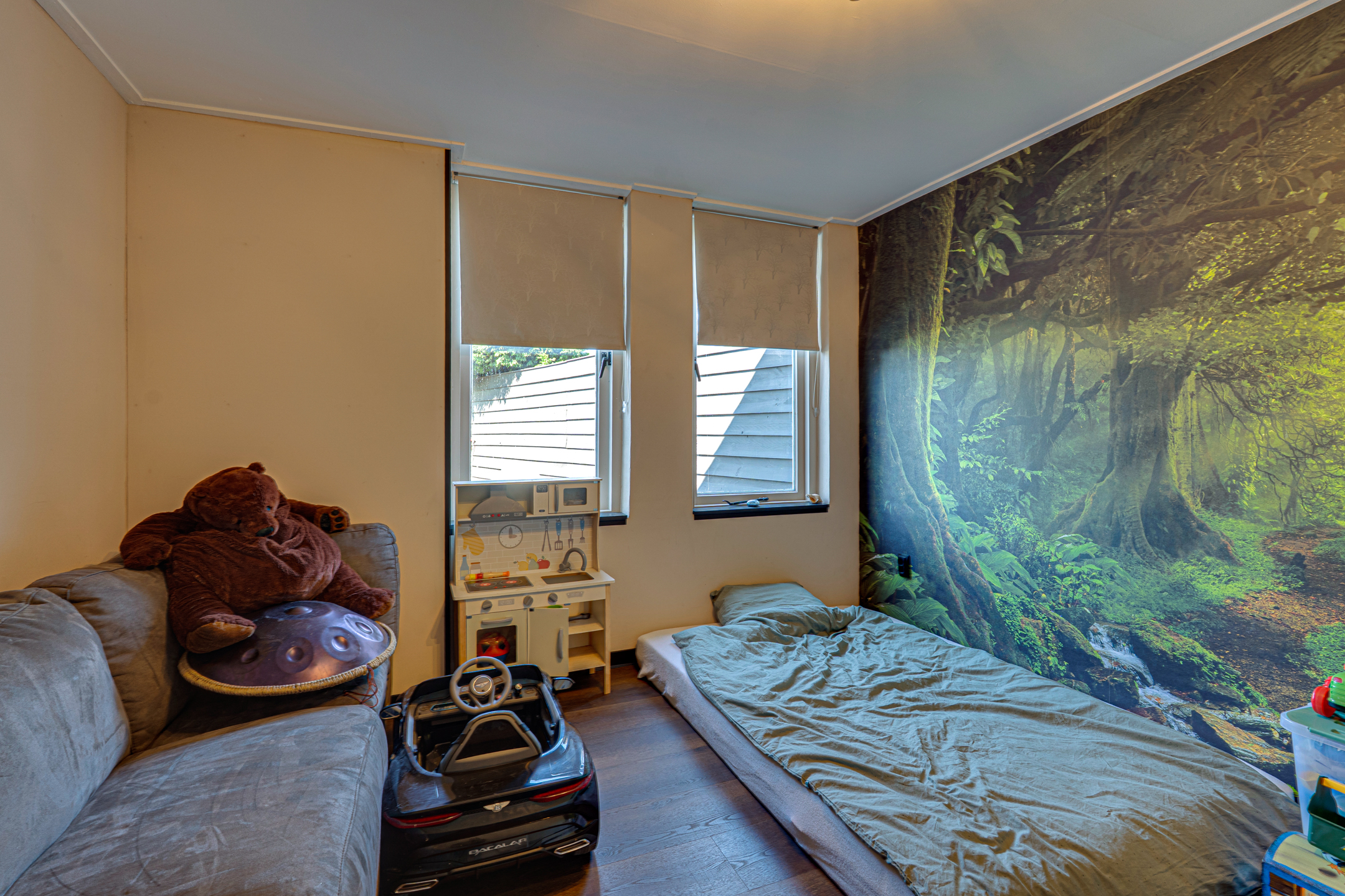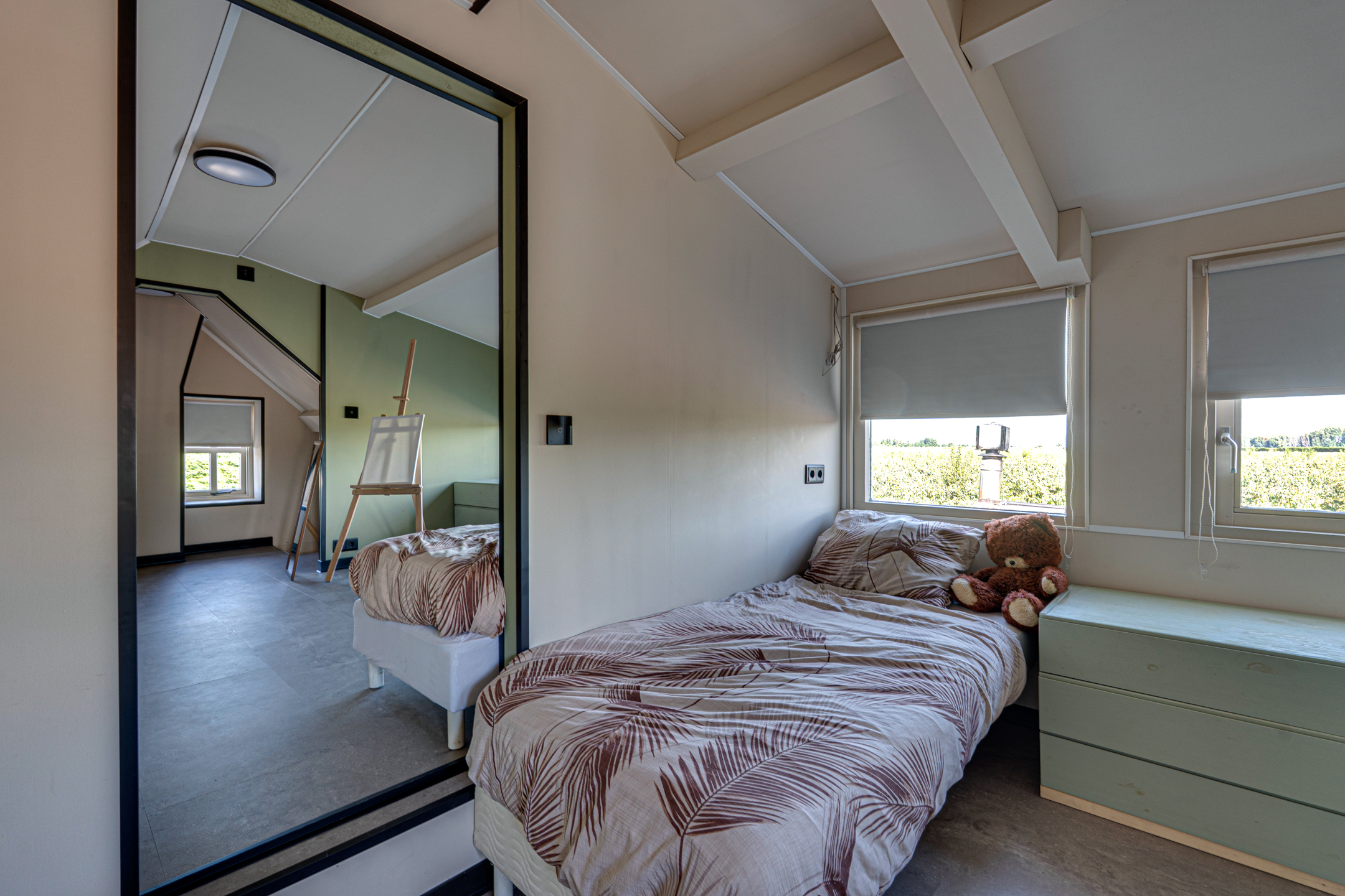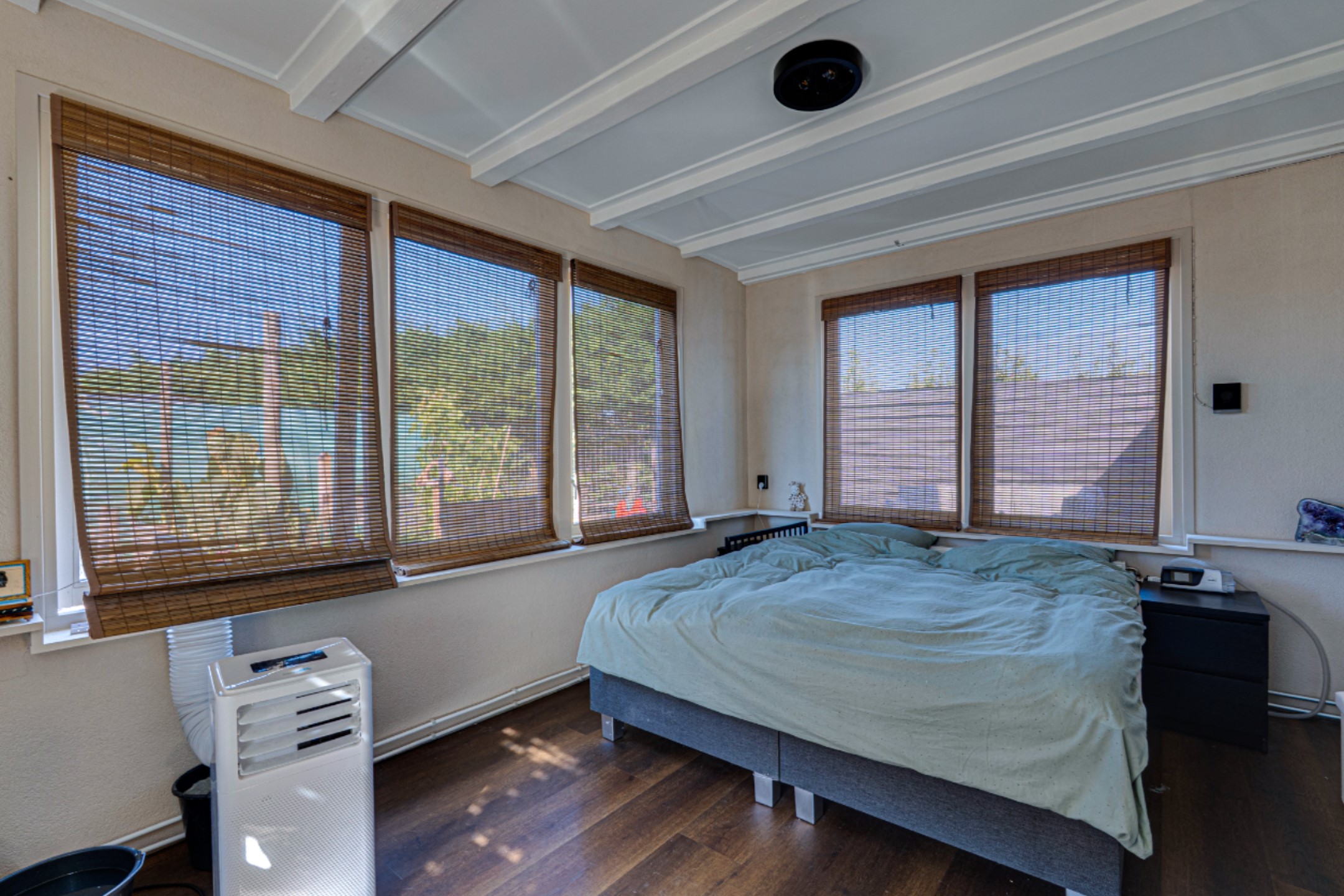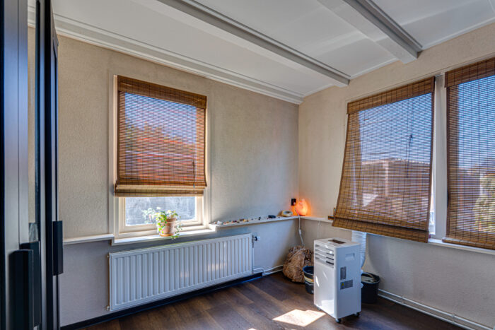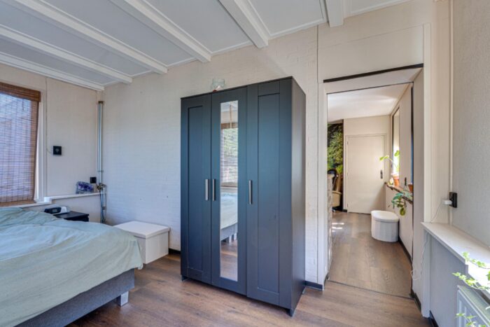 Vanuit de centrale hal kun je via de trapopgang de verdieping bereiken. Hier vind je nog twee slaapkamers, waardoor de woning in totaal over vier slaapkamers beschikt. De ruimte boven is licht en ruimtelijk dankzij een dakkapel over bijna de gehele breedte. De verdieping is nu verdeeld in twee kamers door een gipswand, maar kan desgewenst ook weer tot één grote kamer worden samengevoegd. Het achterste gedeelte ligt iets lager en is bereikbaar via een klein afstapje. Er is extra bergruimte in de dak schuinte aanwezig.