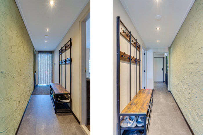 Op de ruime oprit kunnen met gemak twee auto’s worden geparkeerd. Via de voordeur kom je binnen in de hal. Hier vind je de meterkast, de garderobe en de toegang tot de woonkamer.