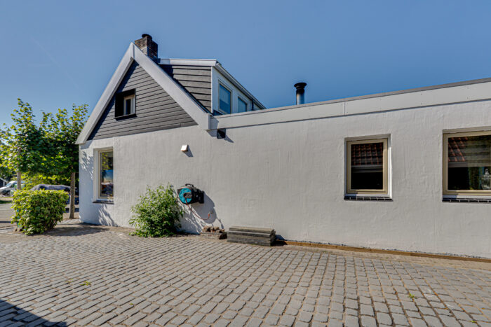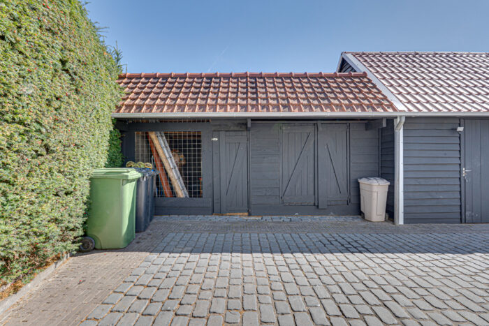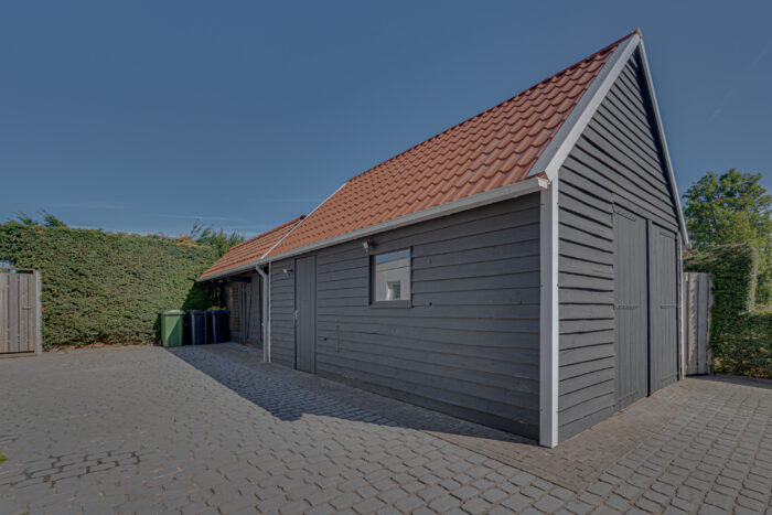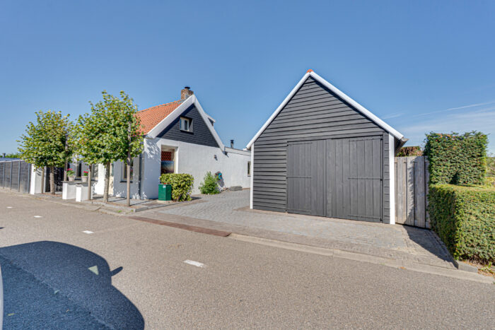 Naast de woning staat een vrijstaande garage. Deze beschikt over openslaande deuren aan de voorzijde en een extra deur aan de opritzijde. De garage is praktisch ingericht en voorzien van elektra, en tegelvloer en meerdere ramen die zorgen voor natuurlijk licht.