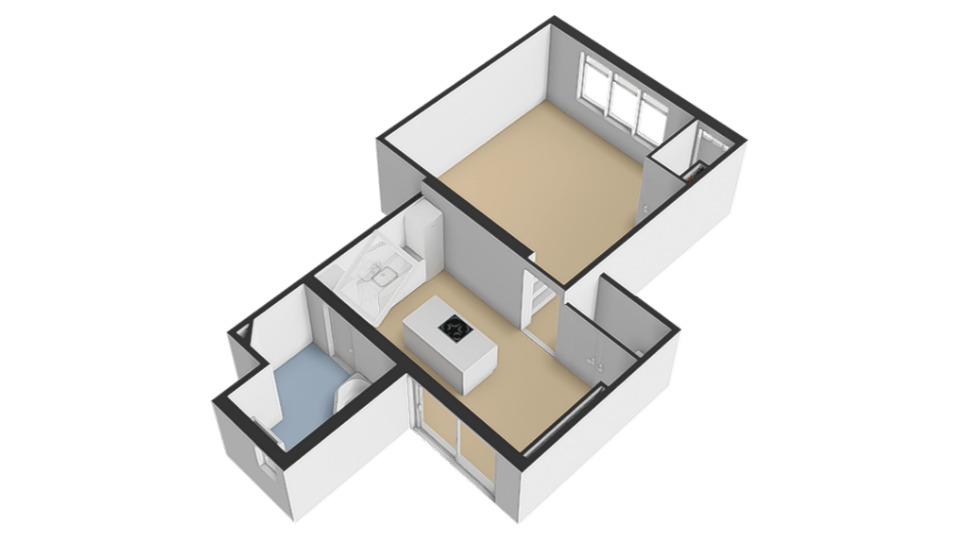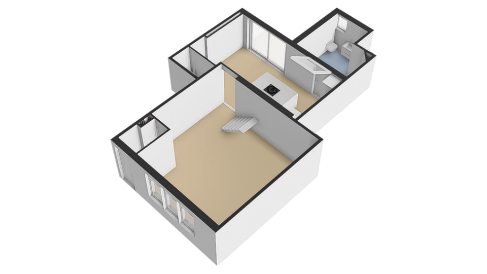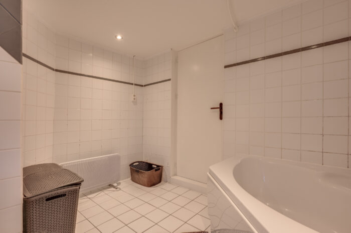 De badkamer is bereikbaar vanuit de keuken. Deze ruimte is volledig betegeld. De badkamer is praktisch ingericht en voorzien van alle gemakken. Je vindt hier een hoekbad met douche, een wastafel met meubel en spiegel, een toilet en spotjes in het plafond. Voor extra comfort is er elektrische verwarming. Dankzij het raam komt er natuurlijk licht binnen. Het raam zorgt bovendien voor natuurlijke ventilatie.