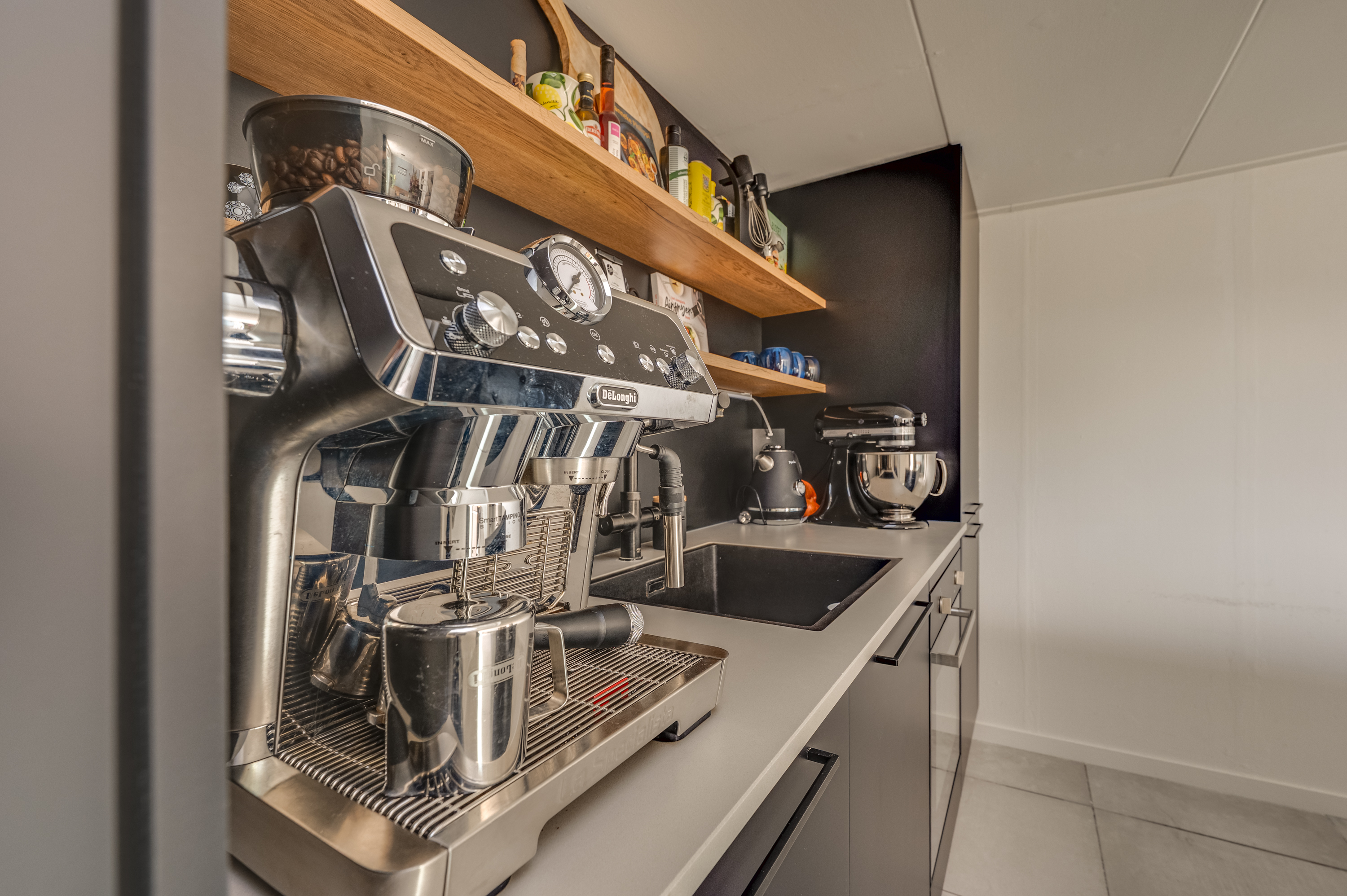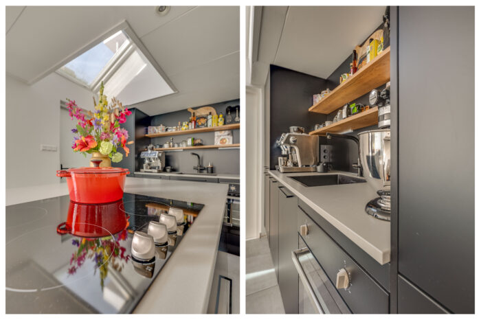De keuken sluit aan op de woonkamer en is tegelijk een fijne eetruimte. Deze moderne keuken is in 2022 geplaatst en heeft een handig kookeiland. Je vindt hier een 4-pits inductiekookplaat, Aquahot-kraan voor koud, warm, én kokend water, oven, koelvriescombinatie, vaatwasser en een stevig composiet werkblad. In het plafond zitten spotjes voor goede verlichting. Dankzij het dakraam is het ook overdag lekker licht. De tegelvloer uit de woonkamer loopt door in de keuken en is ook hier voorzien van vloerverwarming. Vanuit de keuken heb je toegang tot de wasruimte, de badkamer én via de schuifpui naar de tuin.