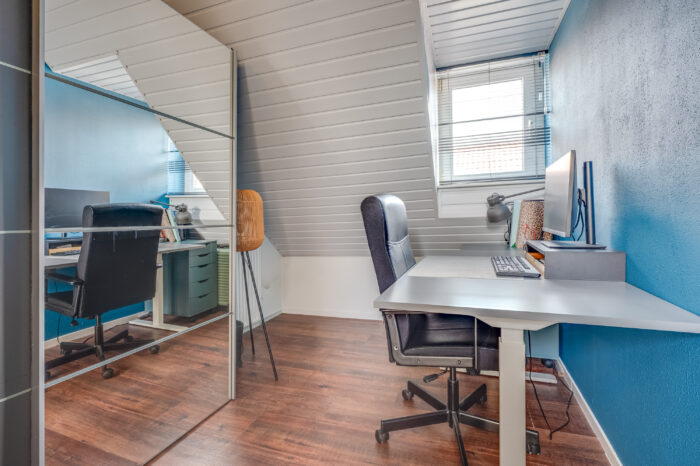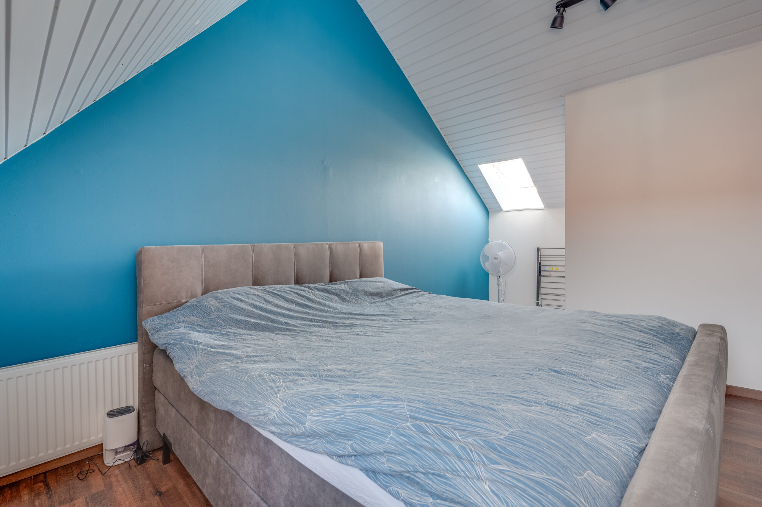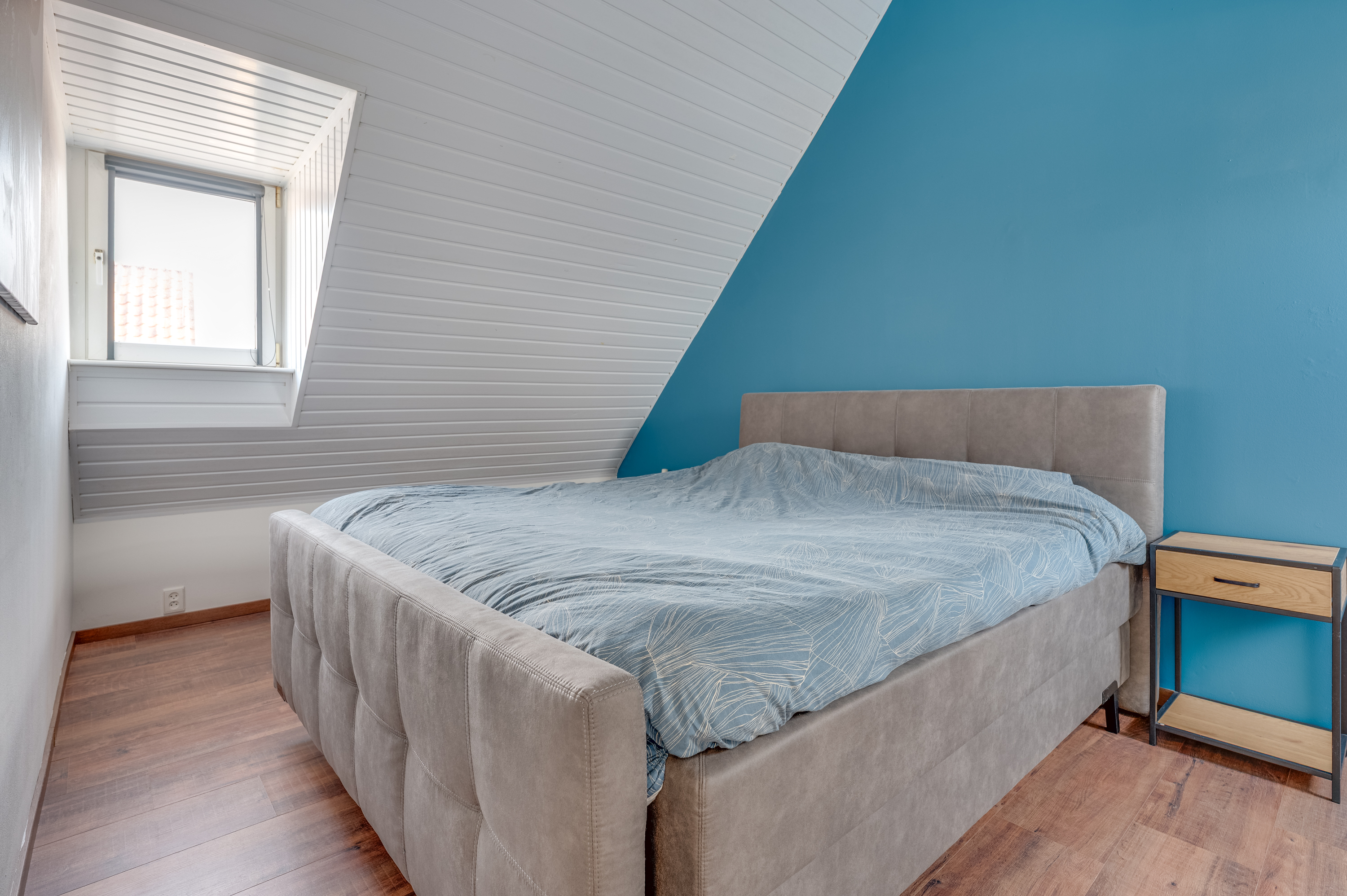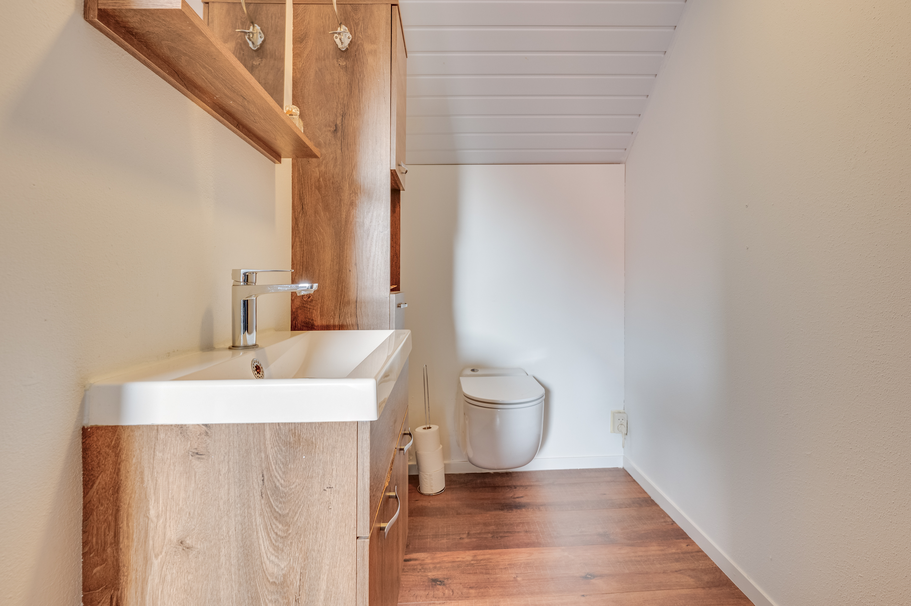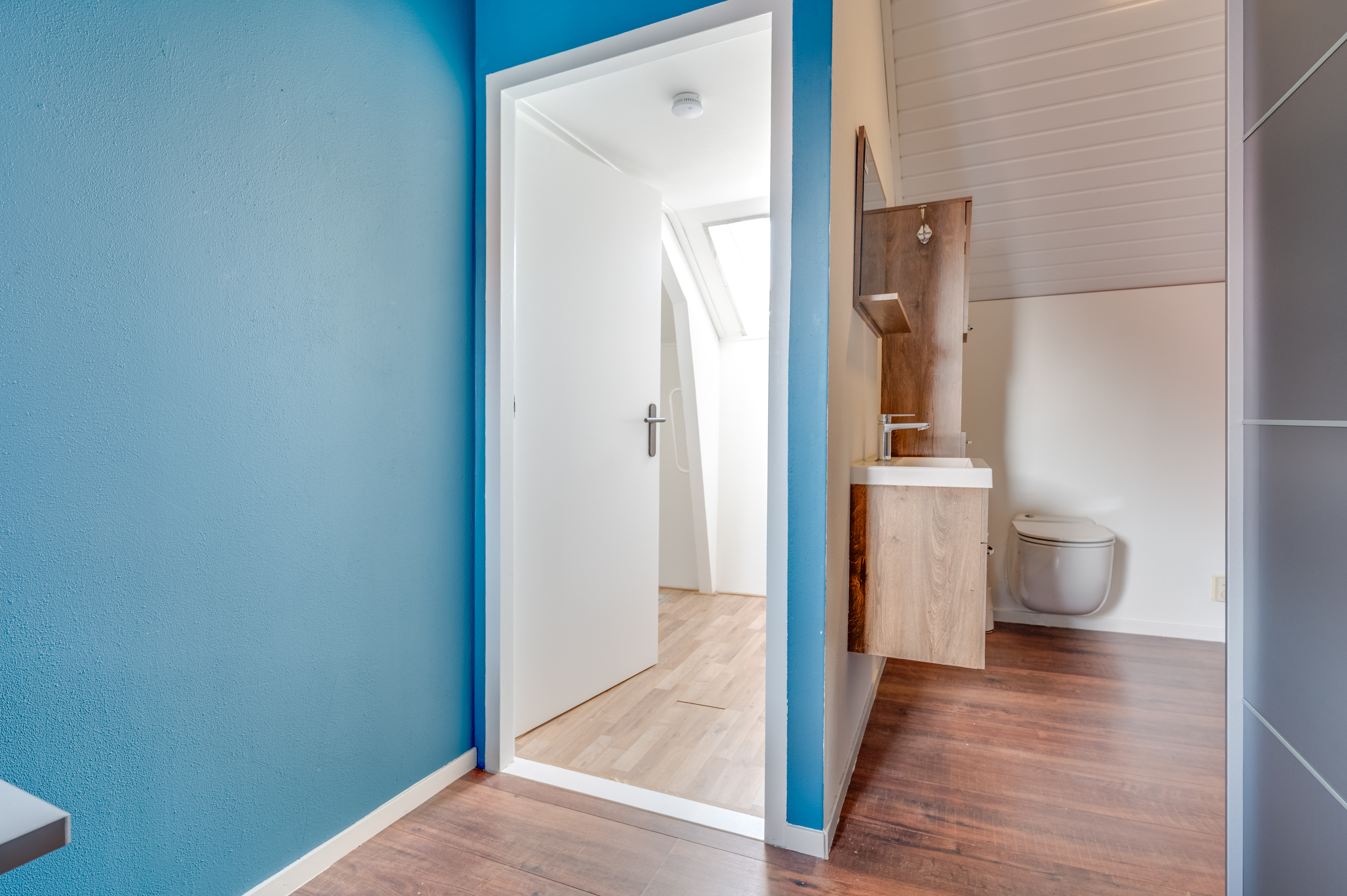 Via de trap in de woonkamer kom je op de eerste verdieping. Hier is een overloop met een dakraam, waardoor er prettig daglicht binnenkomt. Op deze verdieping zijn twee slaapkamers. Eén van de slaapkamers heeft een extra toilet en een wastafel, wat erg handig is. Beide kamers hebben een dakkapel, waardoor ze ruim en licht aanvoelen. De hele verdieping is voorzien van een nette laminaatvloer.