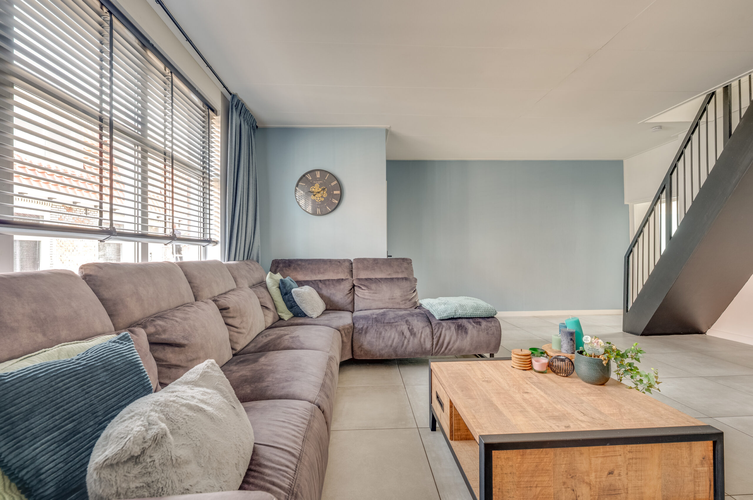 De woonkamer heeft een prettige, vierkante vorm en is daardoor eenvoudig en praktisch in te delen. Er is volop ruimte voor een gezellige zithoek. Door de ramen komt veel daglicht naar binnen. Achterin de kamer is de trap naar de eerste verdieping. De wanden en het plafond zijn strak afgewerkt en de moderne tegelvloer is voorzien van vloerverwarming.